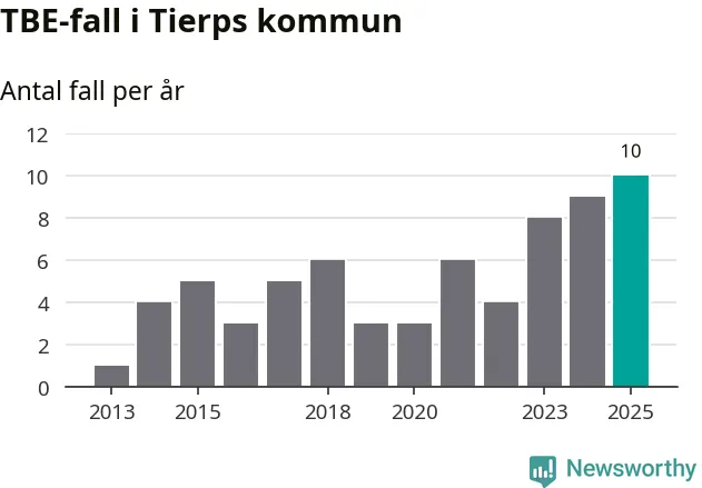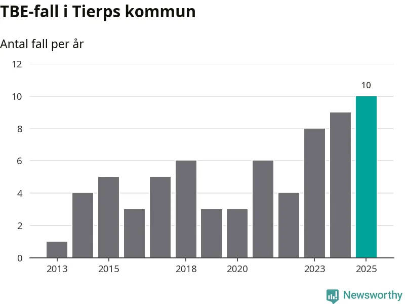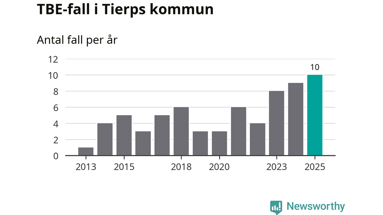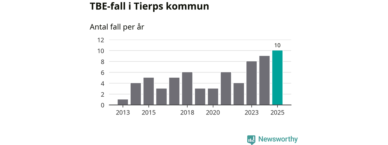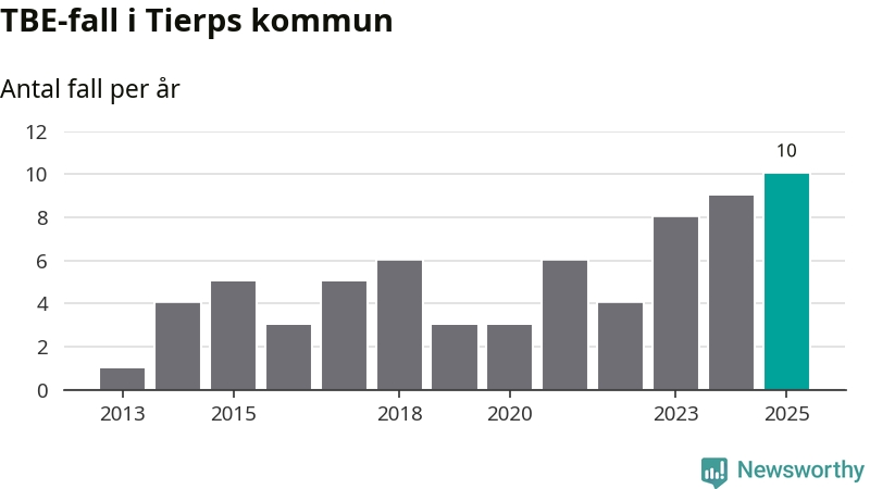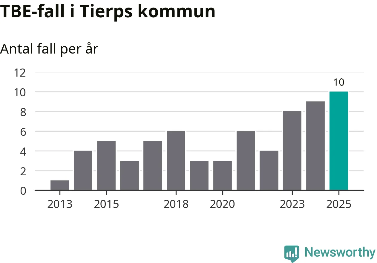 I Tierps kommun rapporterades totalt tio smittfall. Det är ett fler än året innan, och totalt sett tredje året i rad som antalet TBE-fall ökar i kommunen.