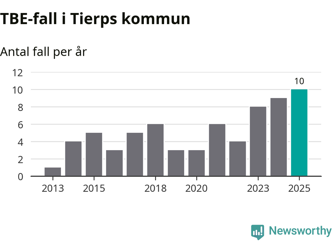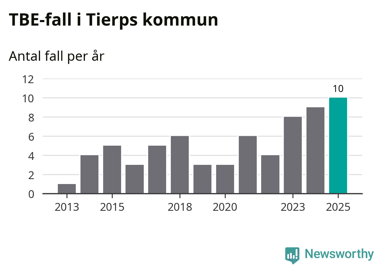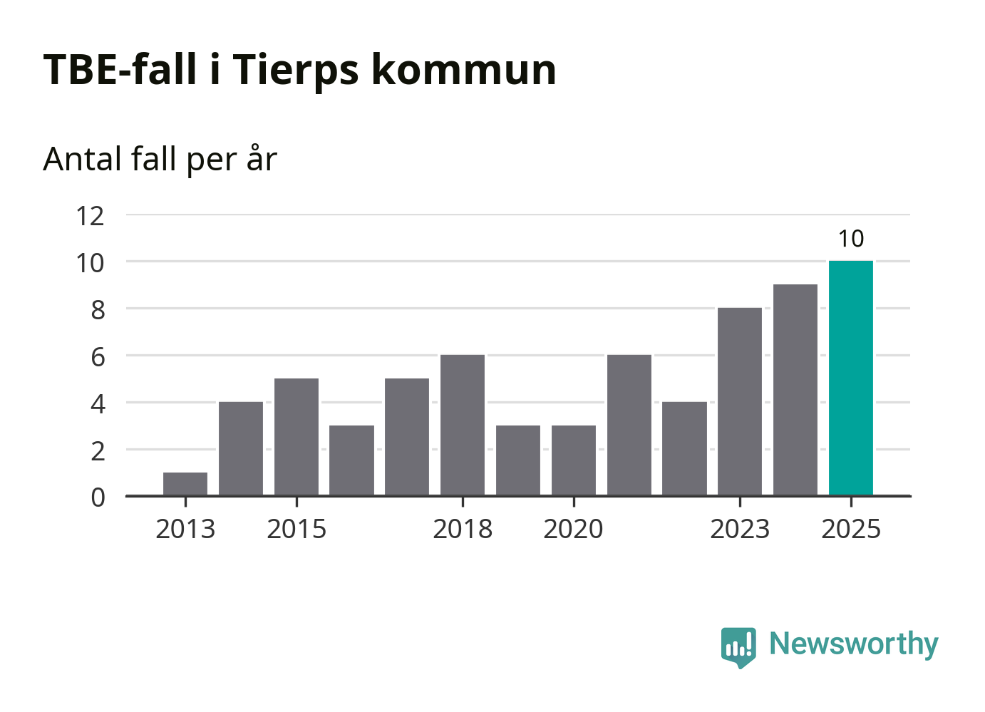 I Tierps kommun rapporterades totalt tio smittfall. Det är ett fler än året innan, och totalt sett tredje året i rad som antalet TBE-fall ökar i kommunen.
