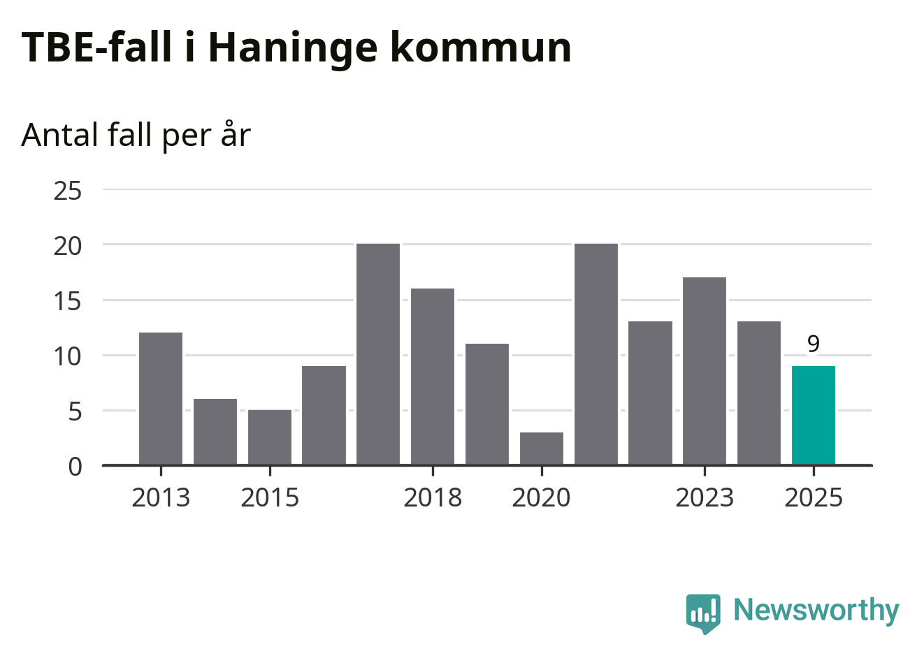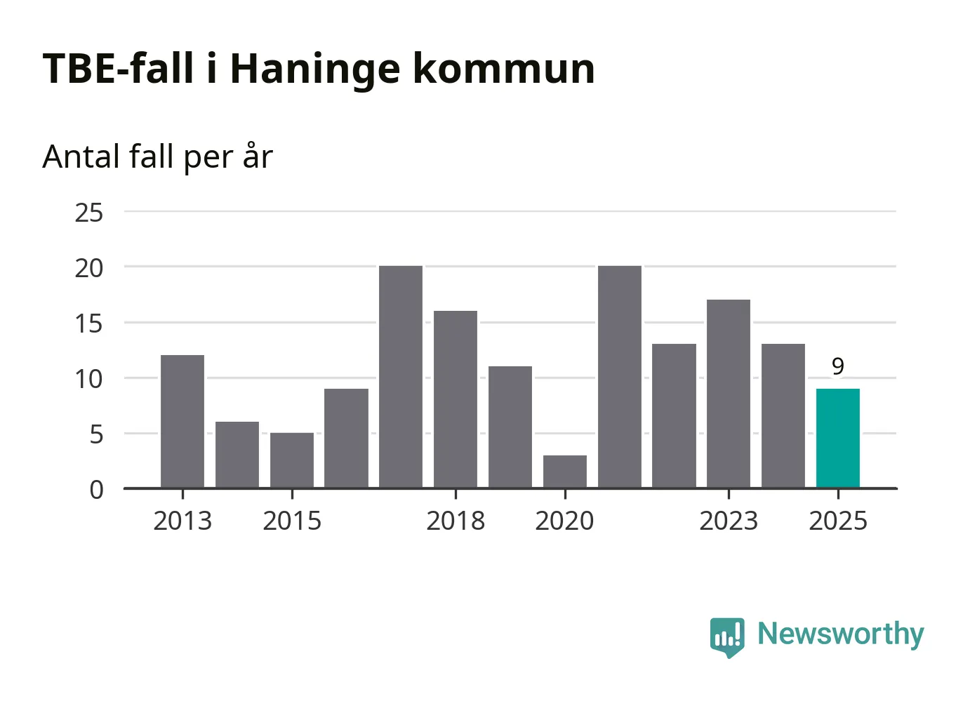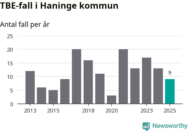 Den långsiktiga trenden är däremot tydlig. TBE-fallen blir allt fler i Sverige. Sett över tid har antalet anmälda fall i landet som helhet ökat med drygt sex procent per år sedan 2013. Totalt motsvarar det en ökning på 141 procent om vi jämför 2013 med 2025 års siffror.