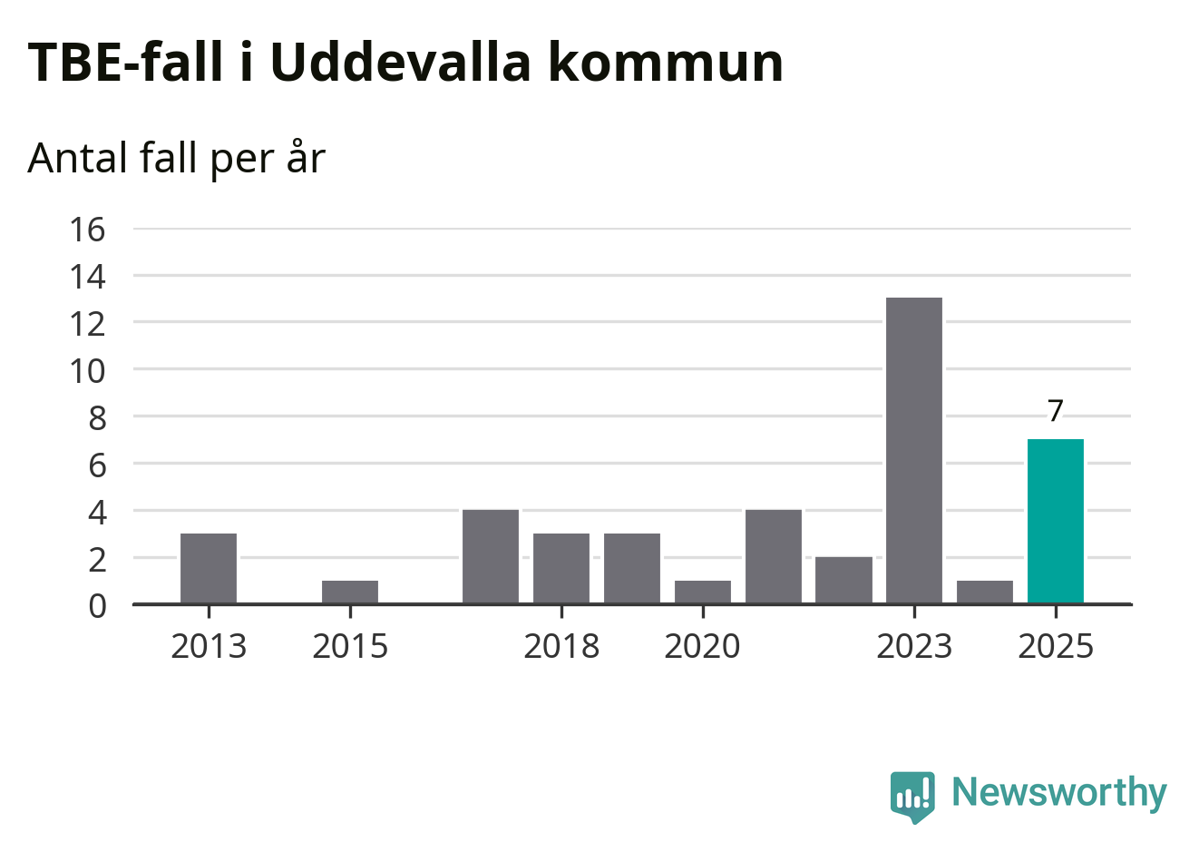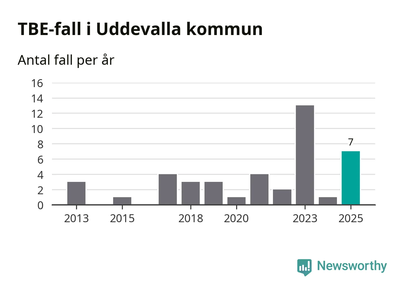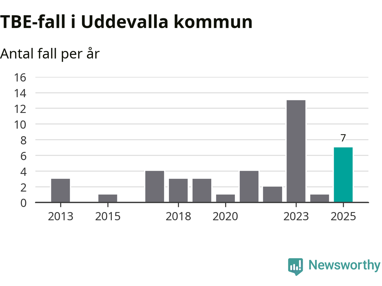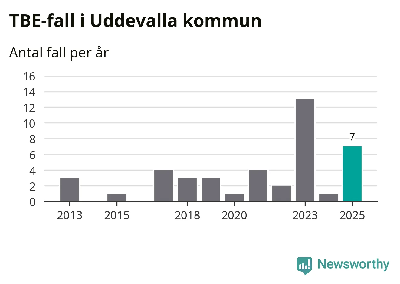 I Uddevalla kommun rapporterades totalt sju smittfall. Det är en ökning sedan året innan då sjukdomssiffran låg på ett rapporterade fall.