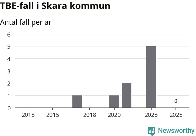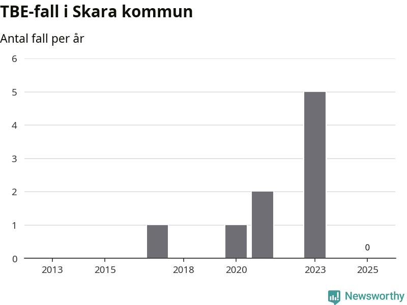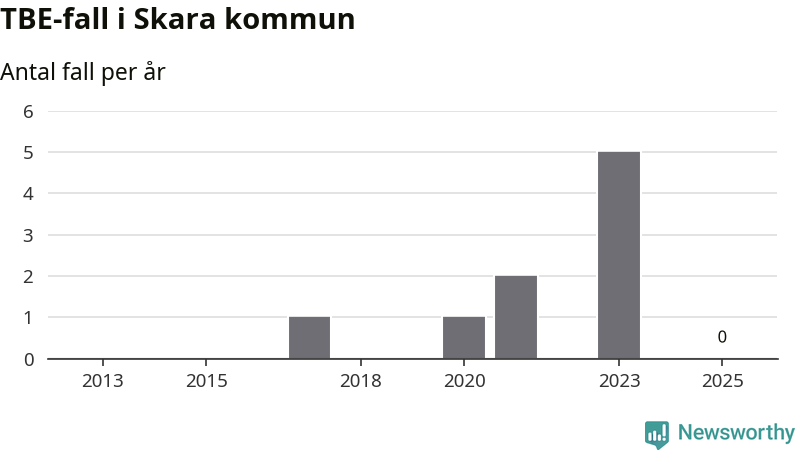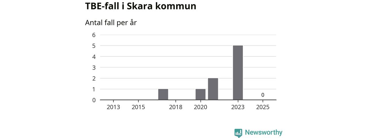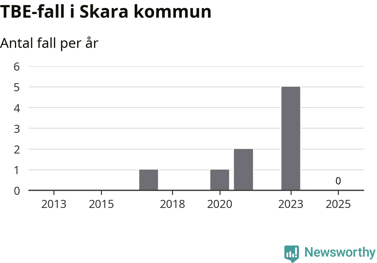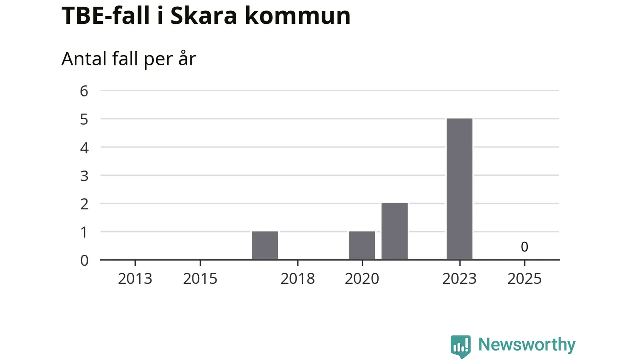 Inget TBE-fall rapporterades i Skara kommun under 2025. Inga TBE-fall har rapporterats i kommunen sedan 2023.