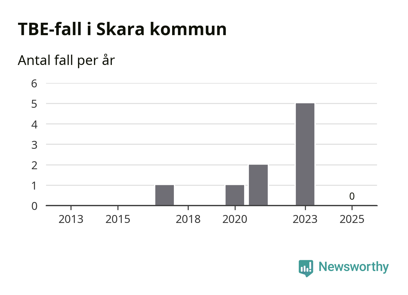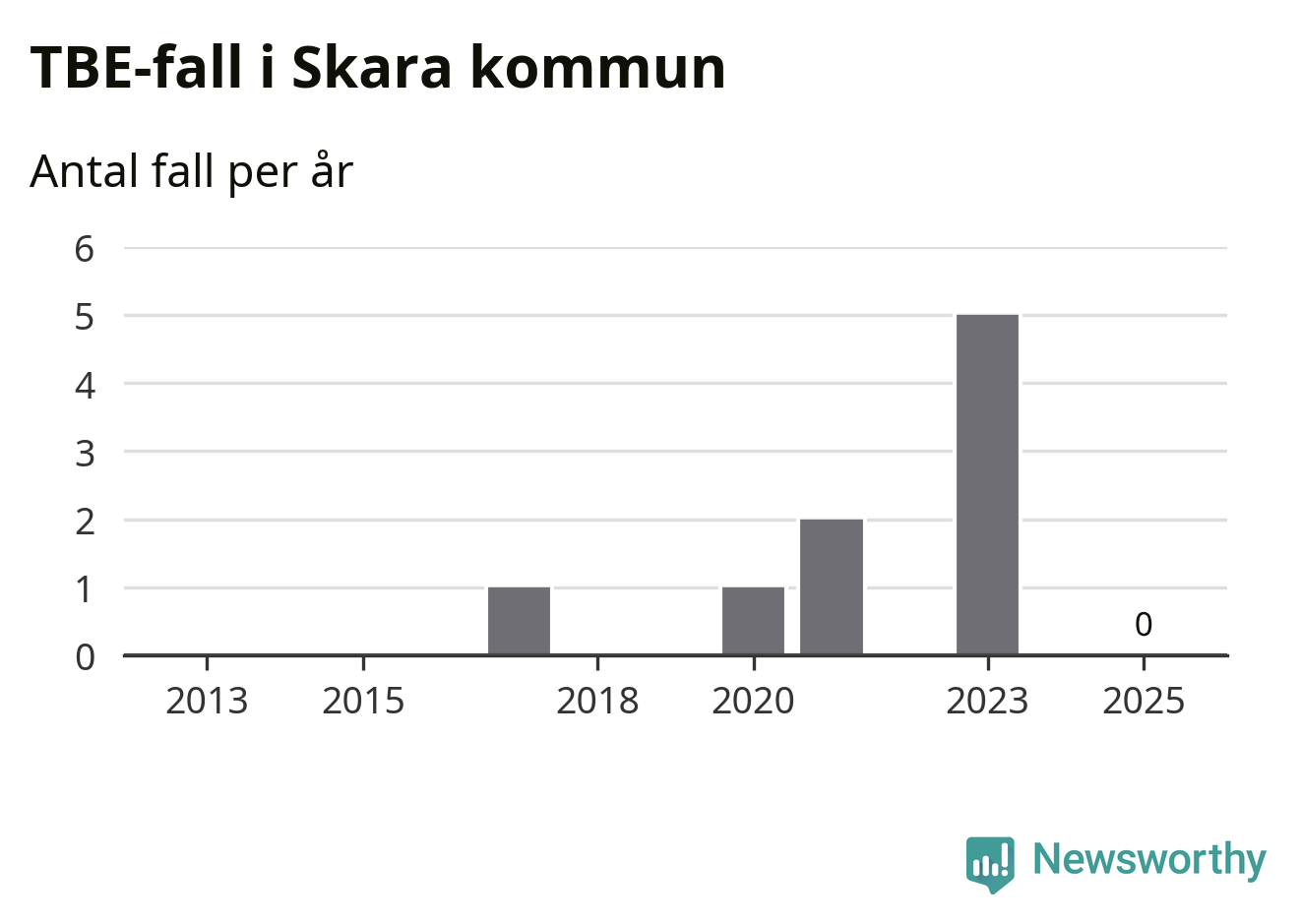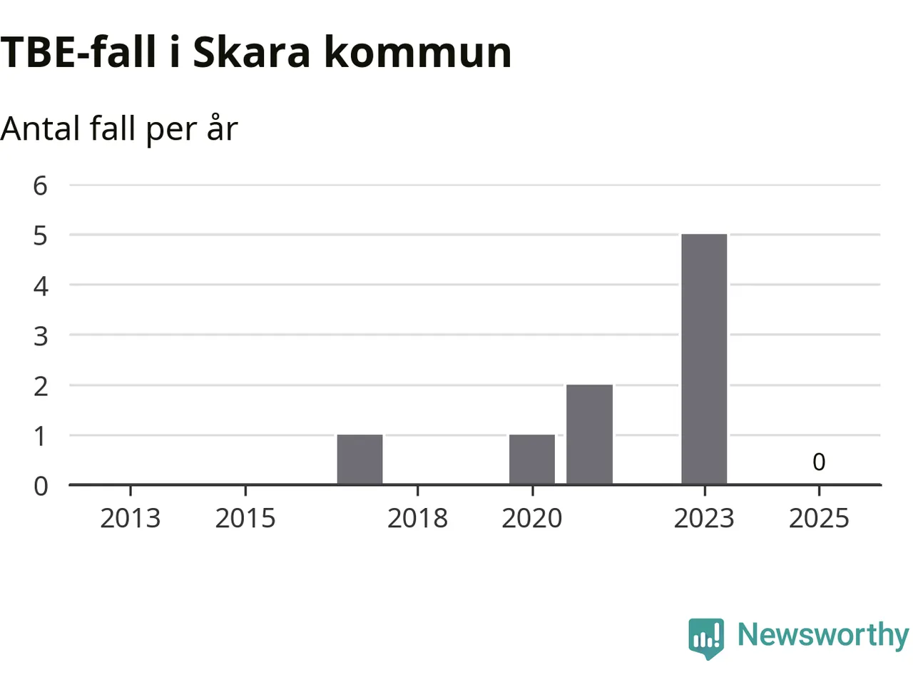 Inget TBE-fall rapporterades i Skara kommun under 2025. Inga TBE-fall har rapporterats i kommunen sedan 2023.