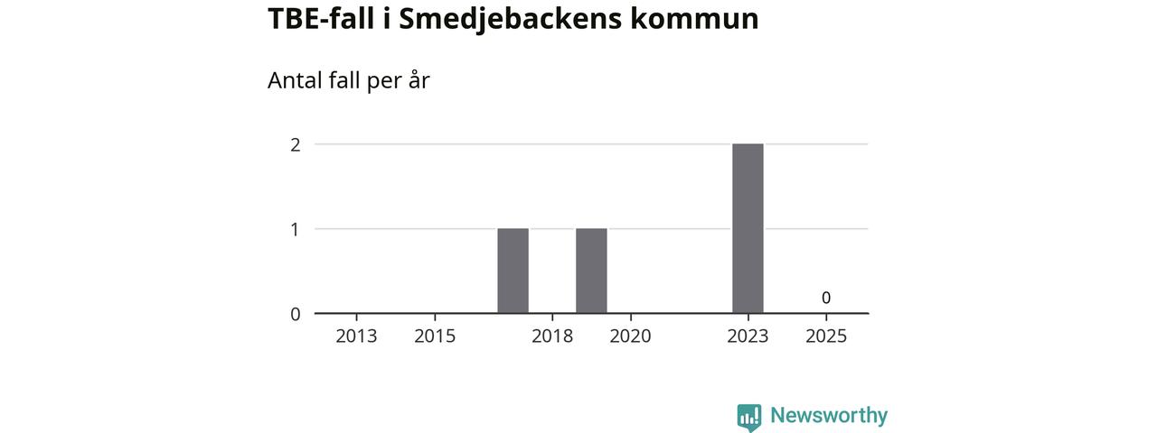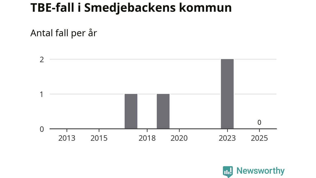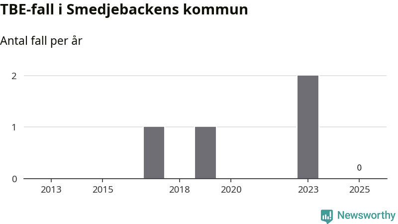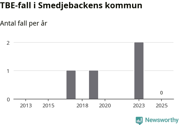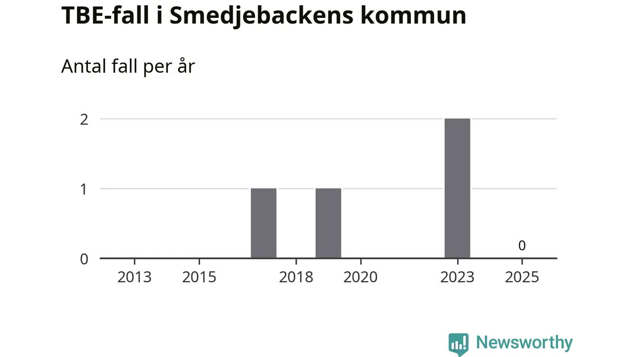 Inget TBE-fall rapporterades i Smedjebackens kommun under 2025. Inga TBE-fall har rapporterats i kommunen sedan 2023.