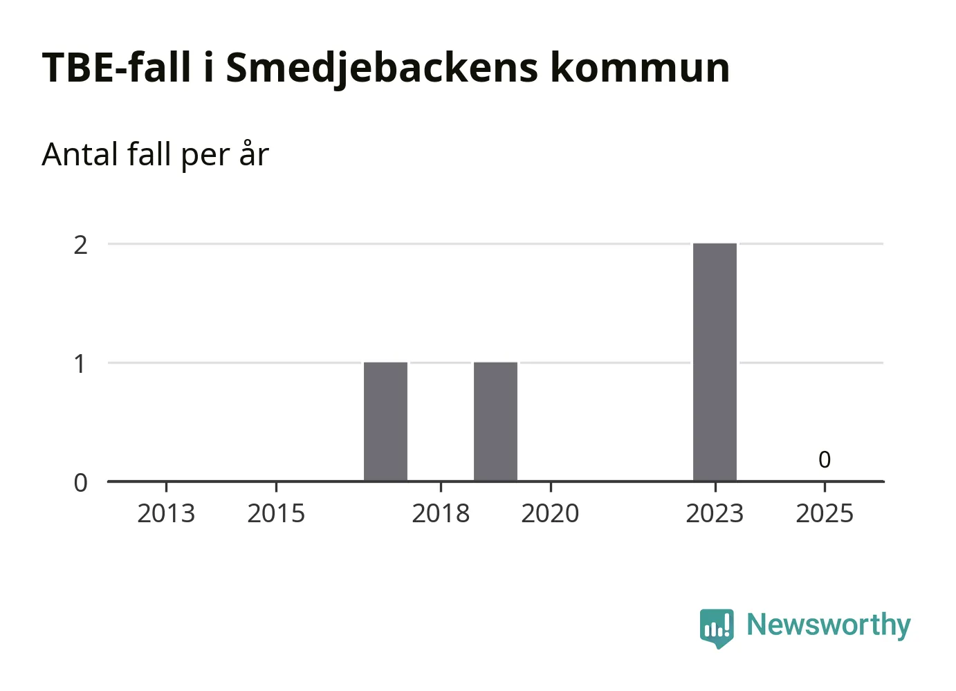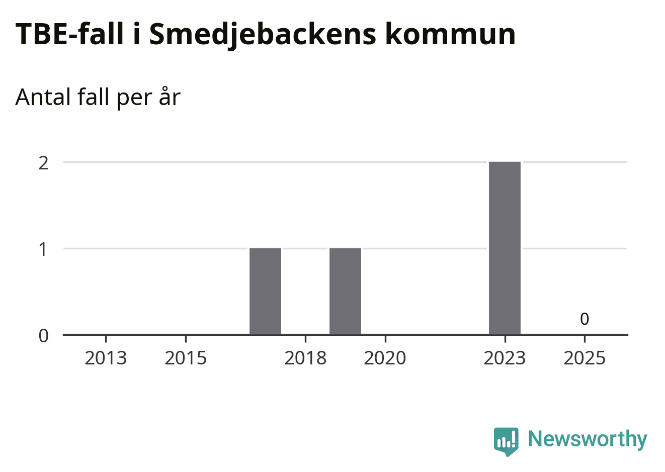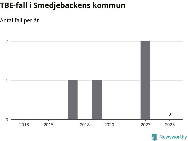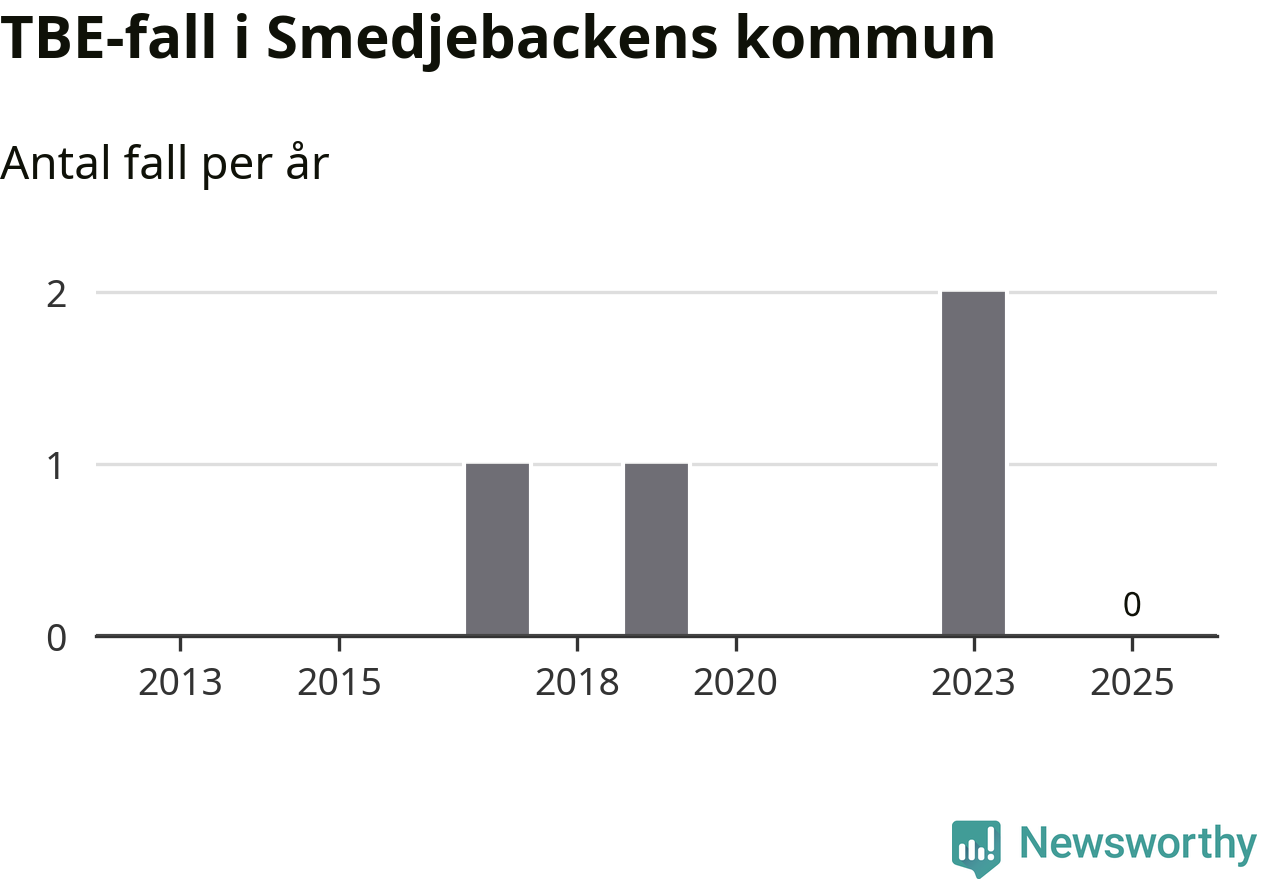 Inget TBE-fall rapporterades i Smedjebackens kommun under 2025. Inga TBE-fall har rapporterats i kommunen sedan 2023.
