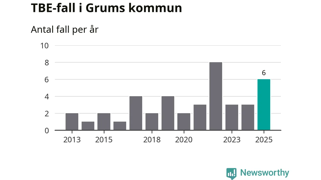 Den långsiktiga trenden är däremot tydlig. TBE-fallen blir allt fler i Sverige. Sett över tid har antalet anmälda fall i landet som helhet ökat med drygt sex procent per år sedan 2013. Totalt motsvarar det en ökning på 141 procent om vi jämför 2013 med 2025 års siffror.