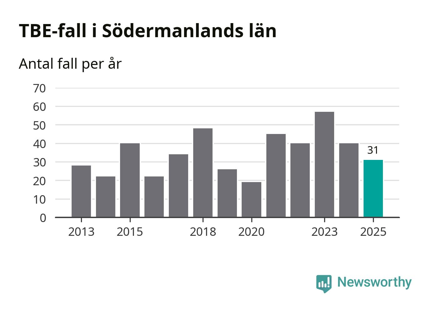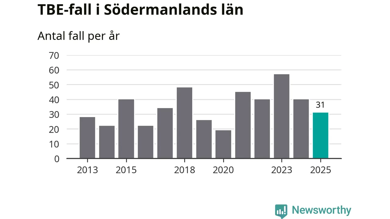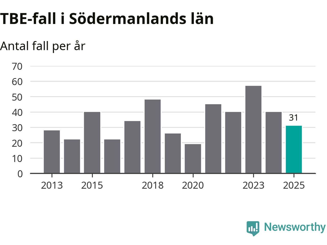 Den långsiktiga trenden är däremot tydlig. TBE-fallen blir allt fler i Sverige. Sett över tid har antalet anmälda fall i landet som helhet ökat med drygt sex procent per år sedan 2013. Totalt motsvarar det en ökning på 141 procent om vi jämför 2013 med 2025 års siffror.