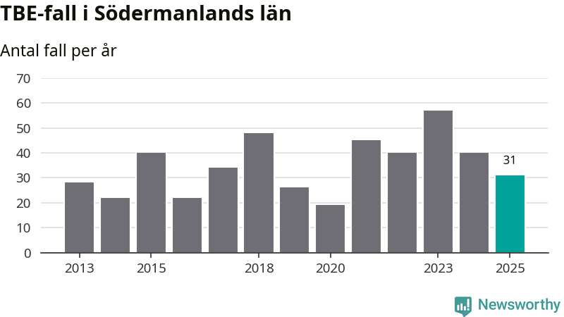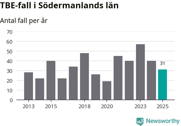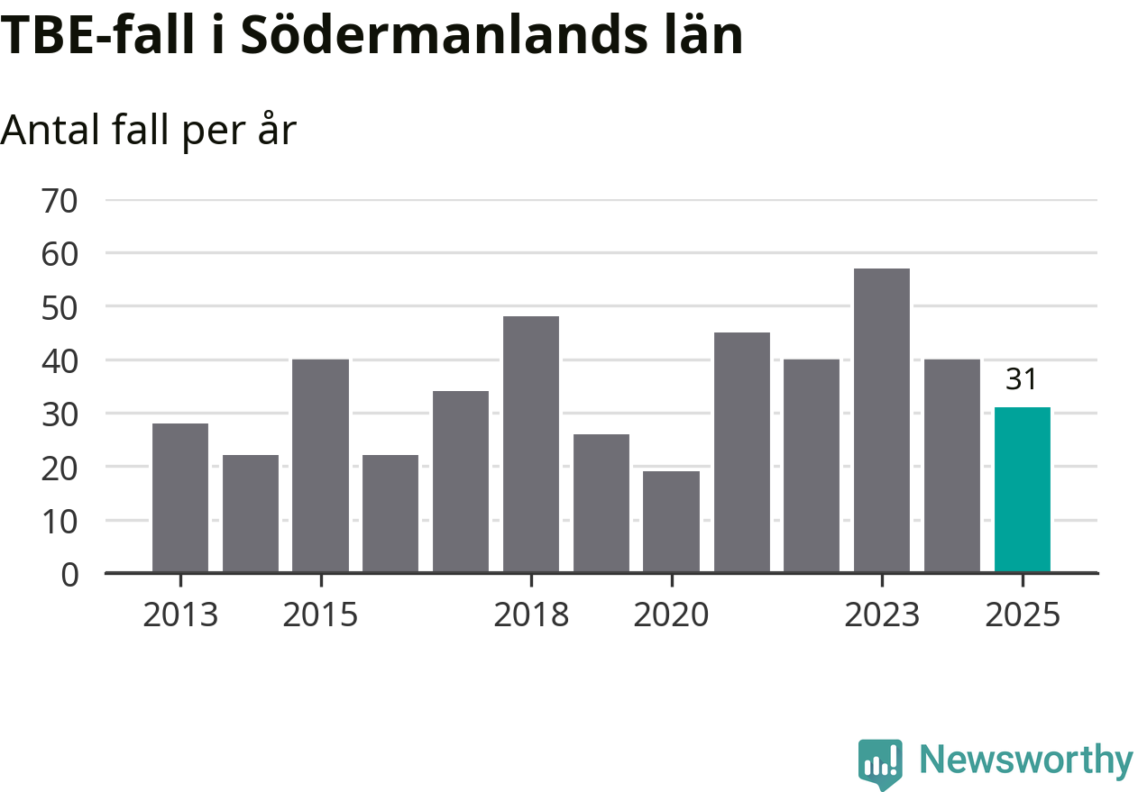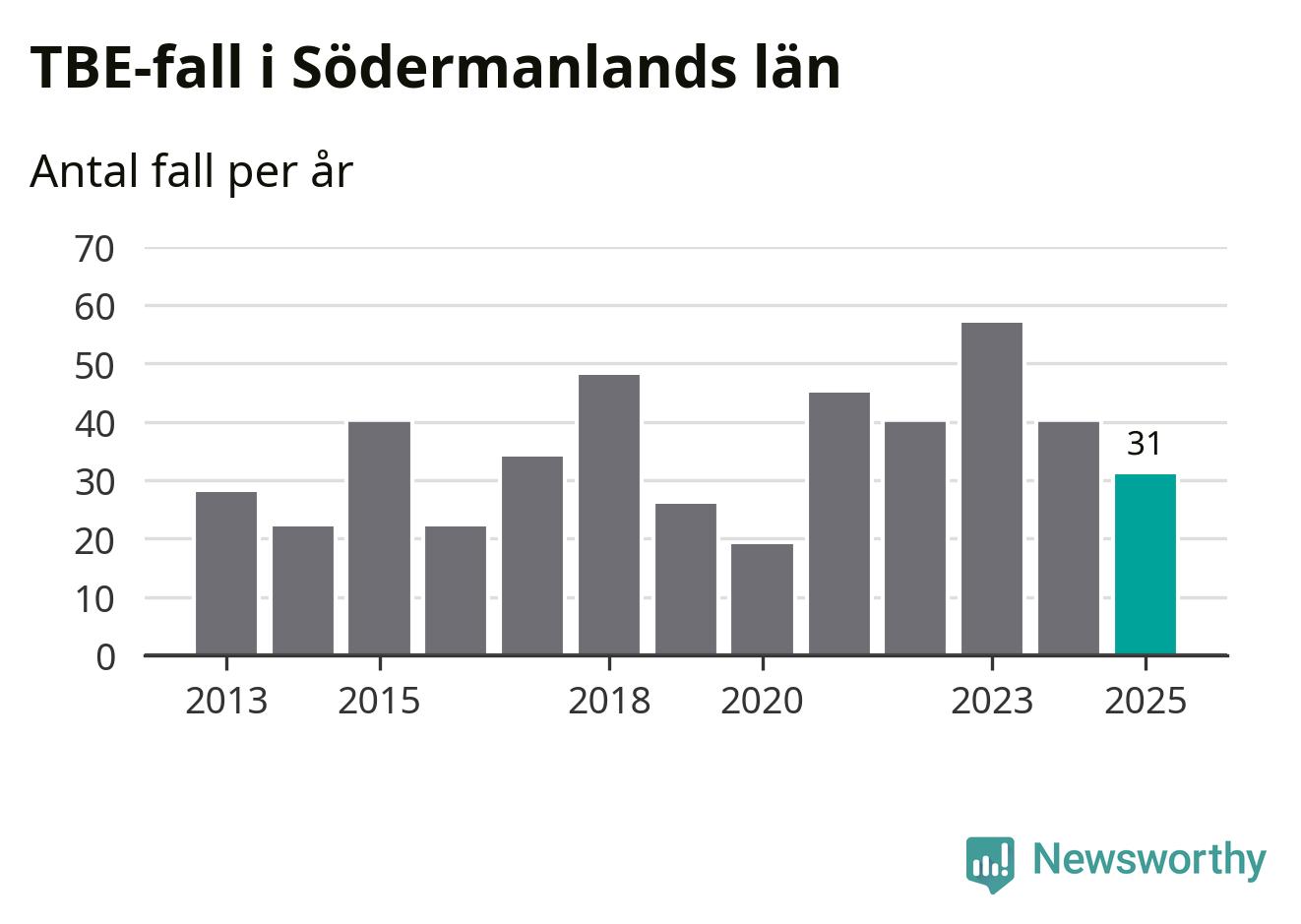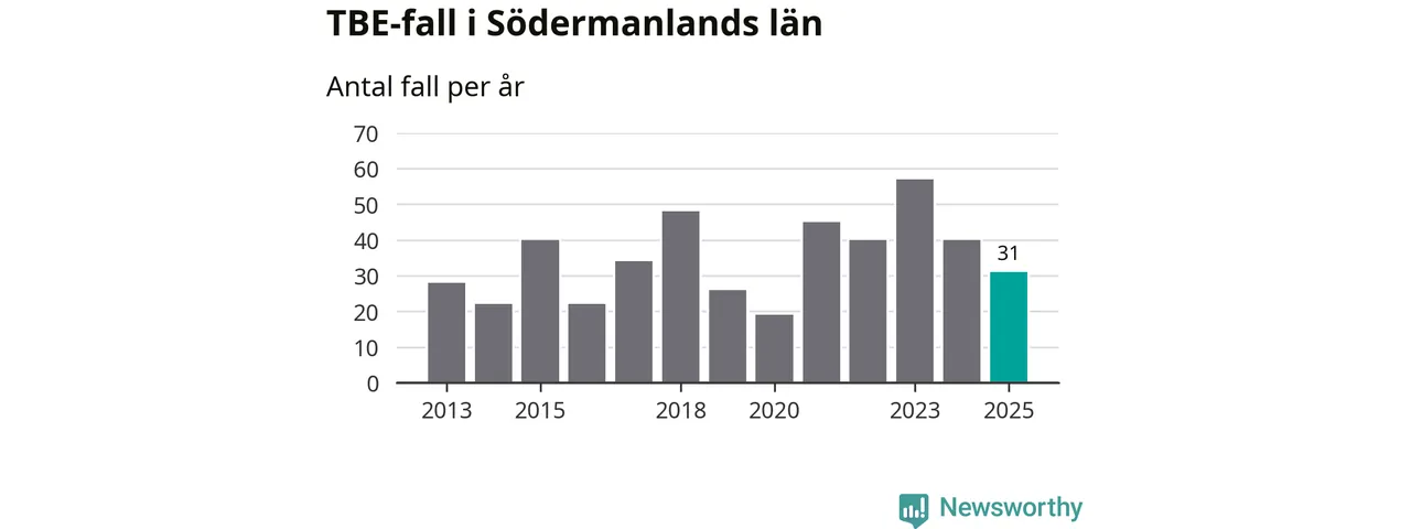 Den långsiktiga trenden är däremot tydlig. TBE-fallen blir allt fler i Sverige. Sett över tid har antalet anmälda fall i landet som helhet ökat med drygt sex procent per år sedan 2013. Totalt motsvarar det en ökning på 141 procent om vi jämför 2013 med 2025 års siffror.