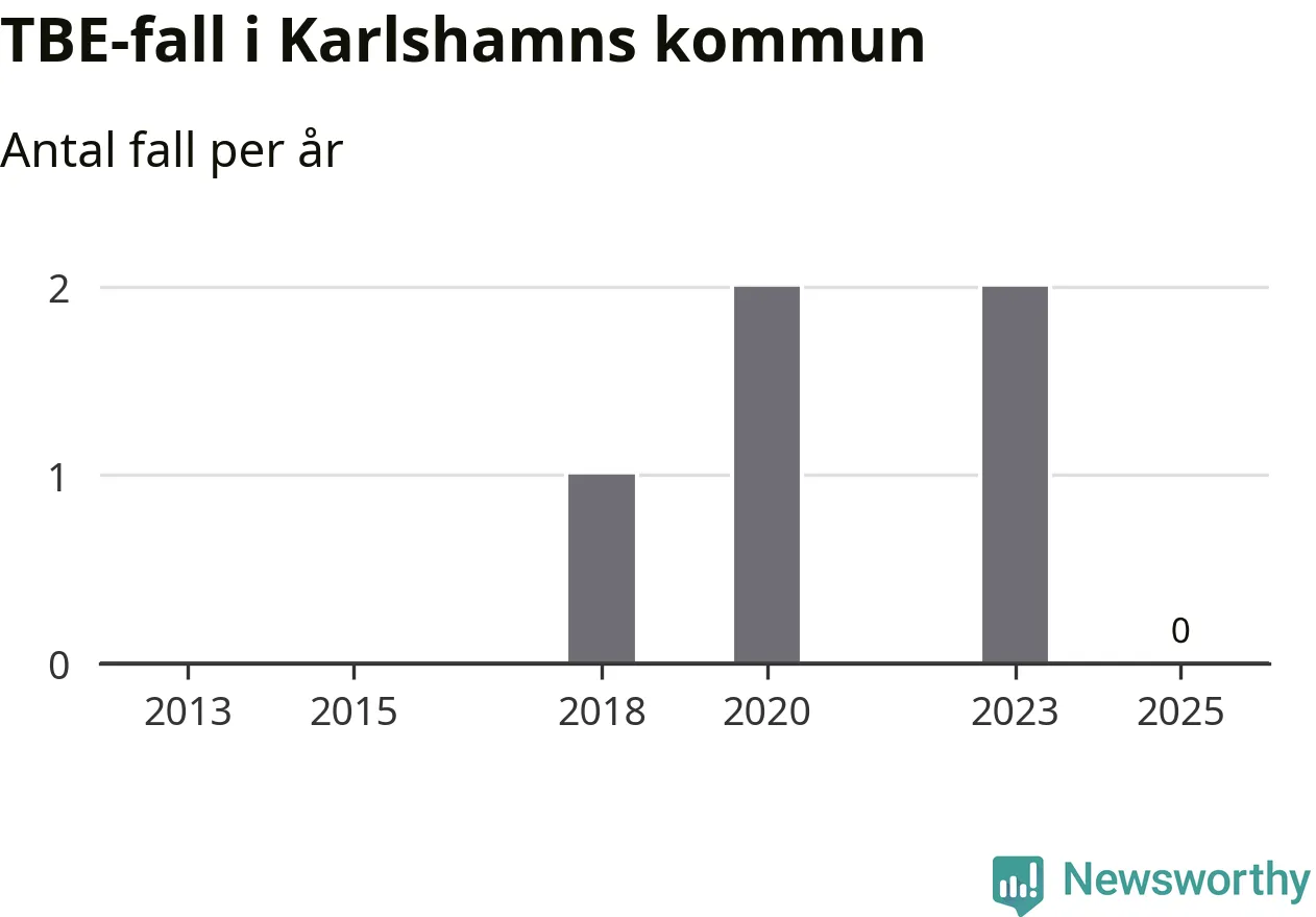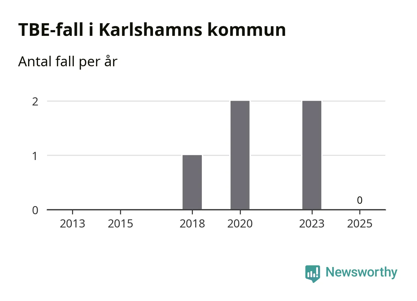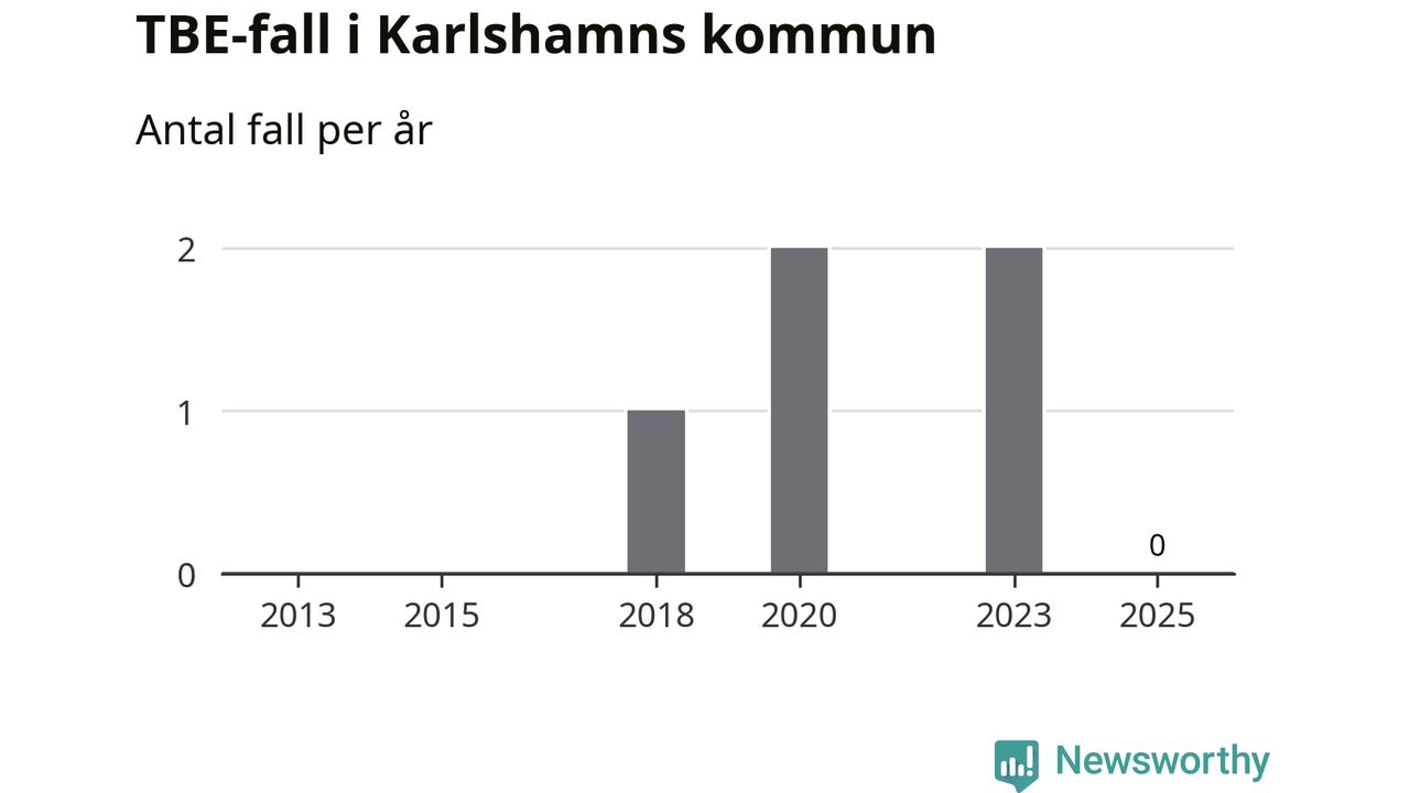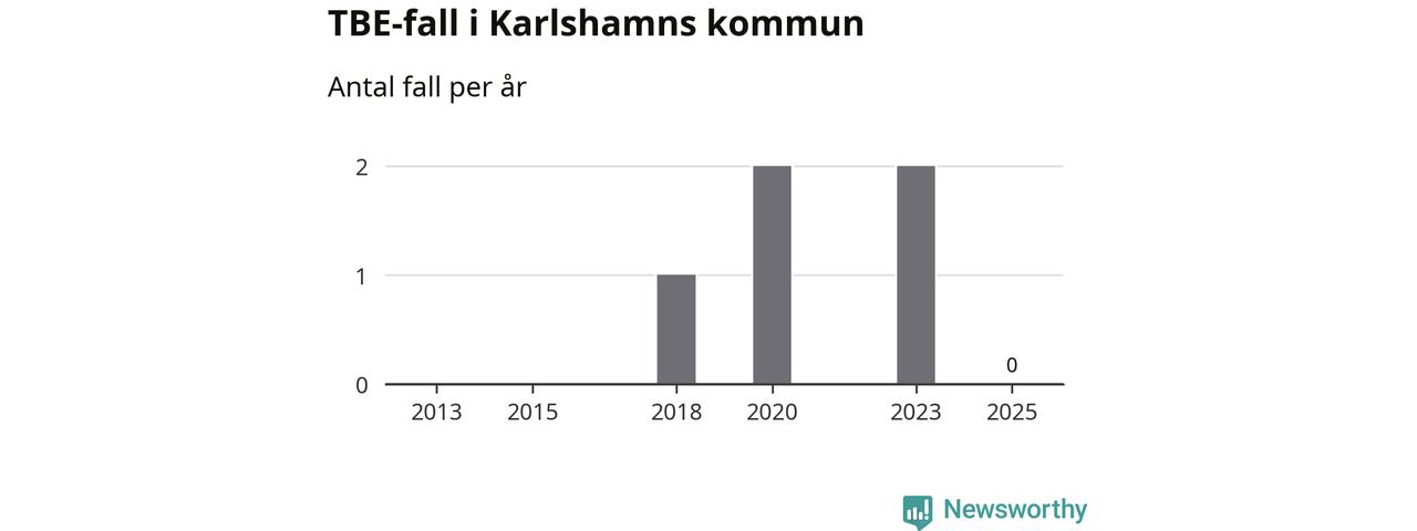 Inget TBE-fall rapporterades i Karlshamns kommun under 2025. Inga TBE-fall har rapporterats i kommunen sedan 2023.
