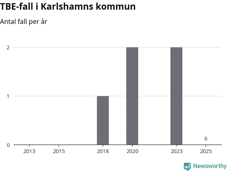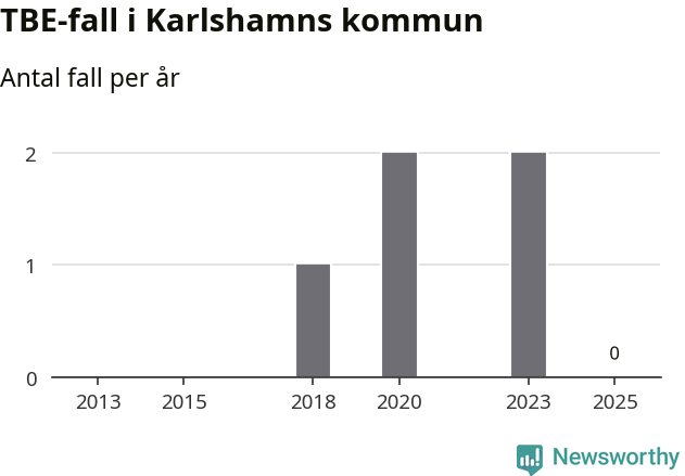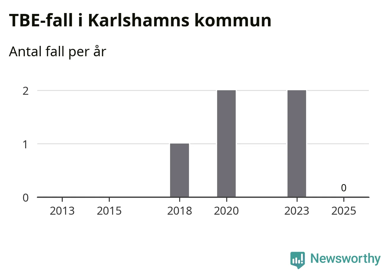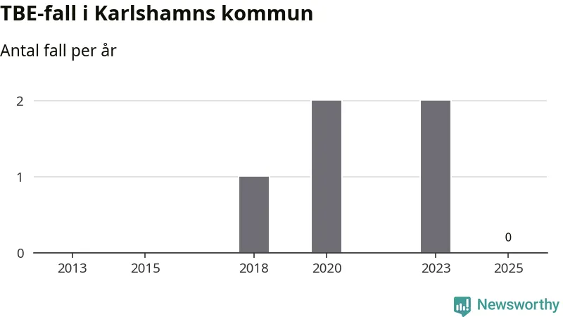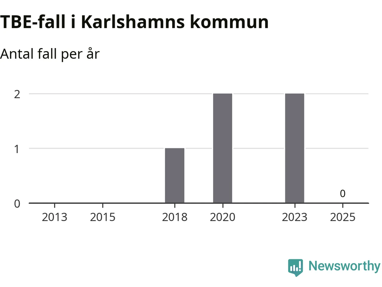 Inget TBE-fall rapporterades i Karlshamns kommun under 2025. Inga TBE-fall har rapporterats i kommunen sedan 2023.