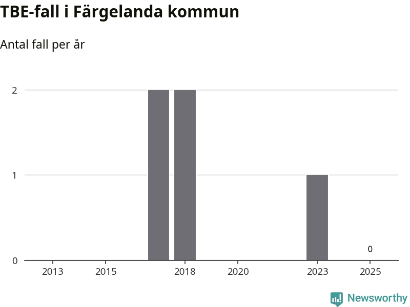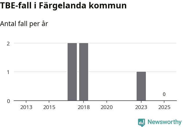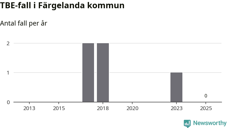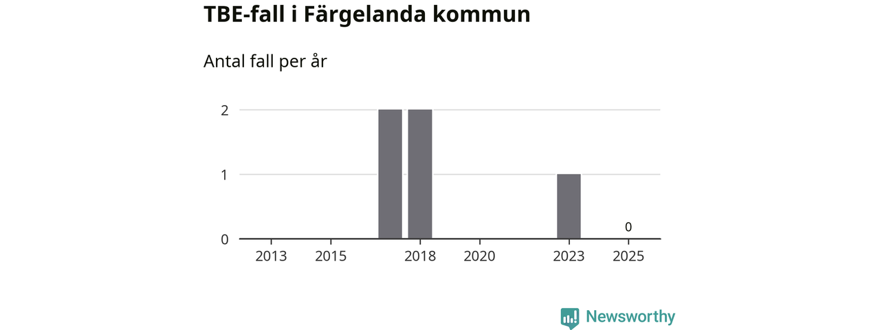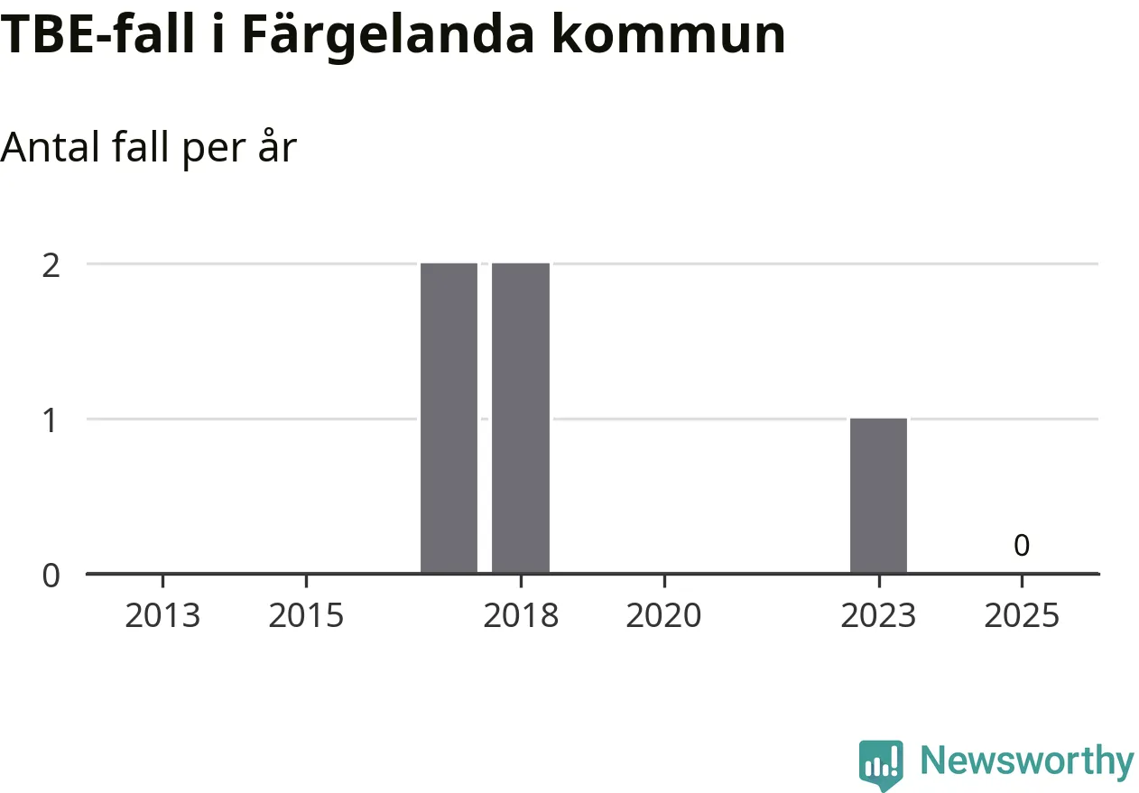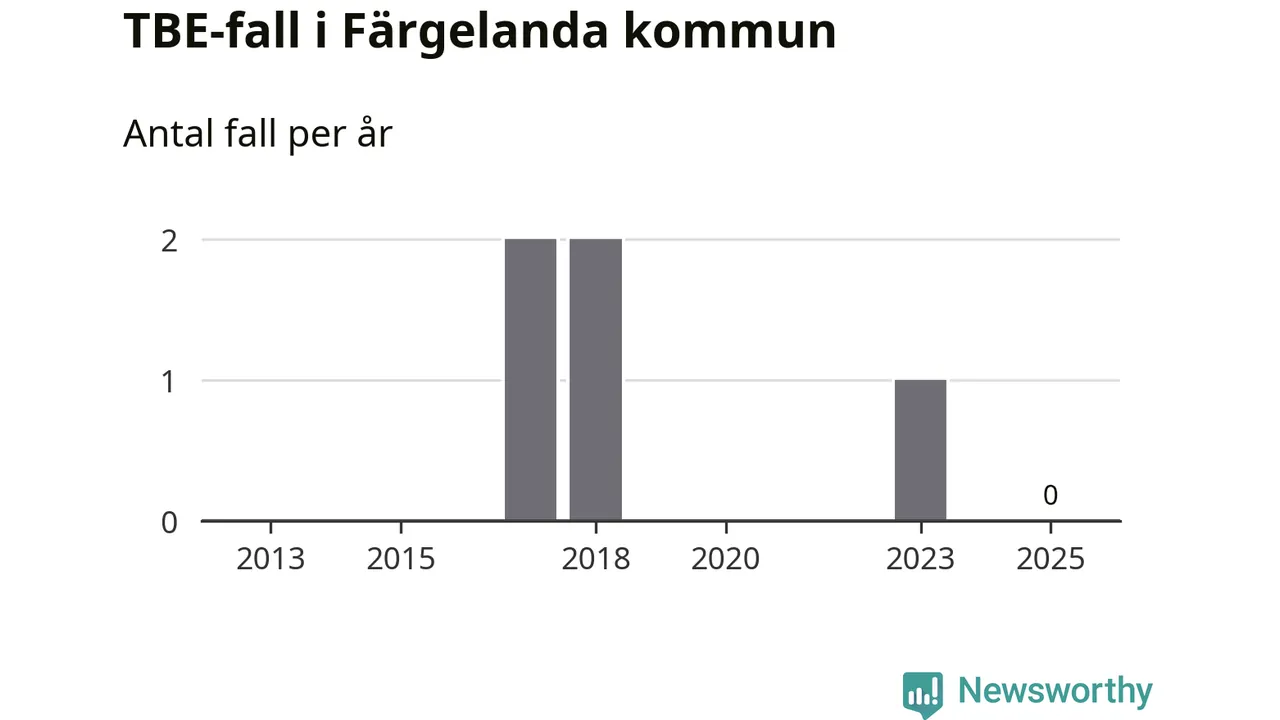 Inget TBE-fall rapporterades i Färgelanda kommun under 2025. Inga TBE-fall har rapporterats i kommunen sedan 2023.