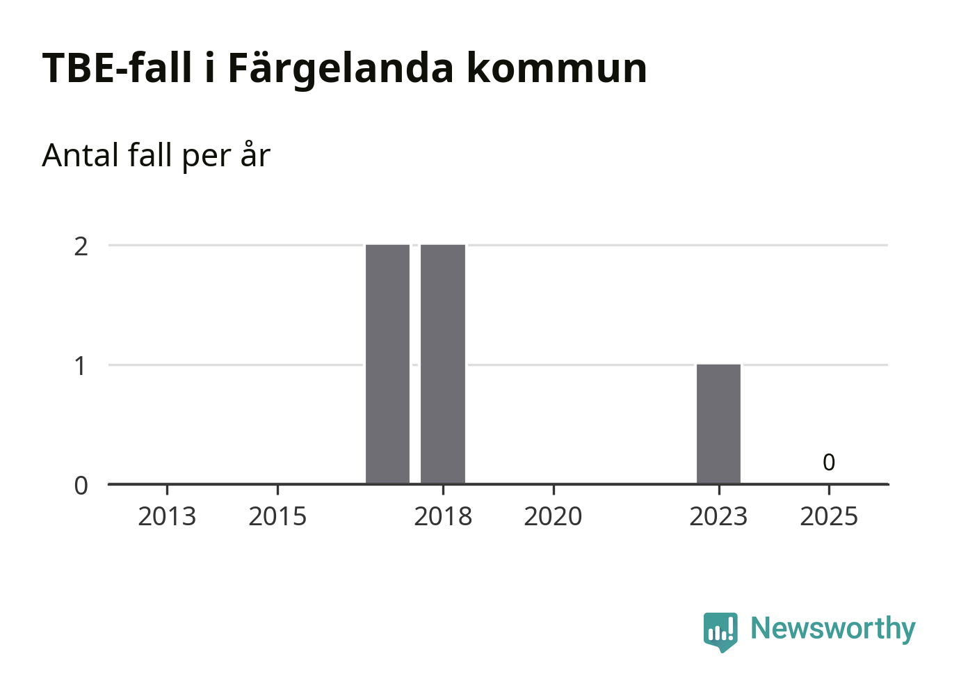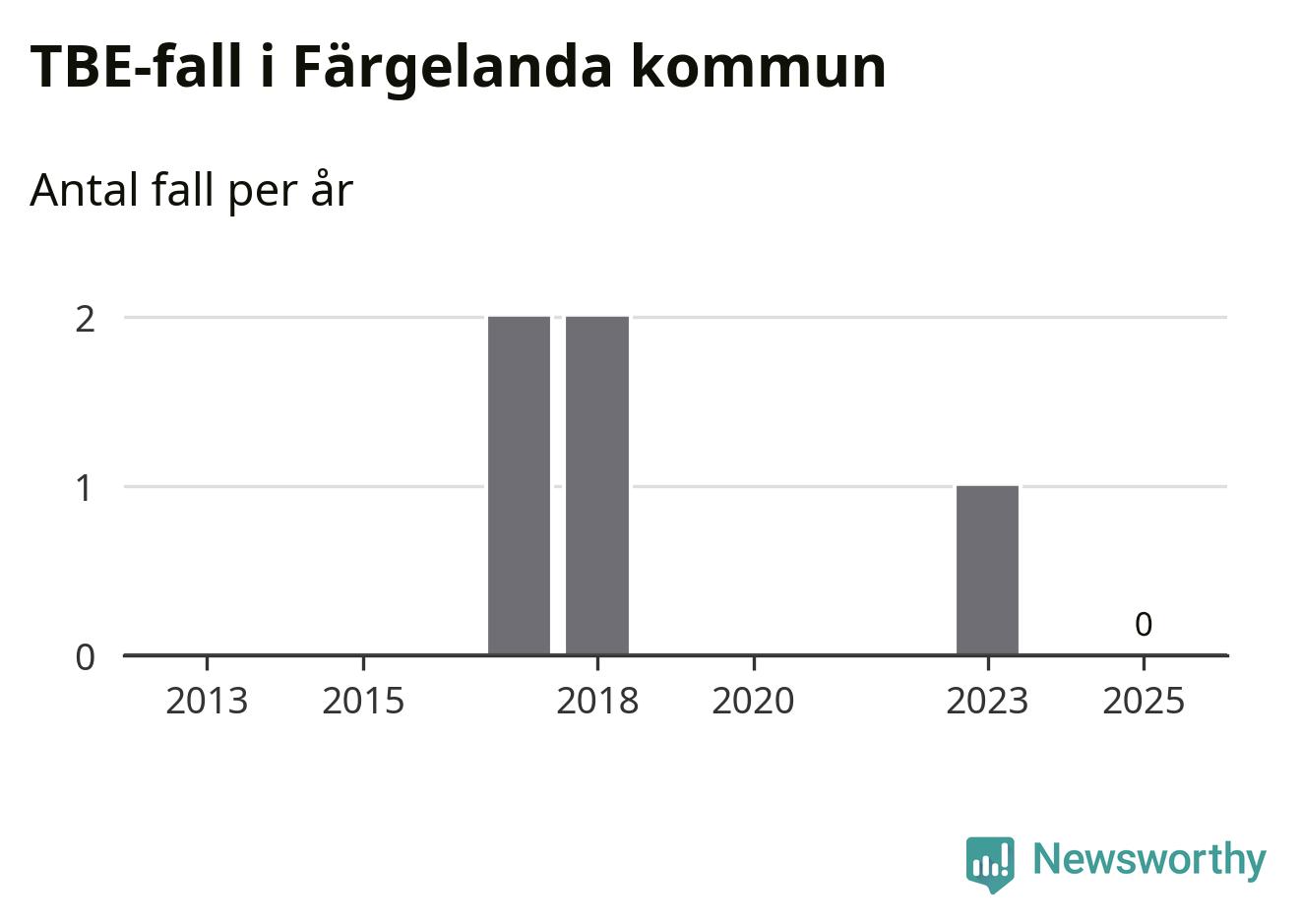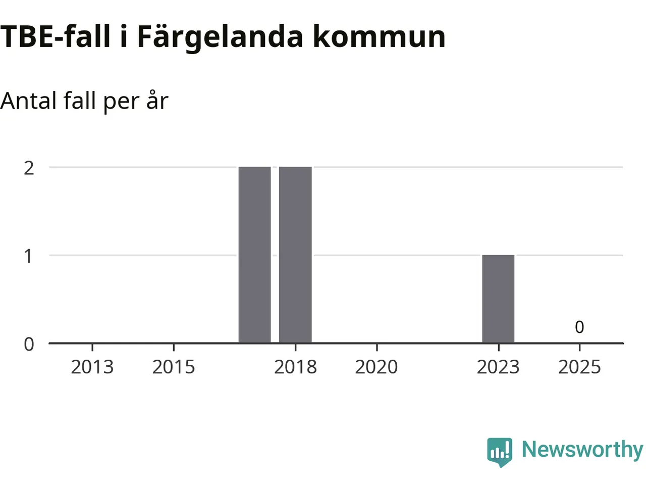 Inget TBE-fall rapporterades i Färgelanda kommun under 2025. Inga TBE-fall har rapporterats i kommunen sedan 2023.