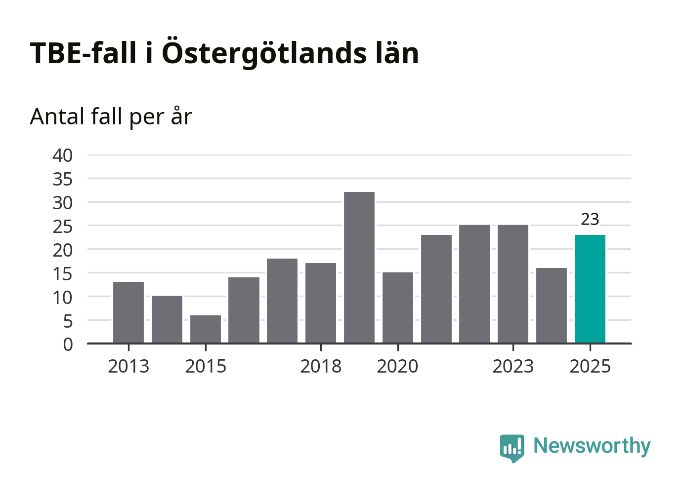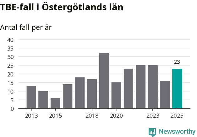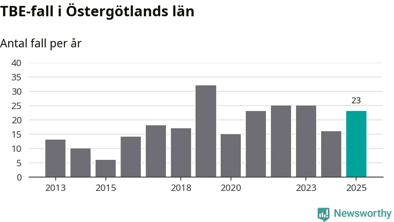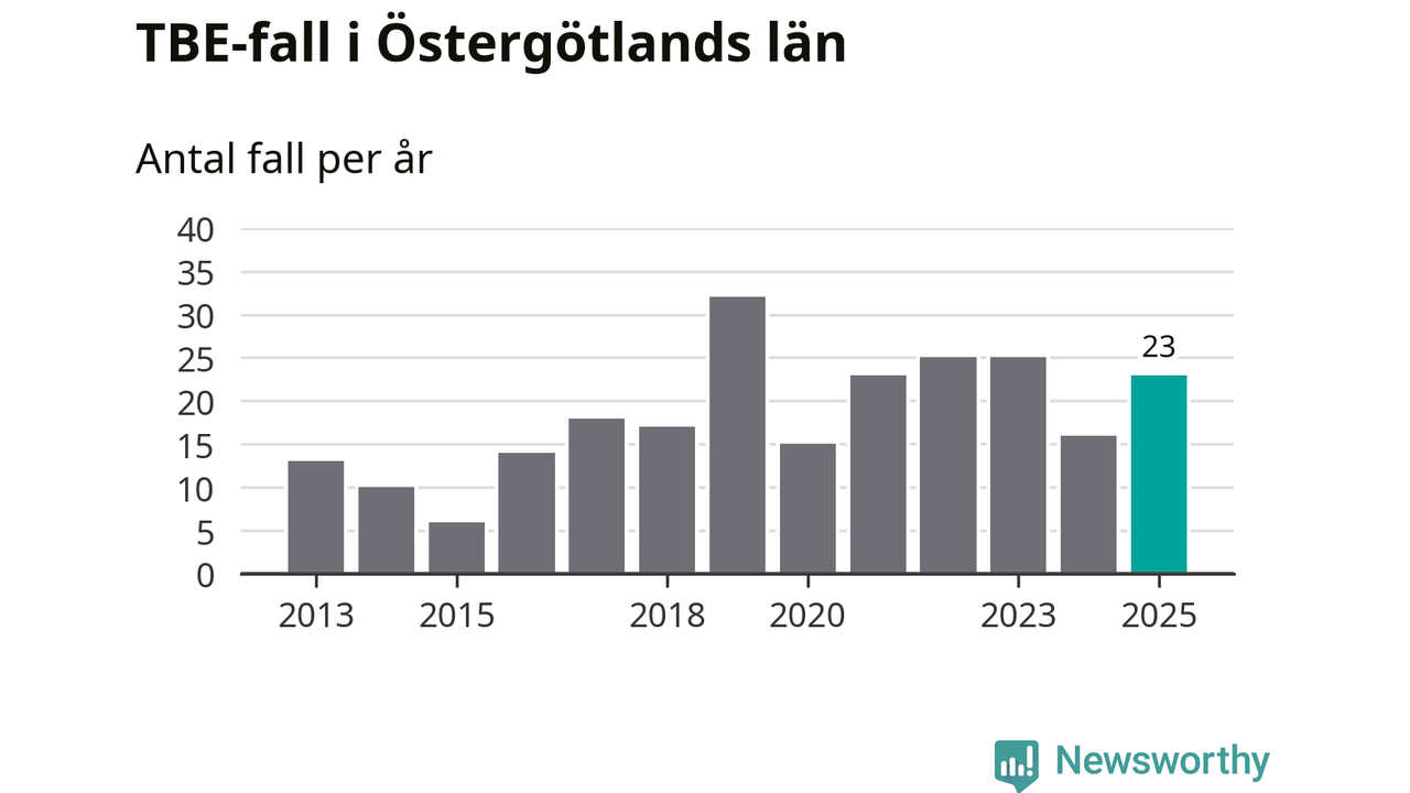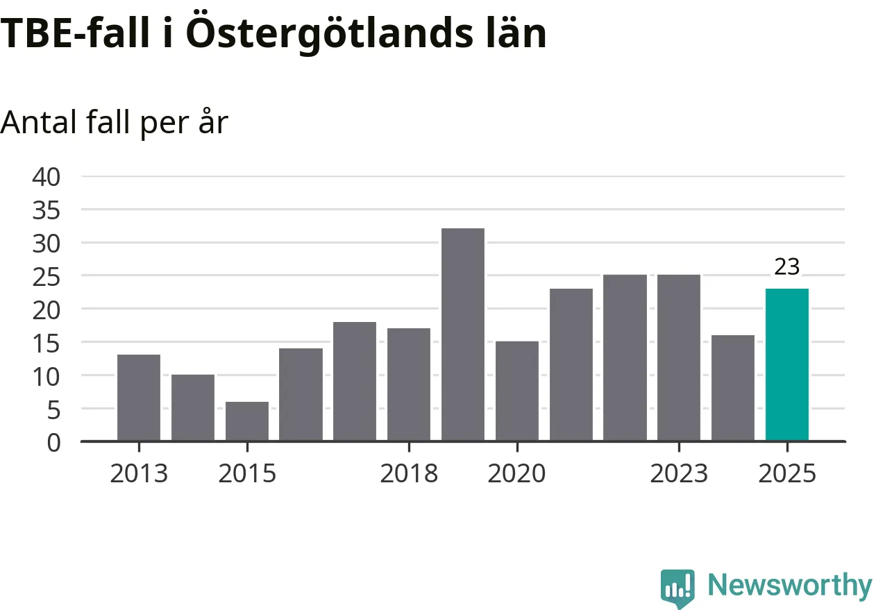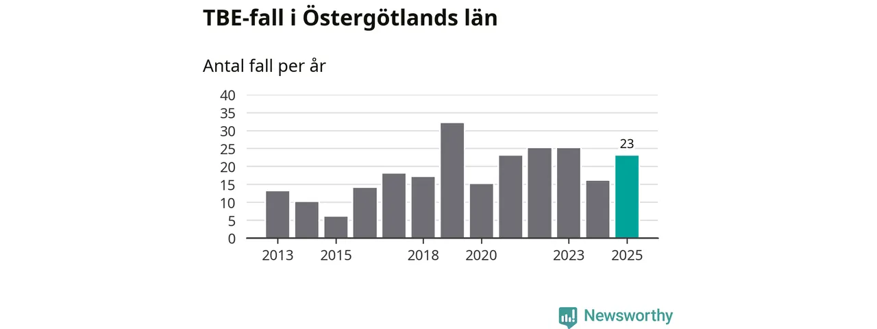 Den långsiktiga trenden är däremot tydlig. TBE-fallen blir allt fler i Sverige. Sett över tid har antalet anmälda fall i landet som helhet ökat med drygt sex procent per år sedan 2013. Totalt motsvarar det en ökning på 141 procent om vi jämför 2013 med 2025 års siffror.