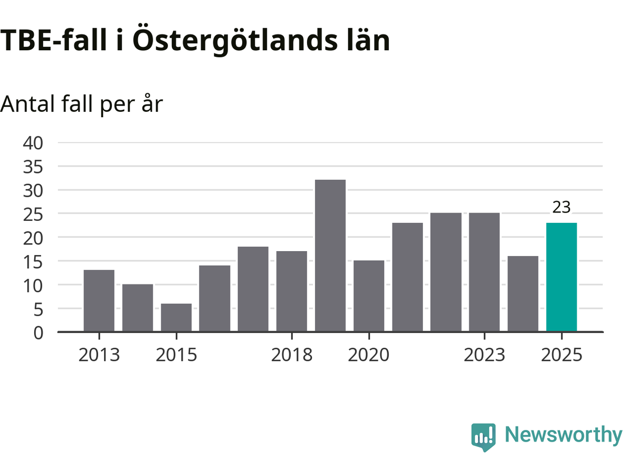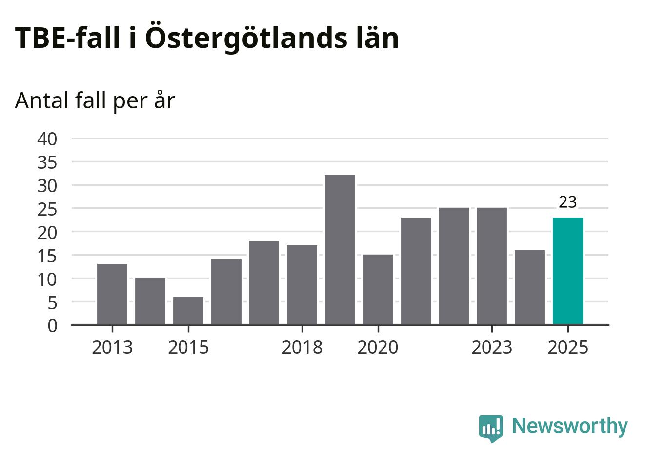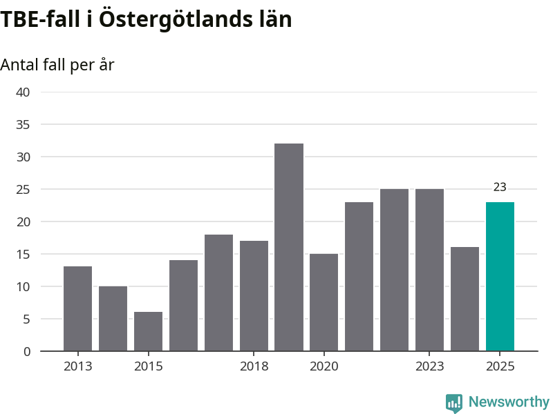 I Östergötlands län rapporterades totalt 23 smittfall. Det är en ökning sedan året innan då sjukdomssiffran låg på 16 rapporterade fall.