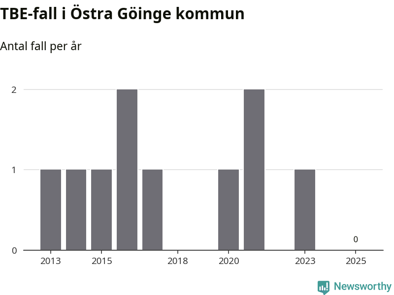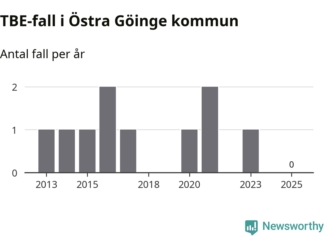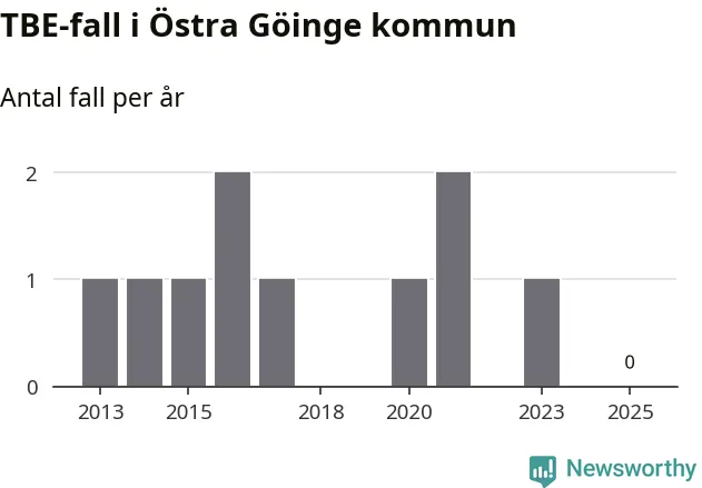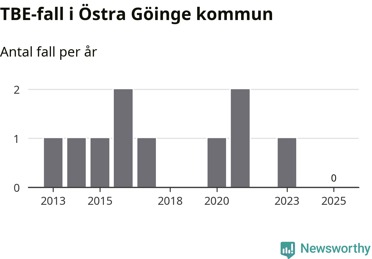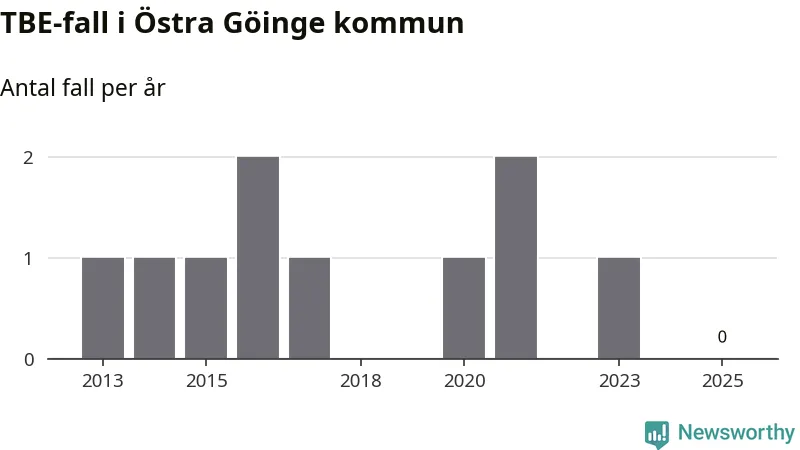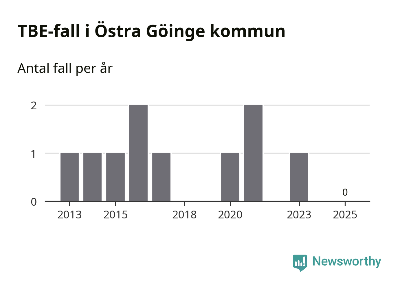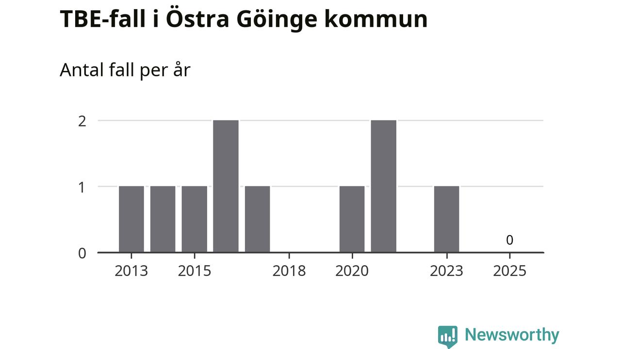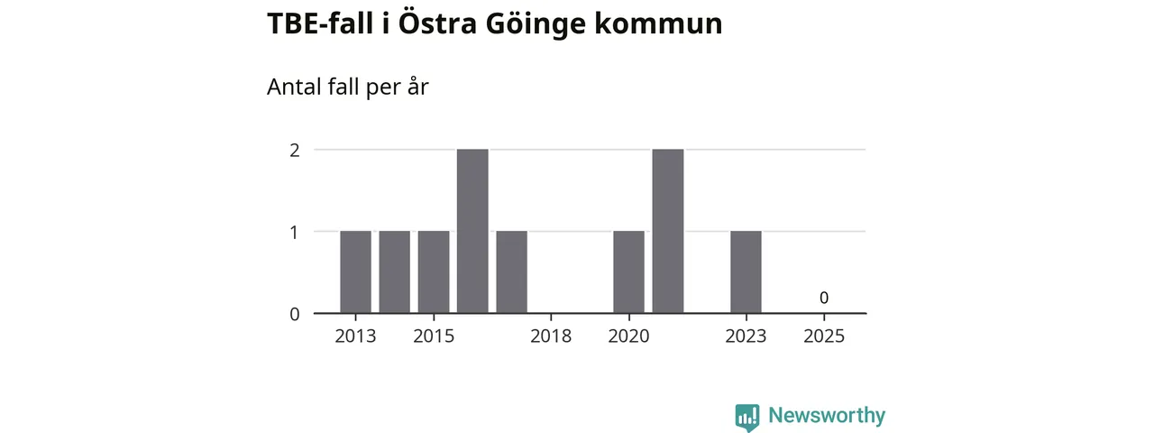 Inget TBE-fall rapporterades i Östra Göinge kommun under 2025. Inga TBE-fall har rapporterats i kommunen sedan 2023.
