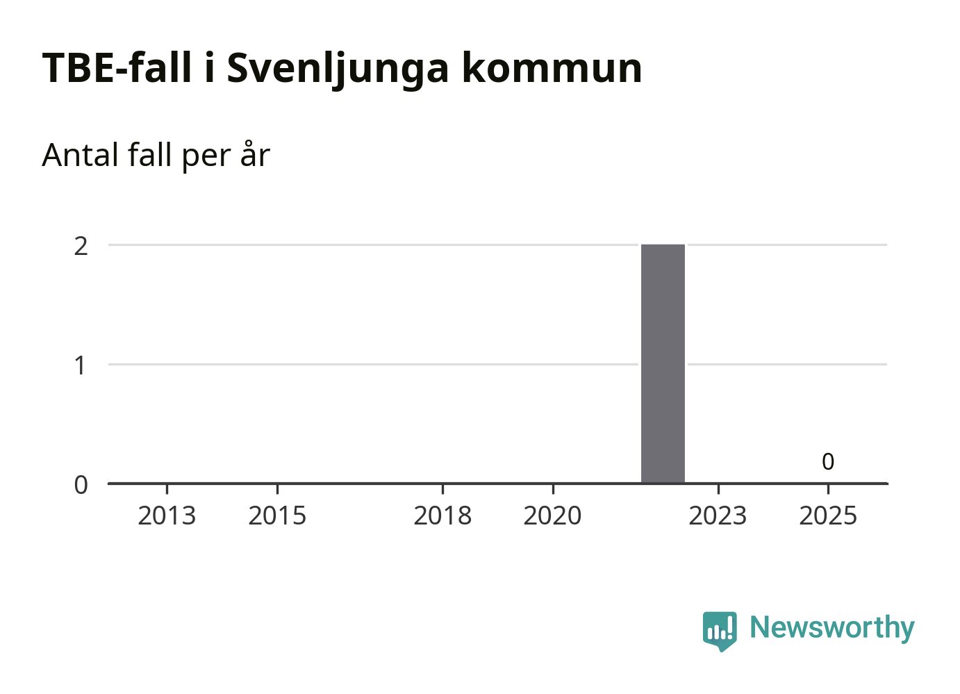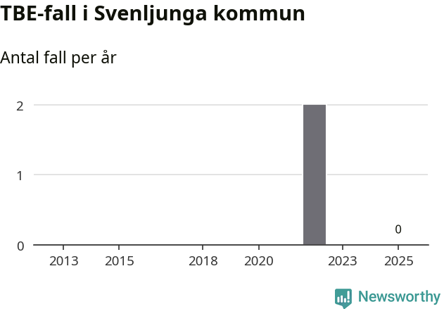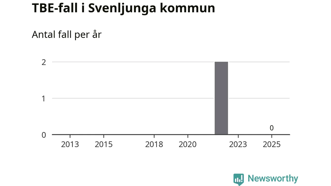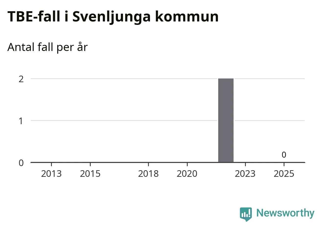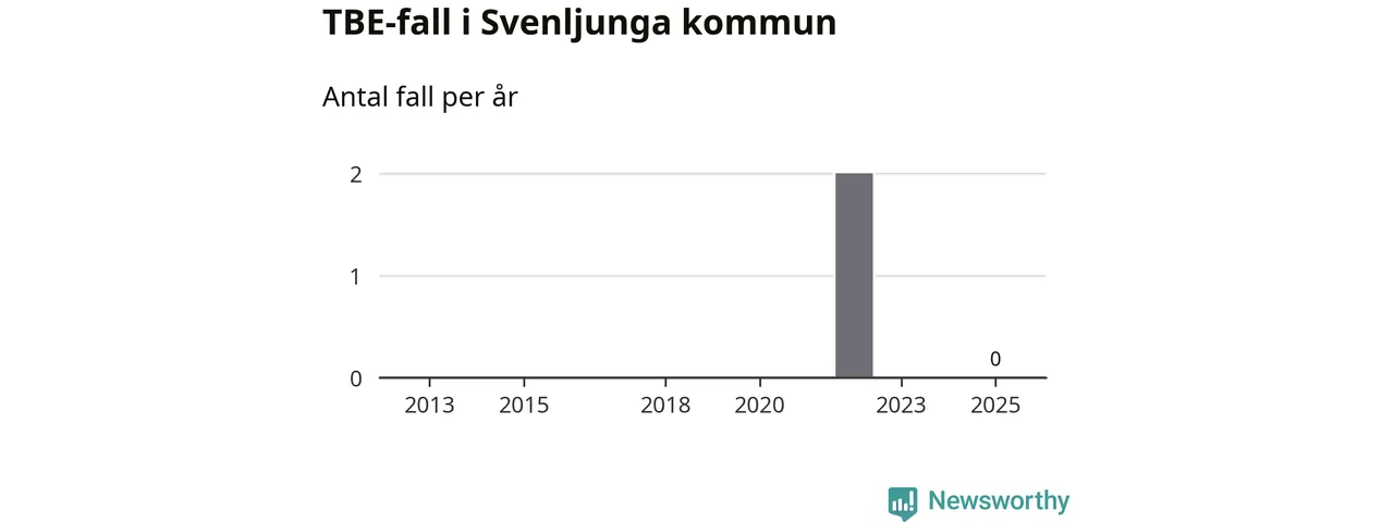 Inget TBE-fall rapporterades i Svenljunga kommun under 2025. Inga TBE-fall har rapporterats i kommunen sedan 2022.