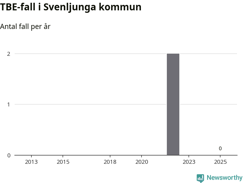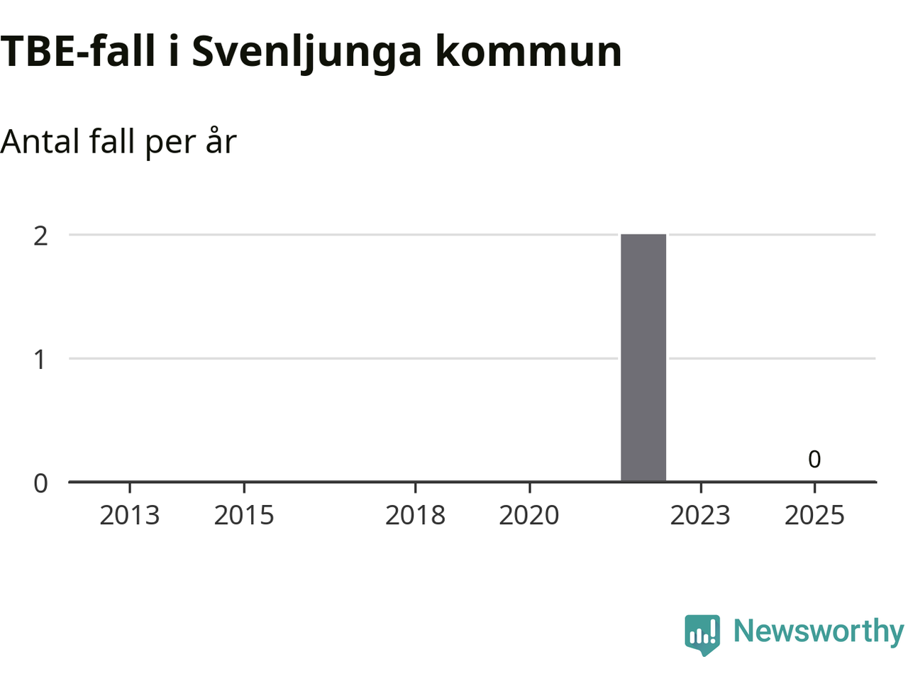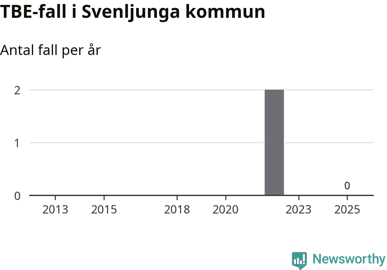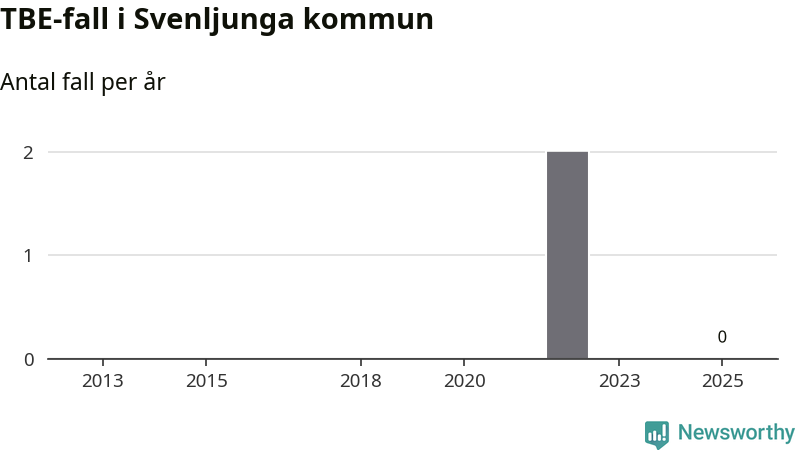 Inget TBE-fall rapporterades i Svenljunga kommun under 2025. Inga TBE-fall har rapporterats i kommunen sedan 2022.