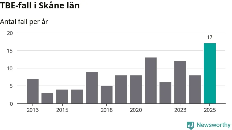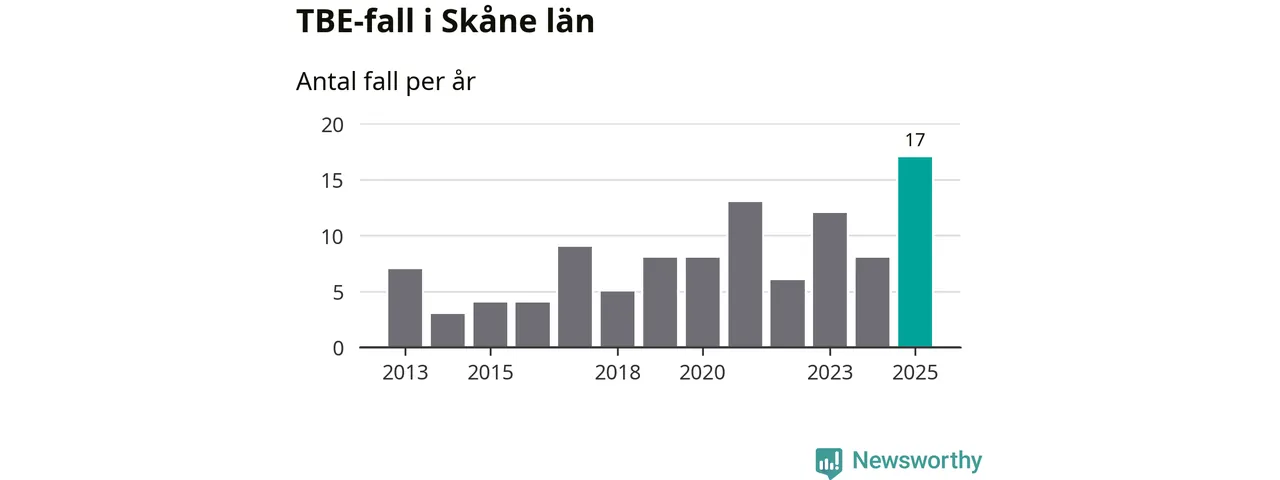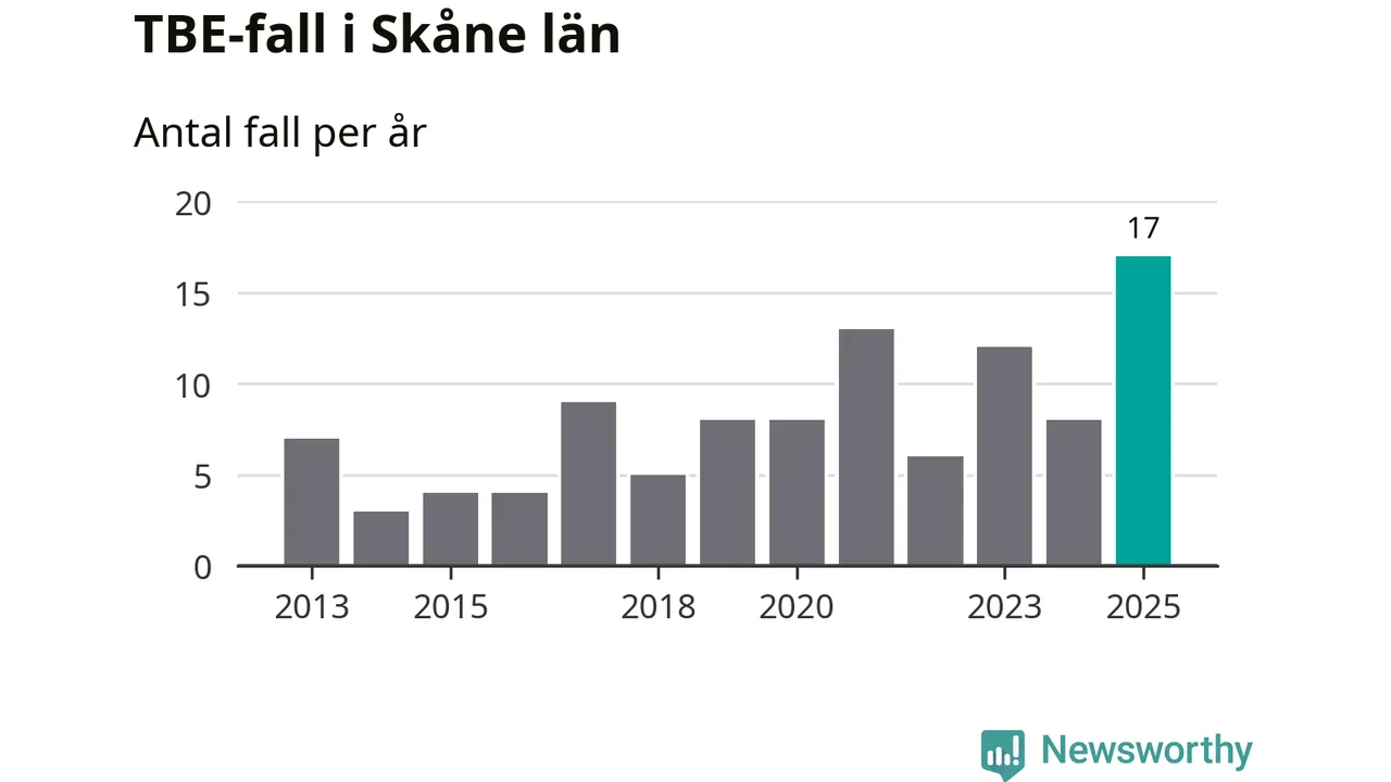 Under 2025 tillkom sju nya kommuner på den listan. Ingen del av Skåne län räknas ännu som ett område med förhöjd förekomst av TBE.