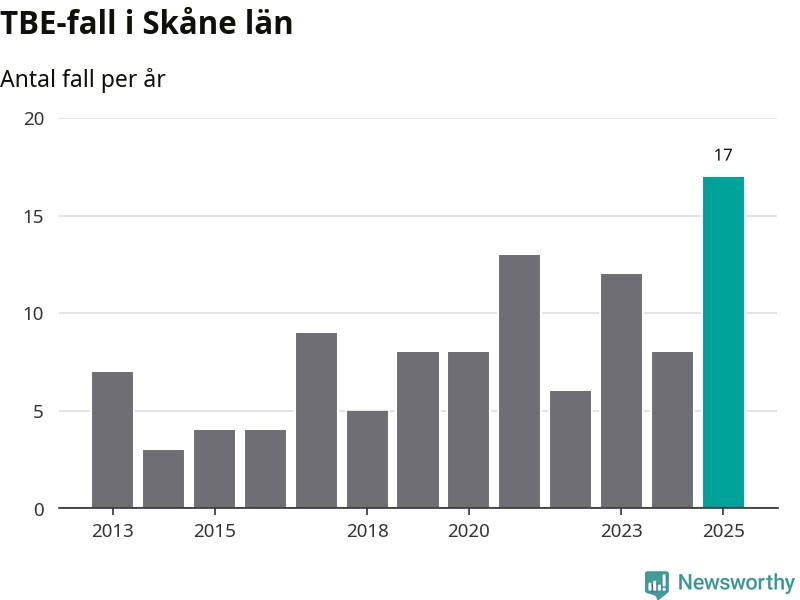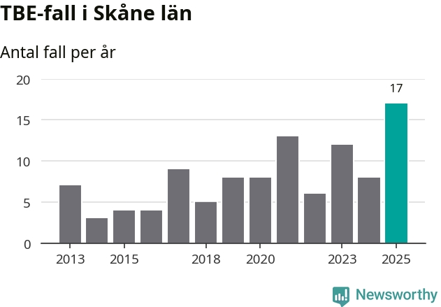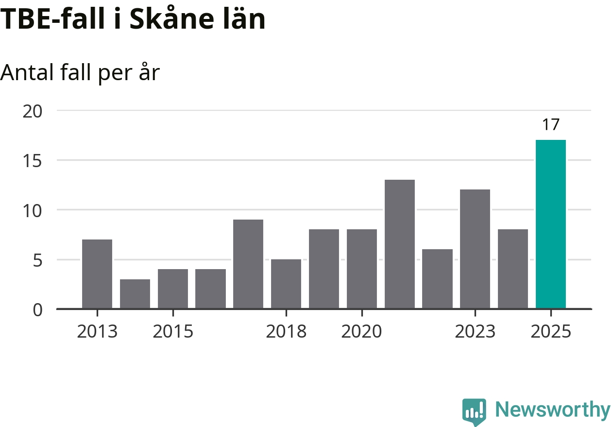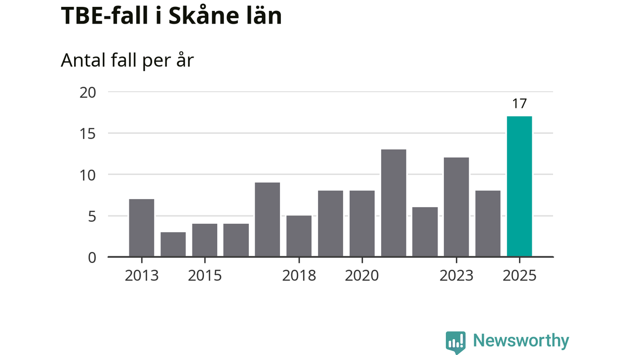 Den långsiktiga trenden är däremot tydlig. TBE-fallen blir allt fler i Sverige. Sett över tid har antalet anmälda fall i landet som helhet ökat med drygt sex procent per år sedan 2013. Totalt motsvarar det en ökning på 141 procent om vi jämför 2013 med 2025 års siffror.