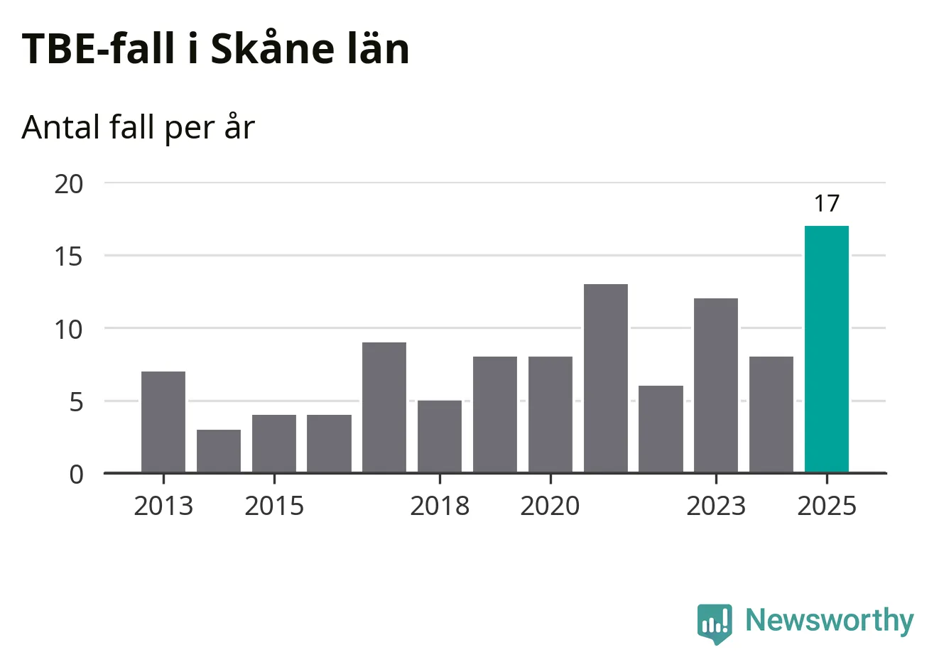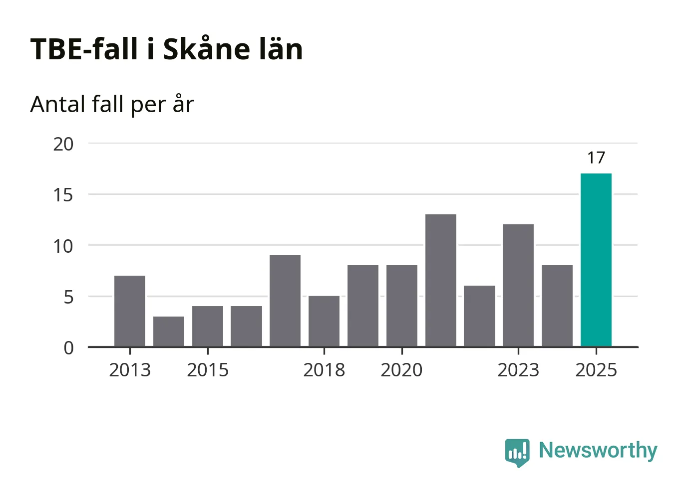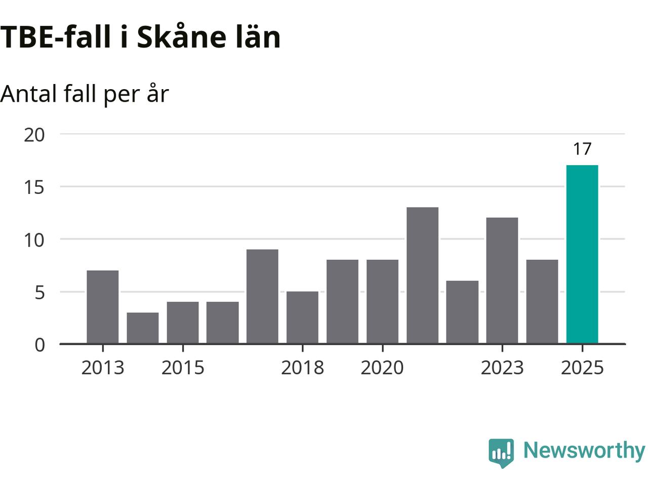 Den långsiktiga trenden är däremot tydlig. TBE-fallen blir allt fler i Sverige. Sett över tid har antalet anmälda fall i landet som helhet ökat med drygt sex procent per år sedan 2013. Totalt motsvarar det en ökning på 141 procent om vi jämför 2013 med 2025 års siffror.