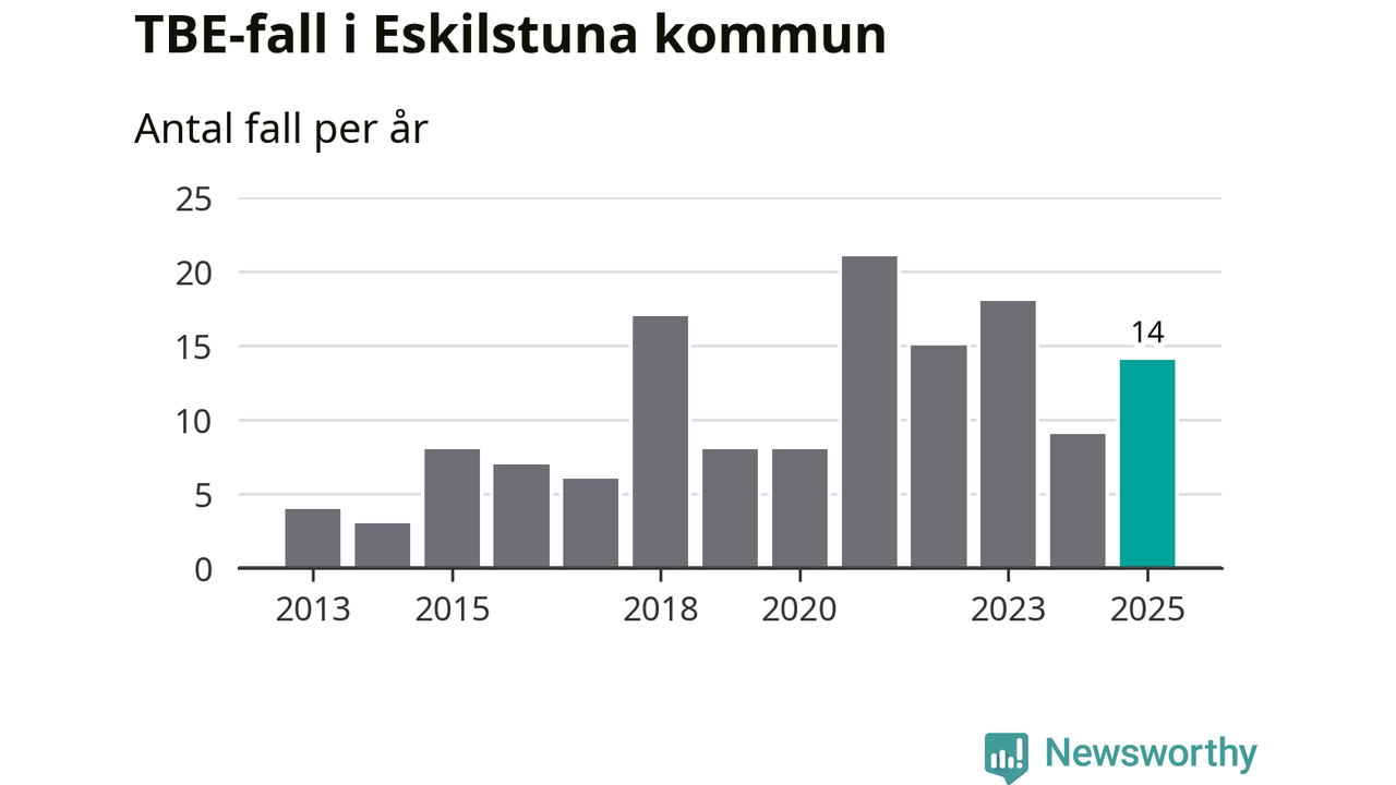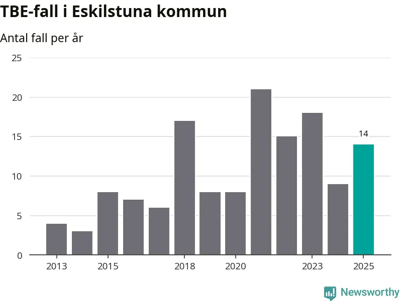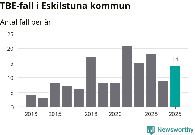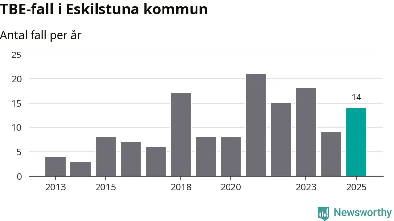 I Eskilstuna kommun rapporterades totalt 14 smittfall. Det är en ökning sedan året innan då sjukdomssiffran låg på nio rapporterade fall.