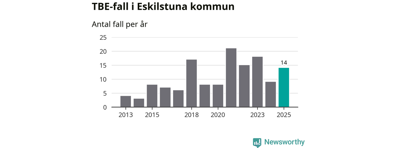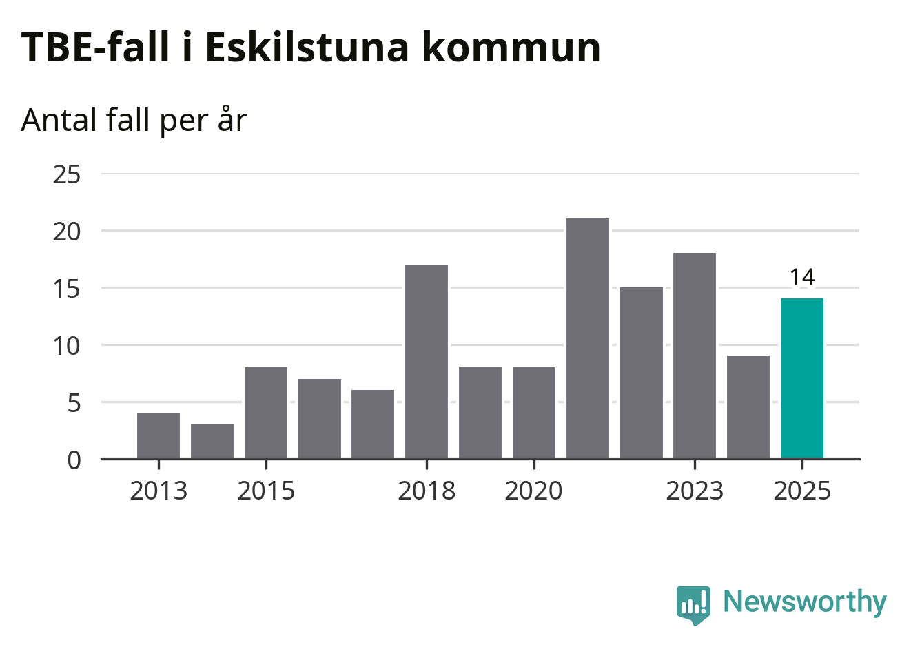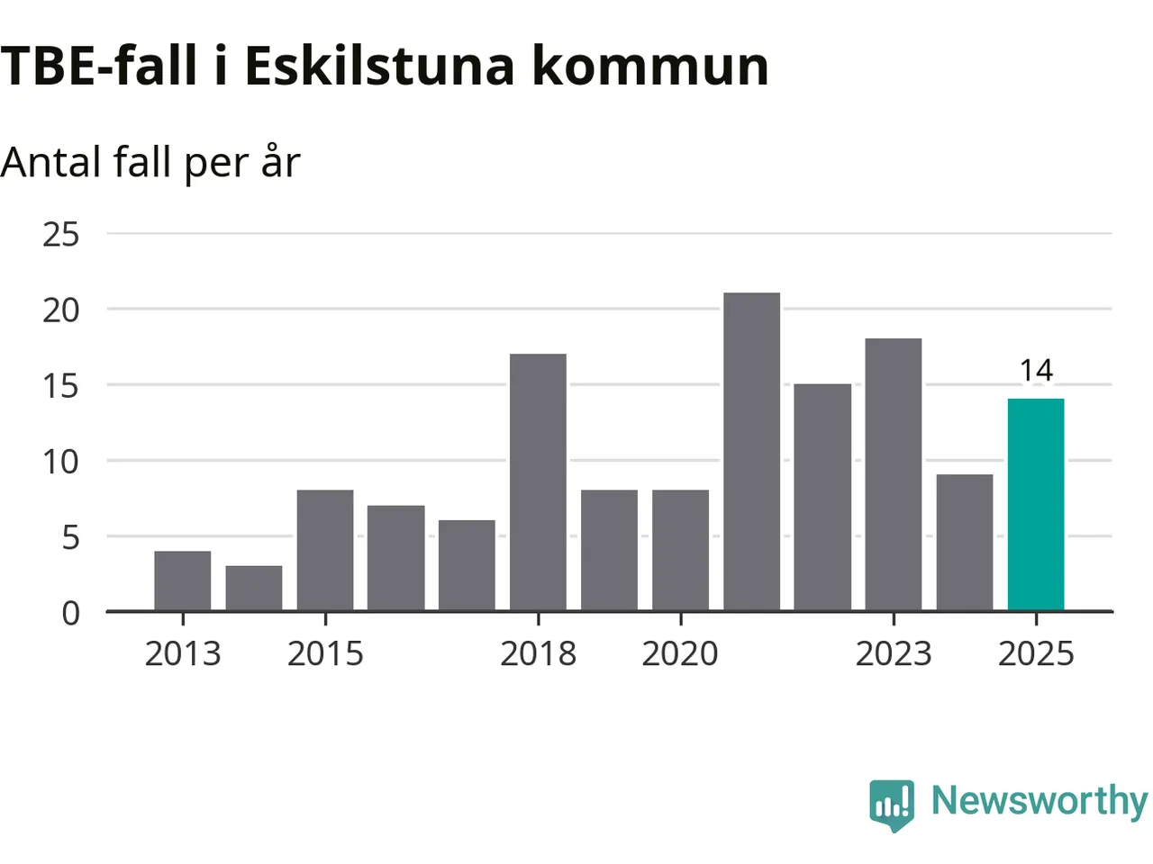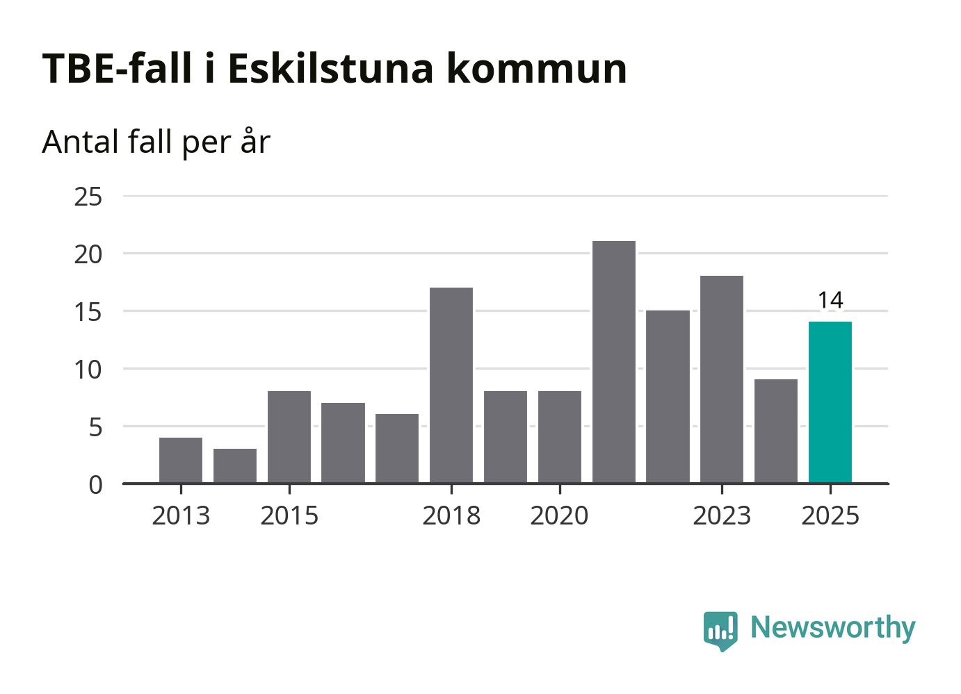 Under 2025 tillkom sju nya kommuner på den listan. Eskilstuna kommun räknas till kommunerna med förhöjd förekomst av TBE. Det gör även resten av Södermanlands län.