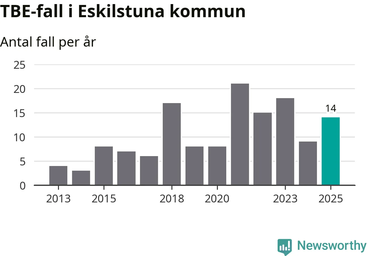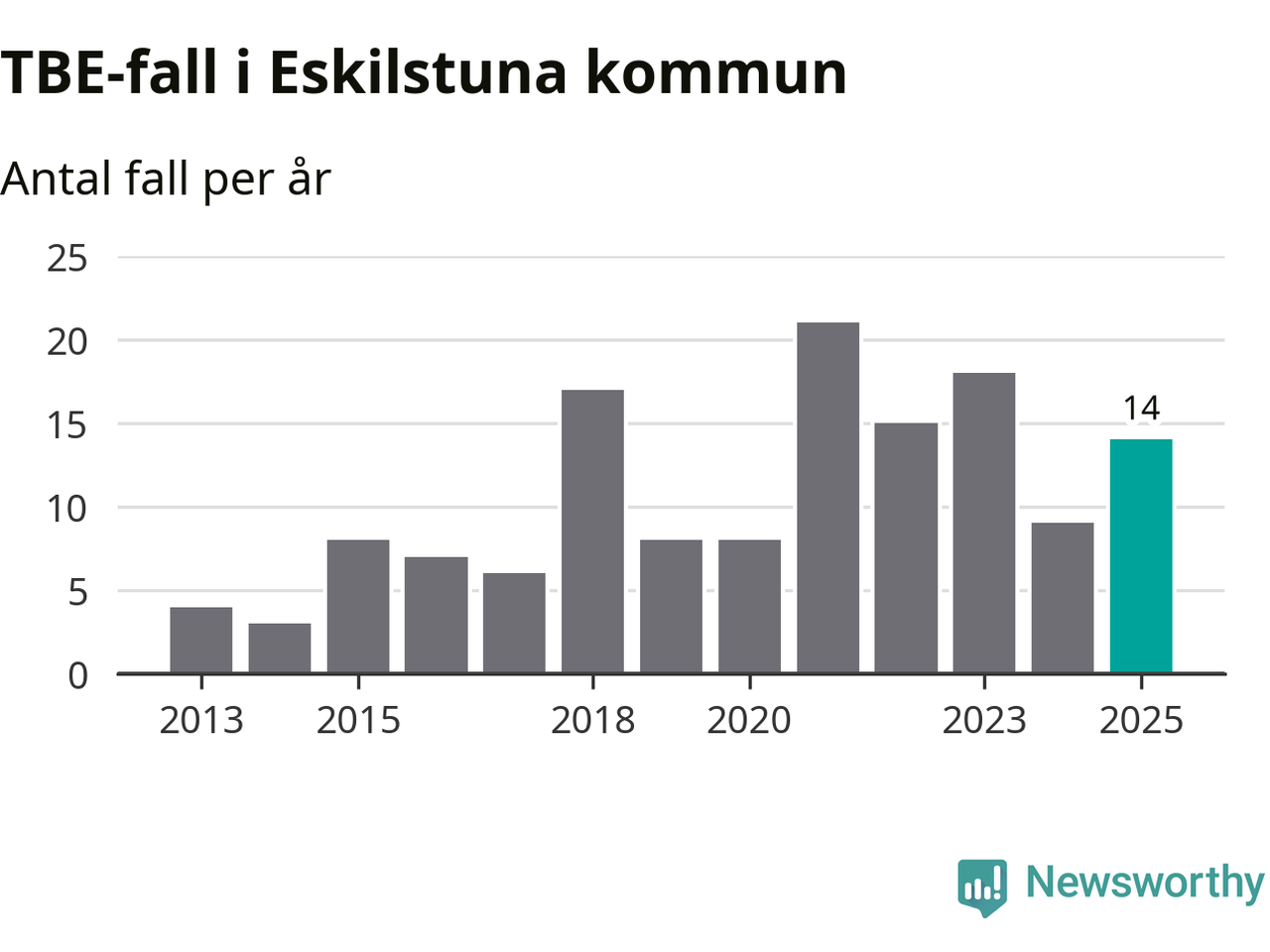 Den fästingburna TBE-smittan ökade återigen under förra året. Totalt anmäldes 504 fall i hela Sverige. I Eskilstuna ökade antalet TBE-fall från nio till 14 fall i fjol.