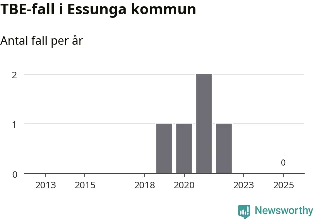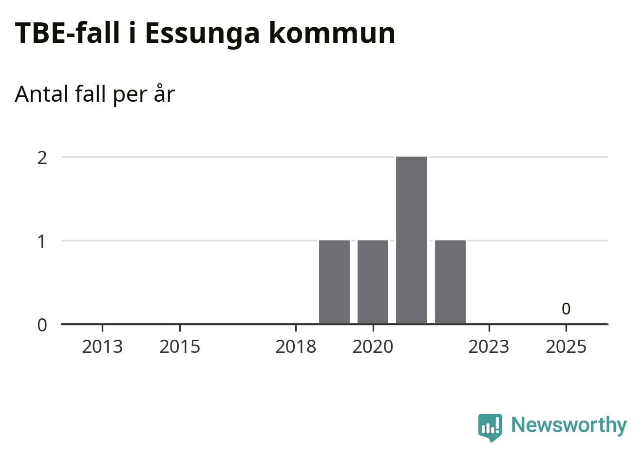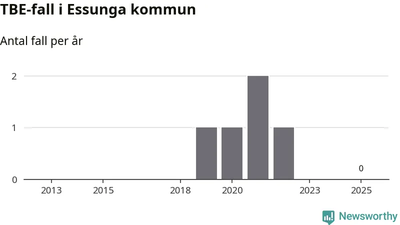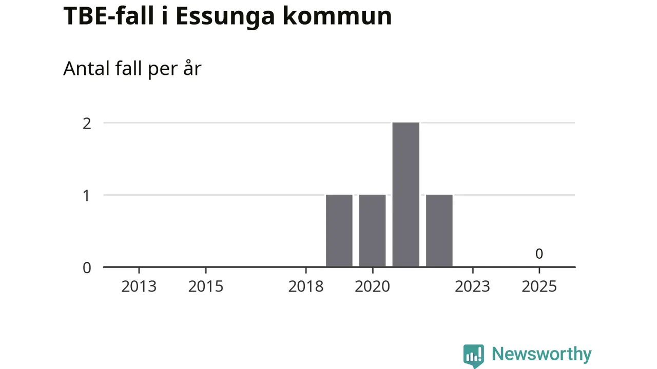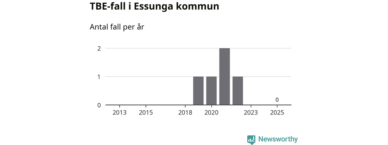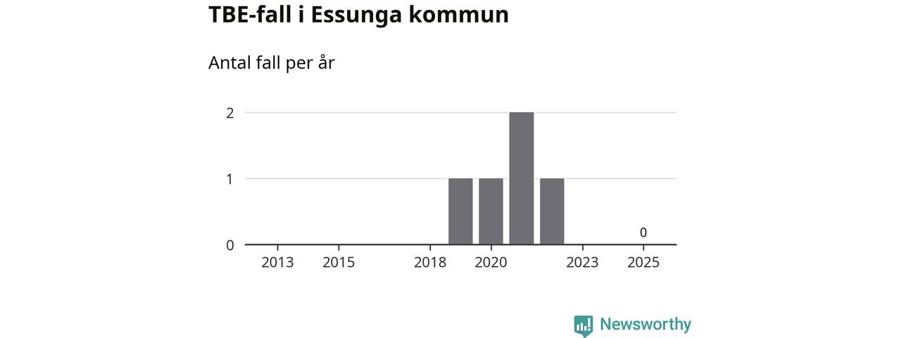 Inget TBE-fall rapporterades i Essunga kommun under 2025. Inga TBE-fall har rapporterats i kommunen sedan 2022.