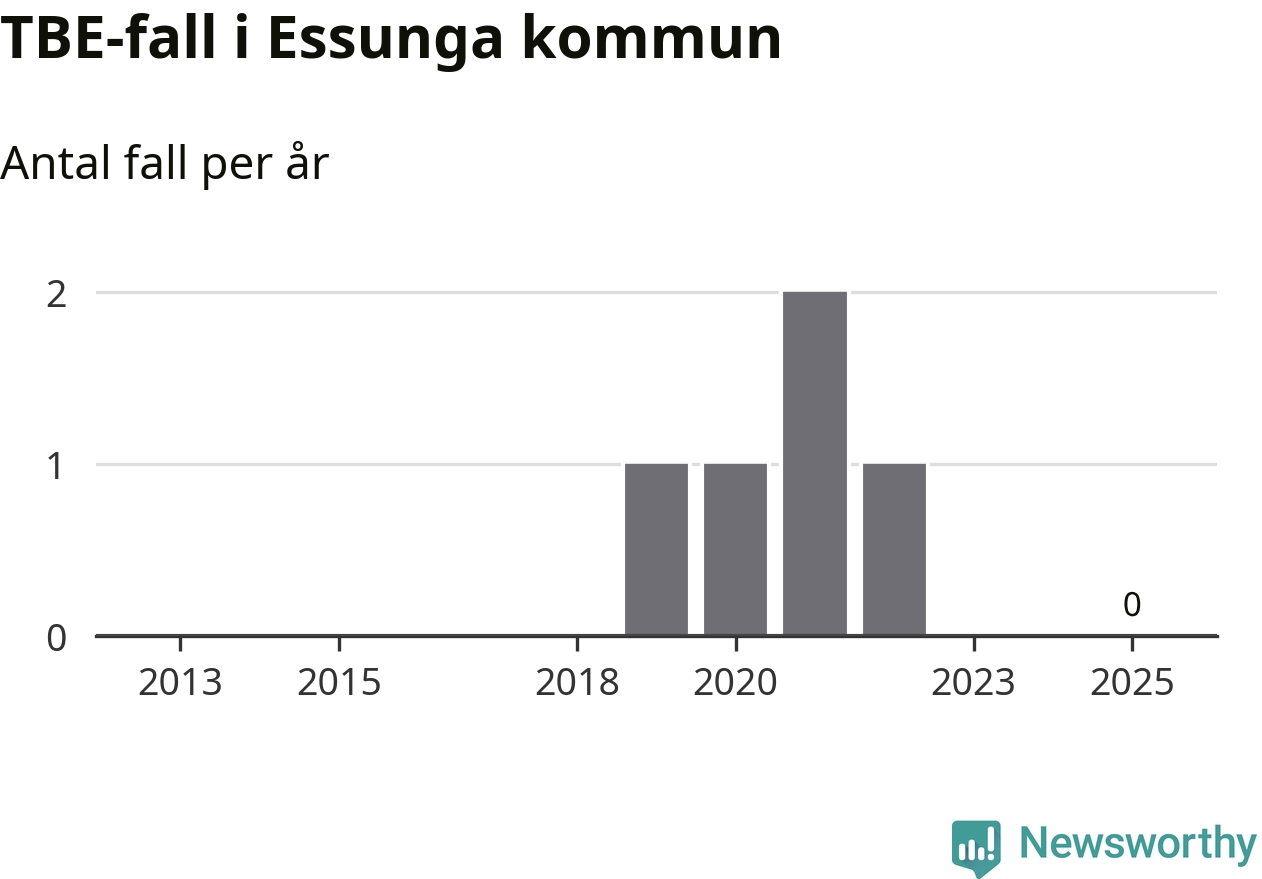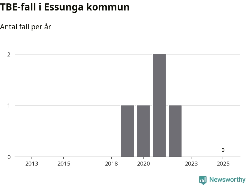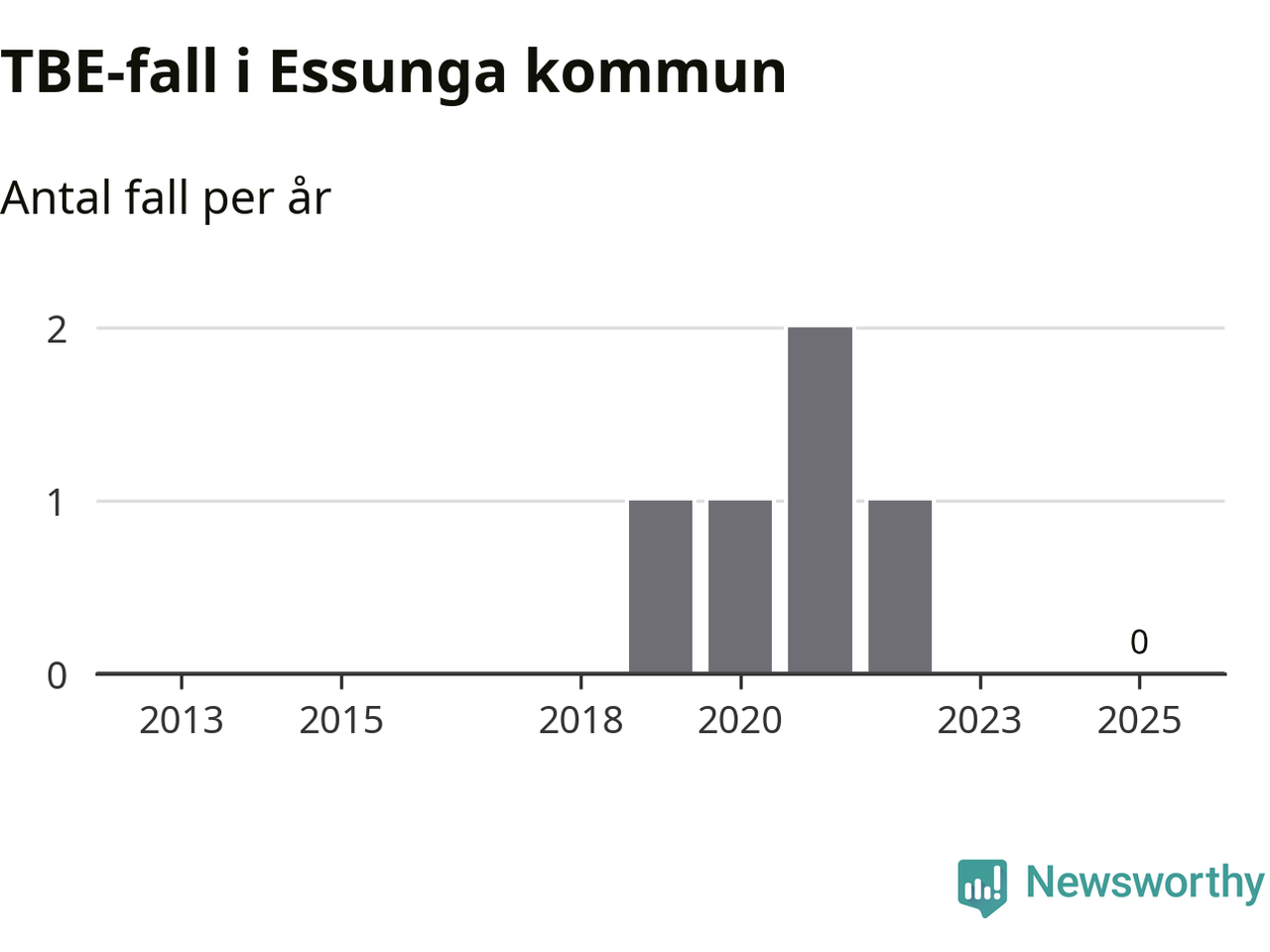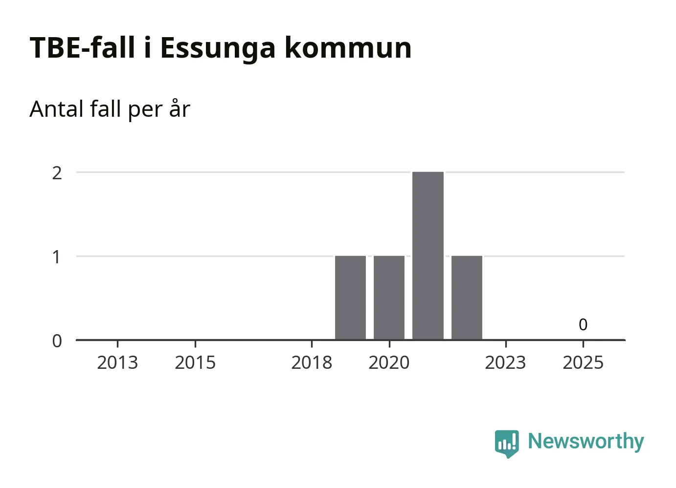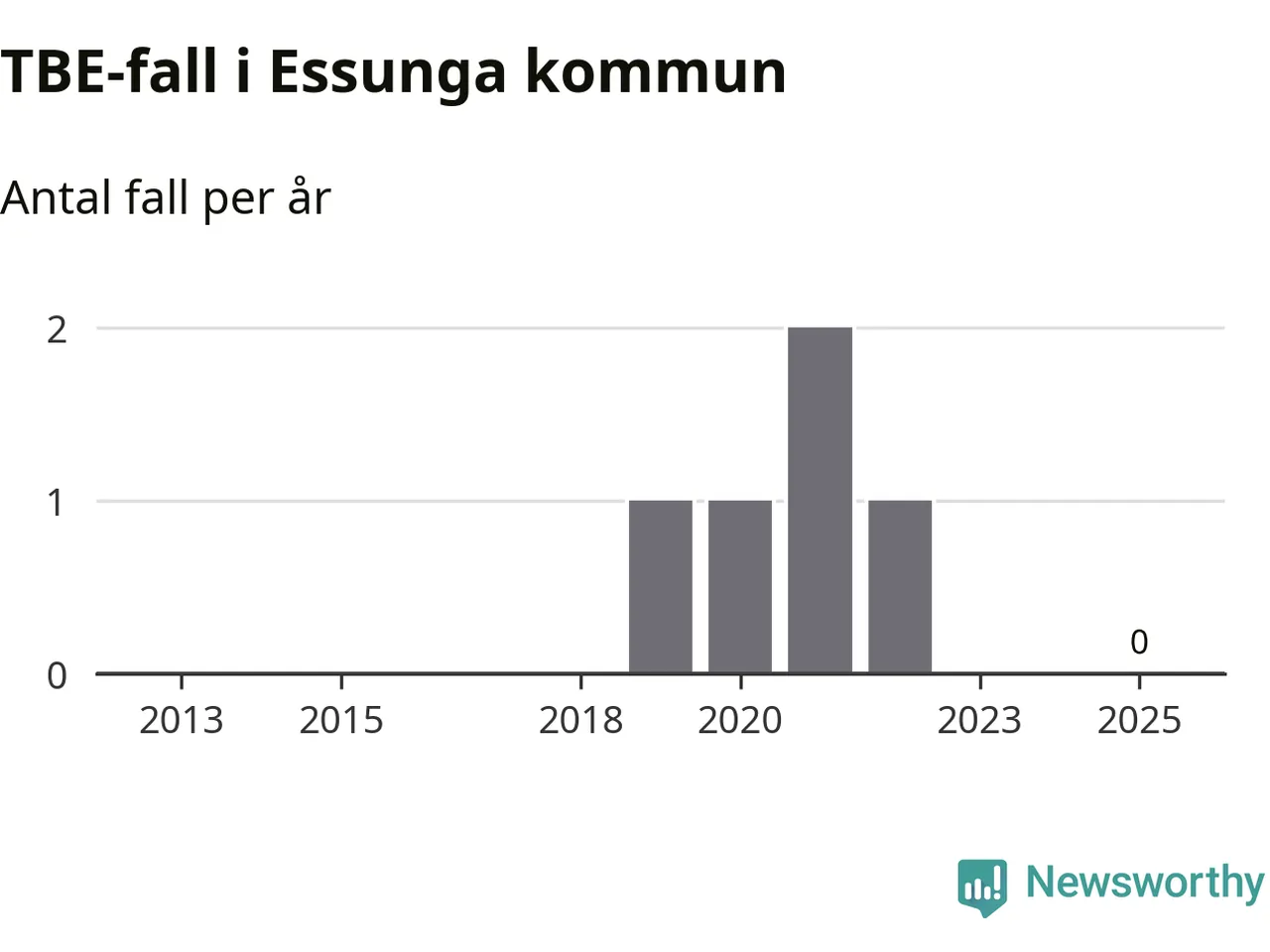 Inget TBE-fall rapporterades i Essunga kommun under 2025. Inga TBE-fall har rapporterats i kommunen sedan 2022.