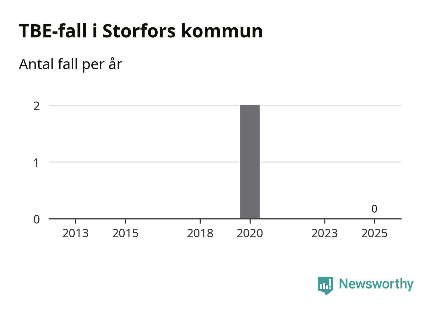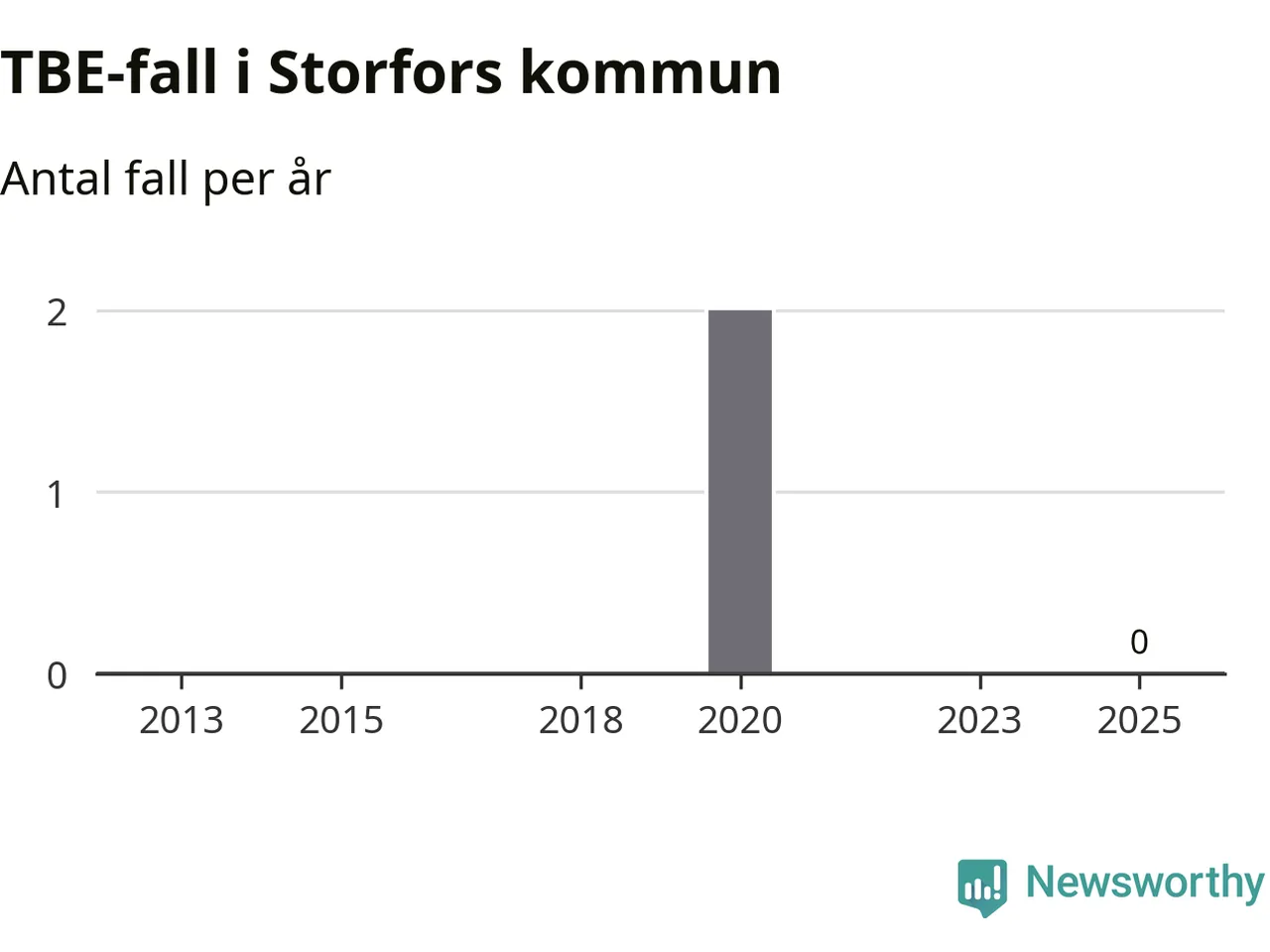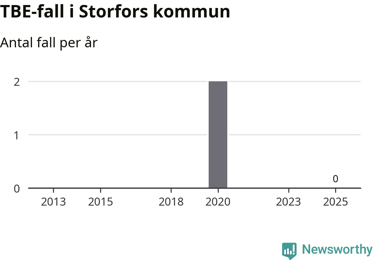 Inget TBE-fall rapporterades i Storfors kommun under 2025. Inga TBE-fall har rapporterats i kommunen sedan 2020.