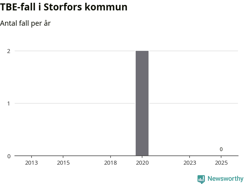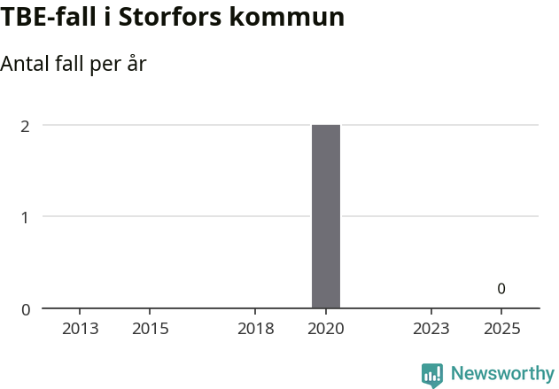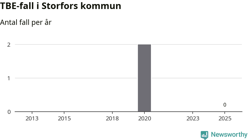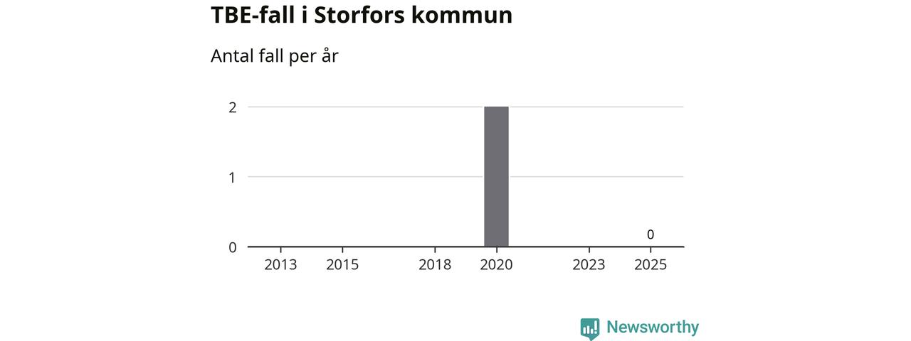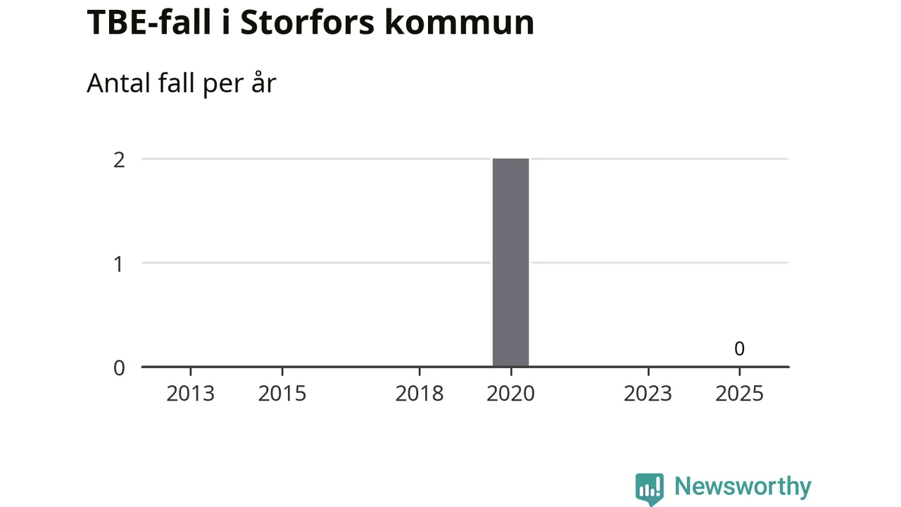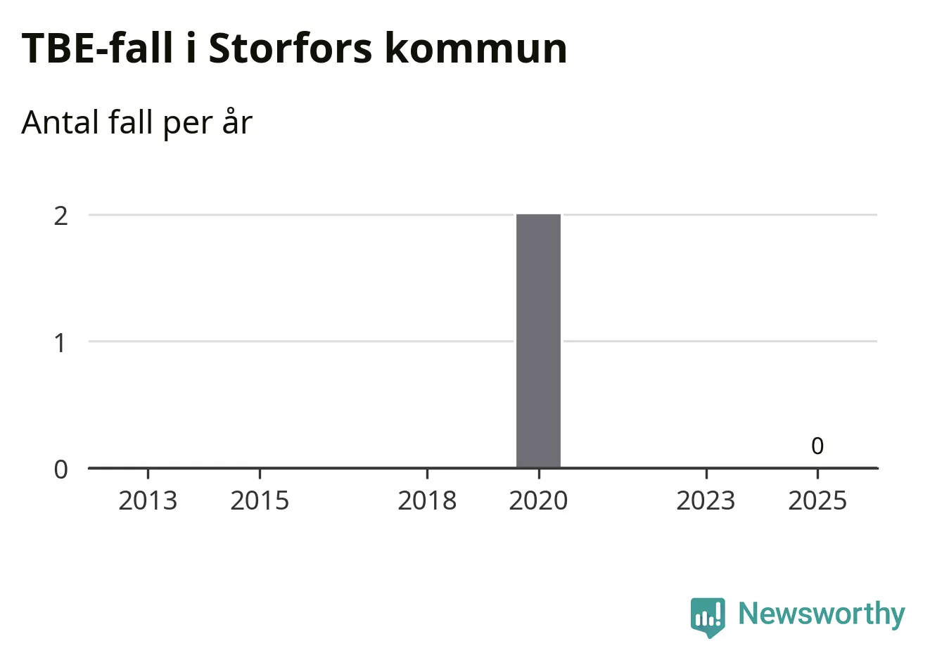 Inget TBE-fall rapporterades i Storfors kommun under 2025. Inga TBE-fall har rapporterats i kommunen sedan 2020.