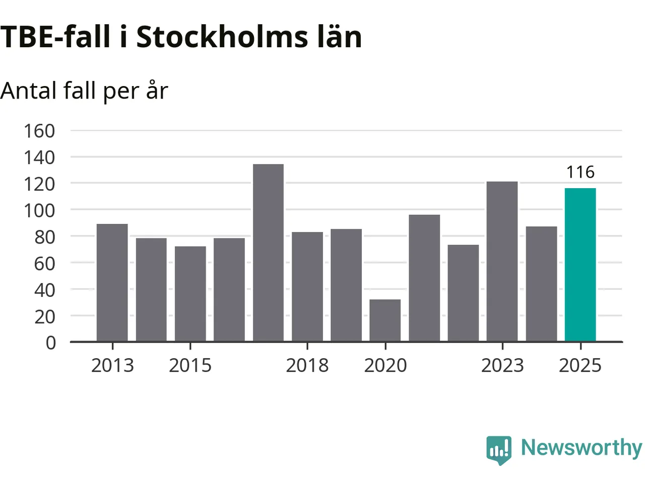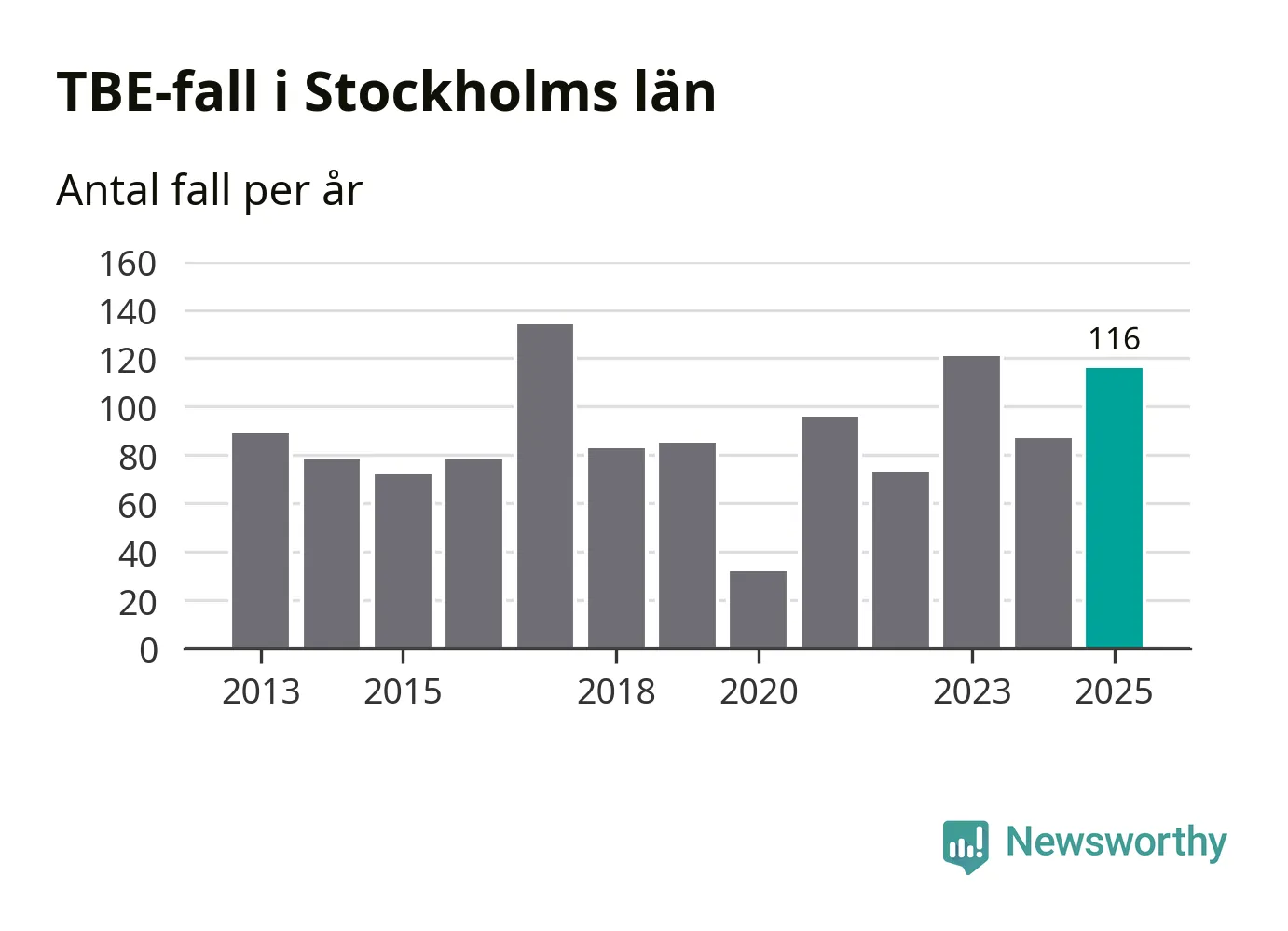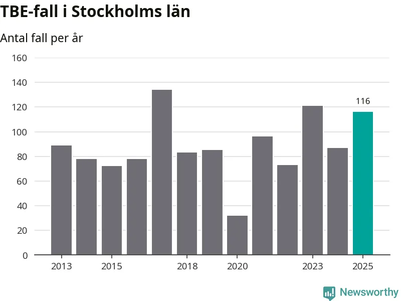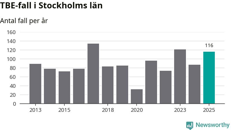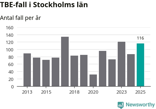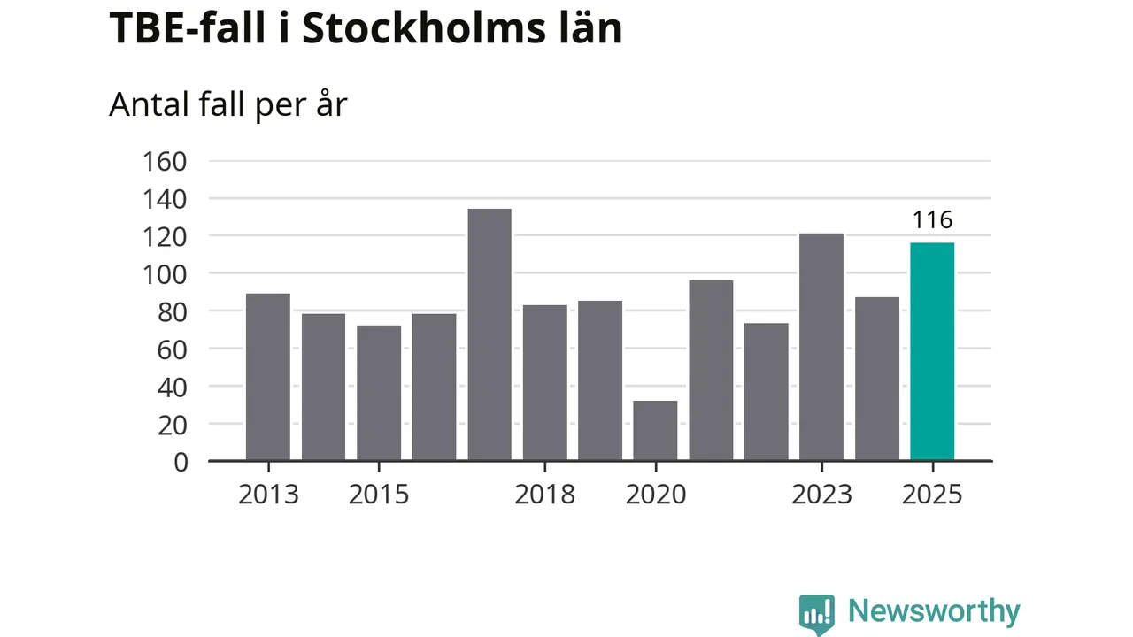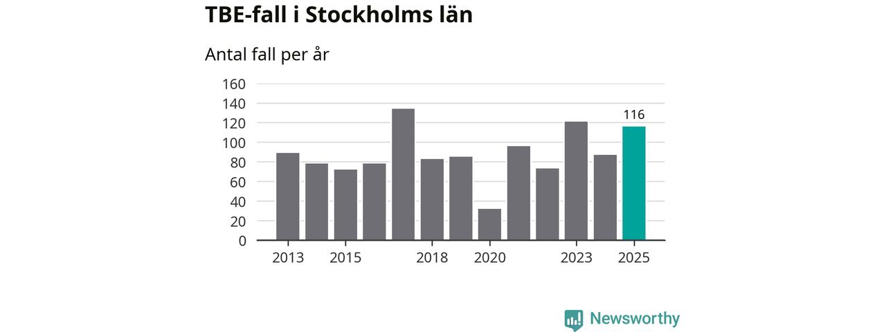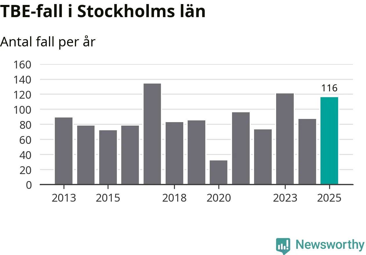 Den långsiktiga trenden är däremot tydlig. TBE-fallen blir allt fler i Sverige. Sett över tid har antalet anmälda fall i landet som helhet ökat med drygt sex procent per år sedan 2013. Totalt motsvarar det en ökning på 141 procent om vi jämför 2013 med 2025 års siffror.