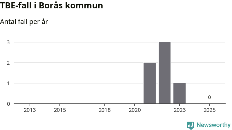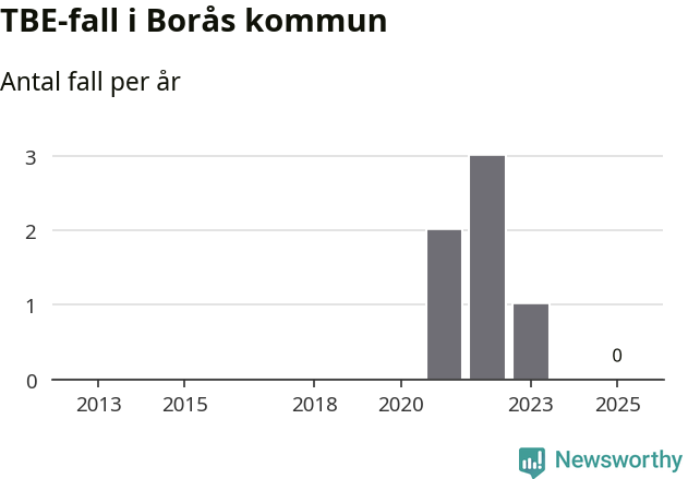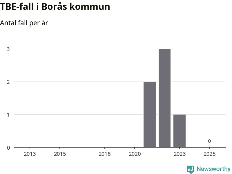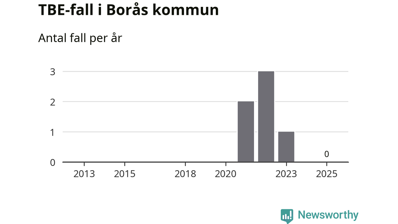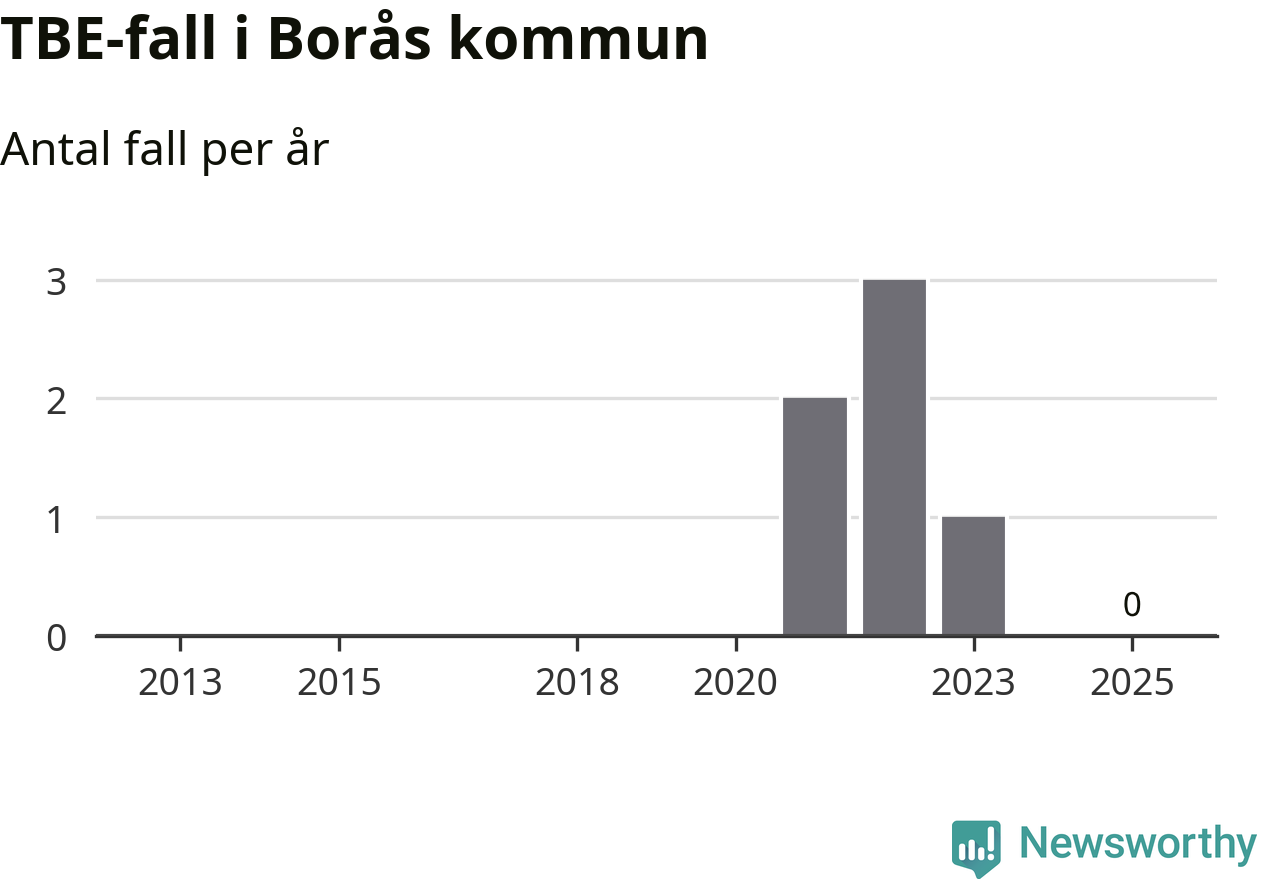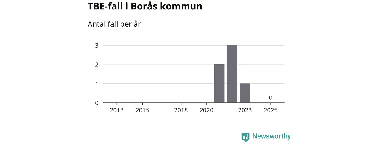 Inget TBE-fall rapporterades i Borås kommun under 2025. Inga TBE-fall har rapporterats i kommunen sedan 2023.