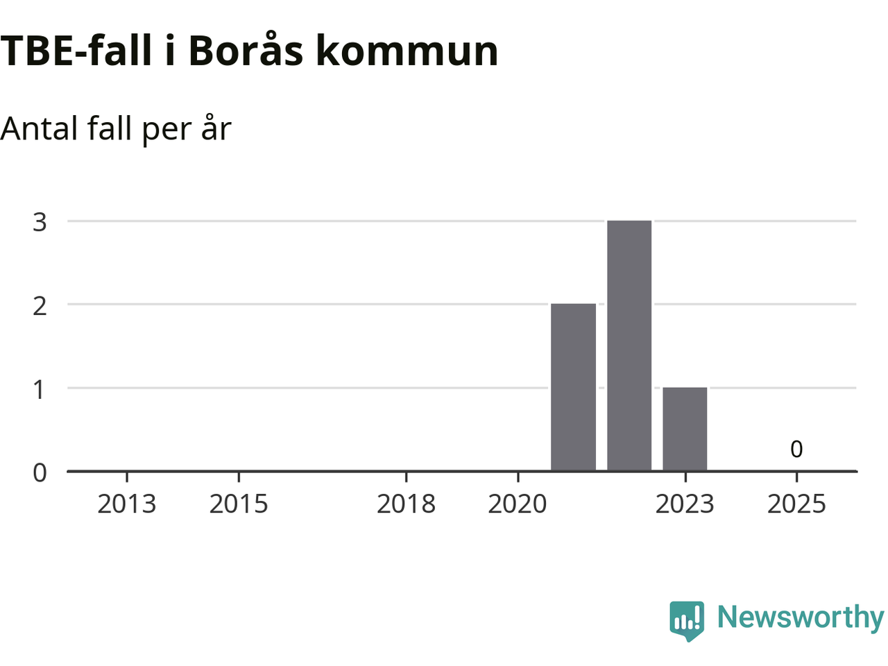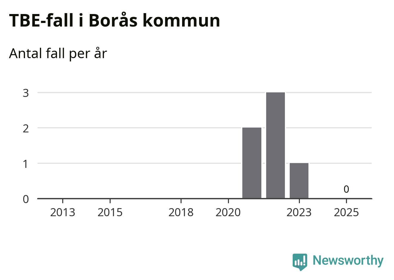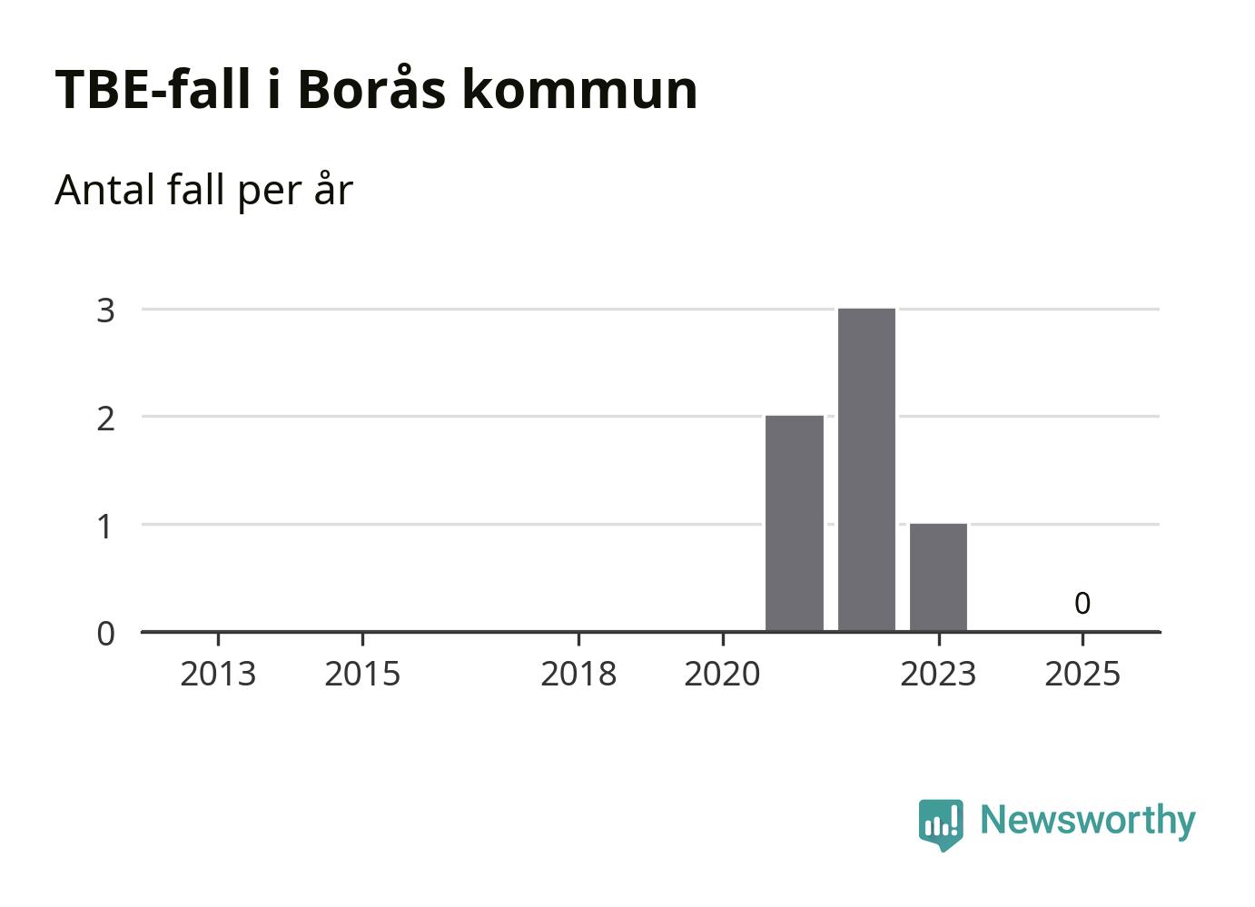 Inget TBE-fall rapporterades i Borås kommun under 2025. Inga TBE-fall har rapporterats i kommunen sedan 2023.