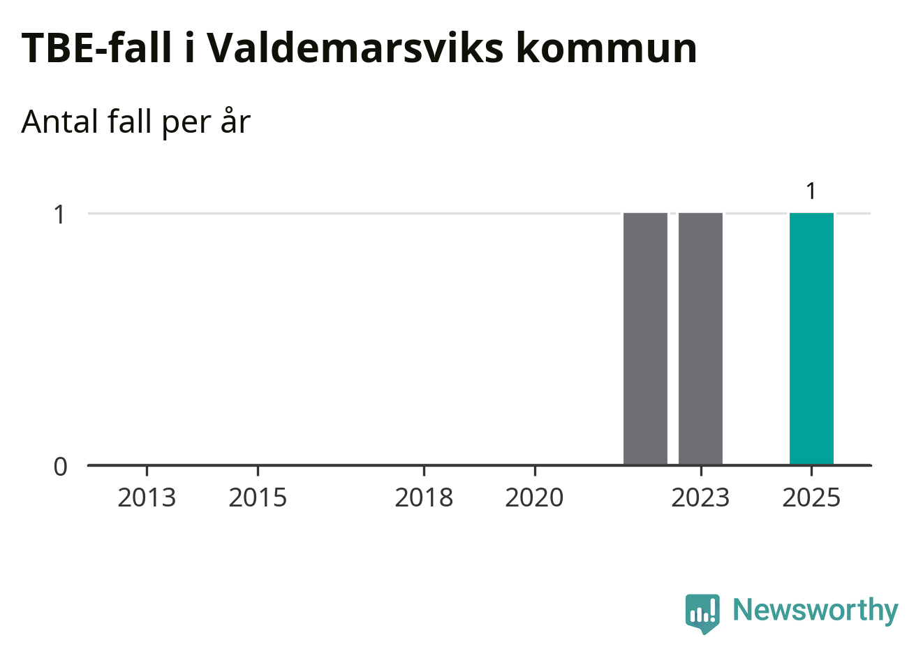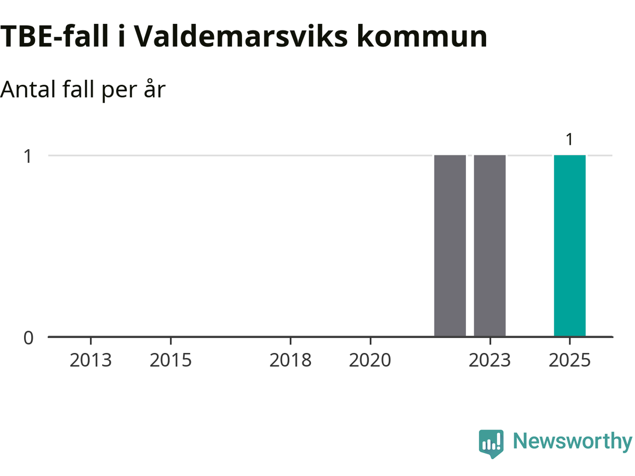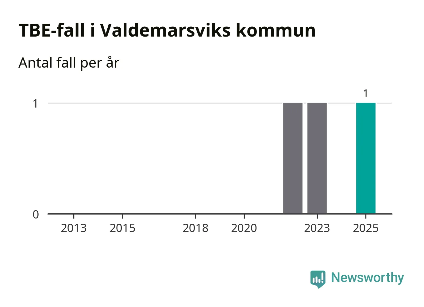 I Valdemarsviks kommun rapporterades totalt ett smittfall. Sedan 2013 har det rapporterats totalt tre fall i kommunen.