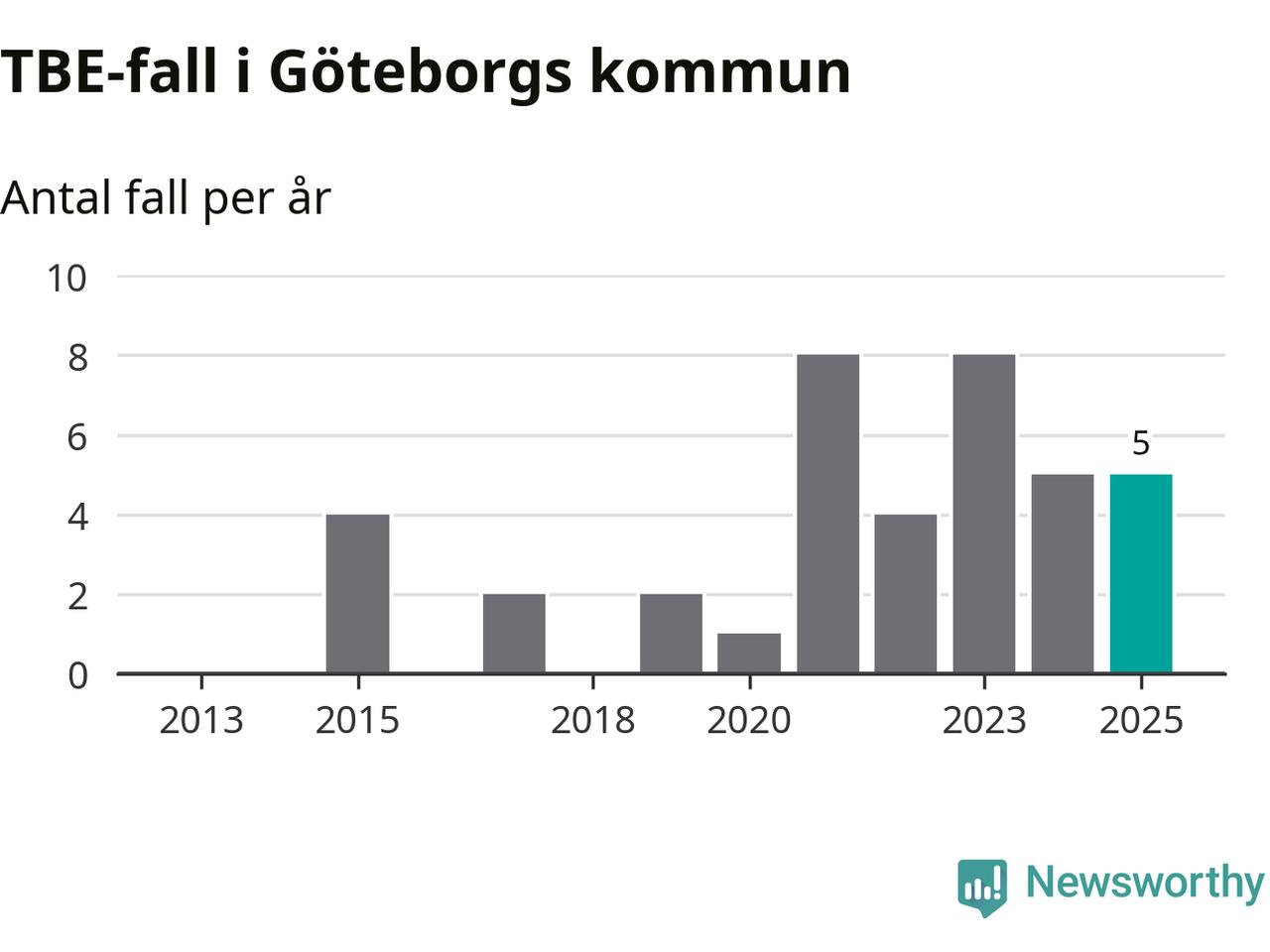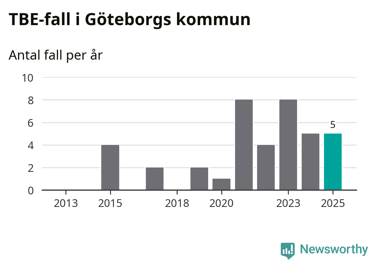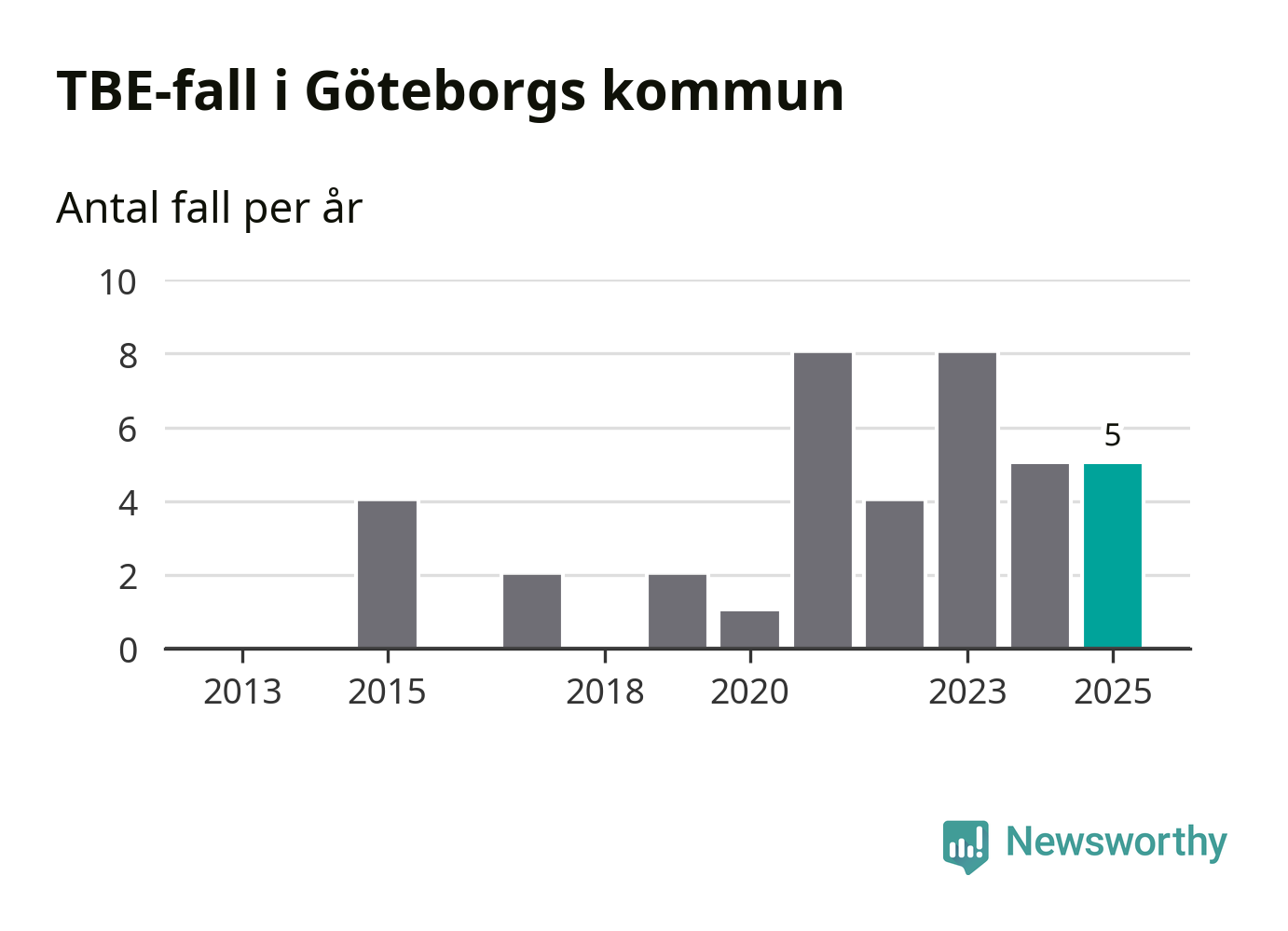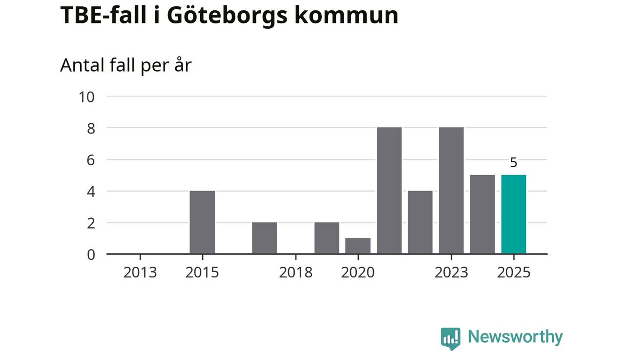 Under 2025 tillkom sju nya kommuner på den listan. Göteborgs kommun räknas till kommunerna med förhöjd förekomst av TBE. Det gör även resten av Västra Götalands län.