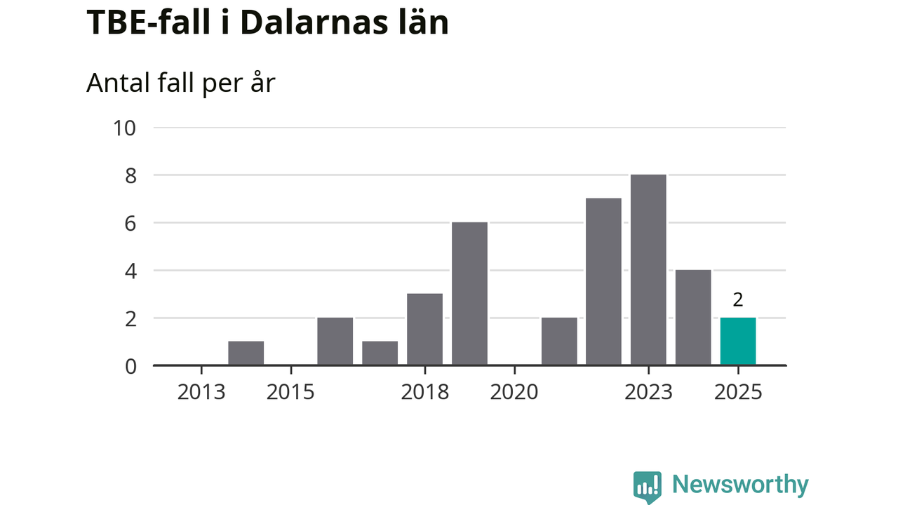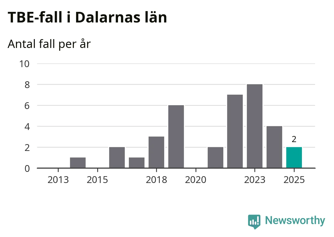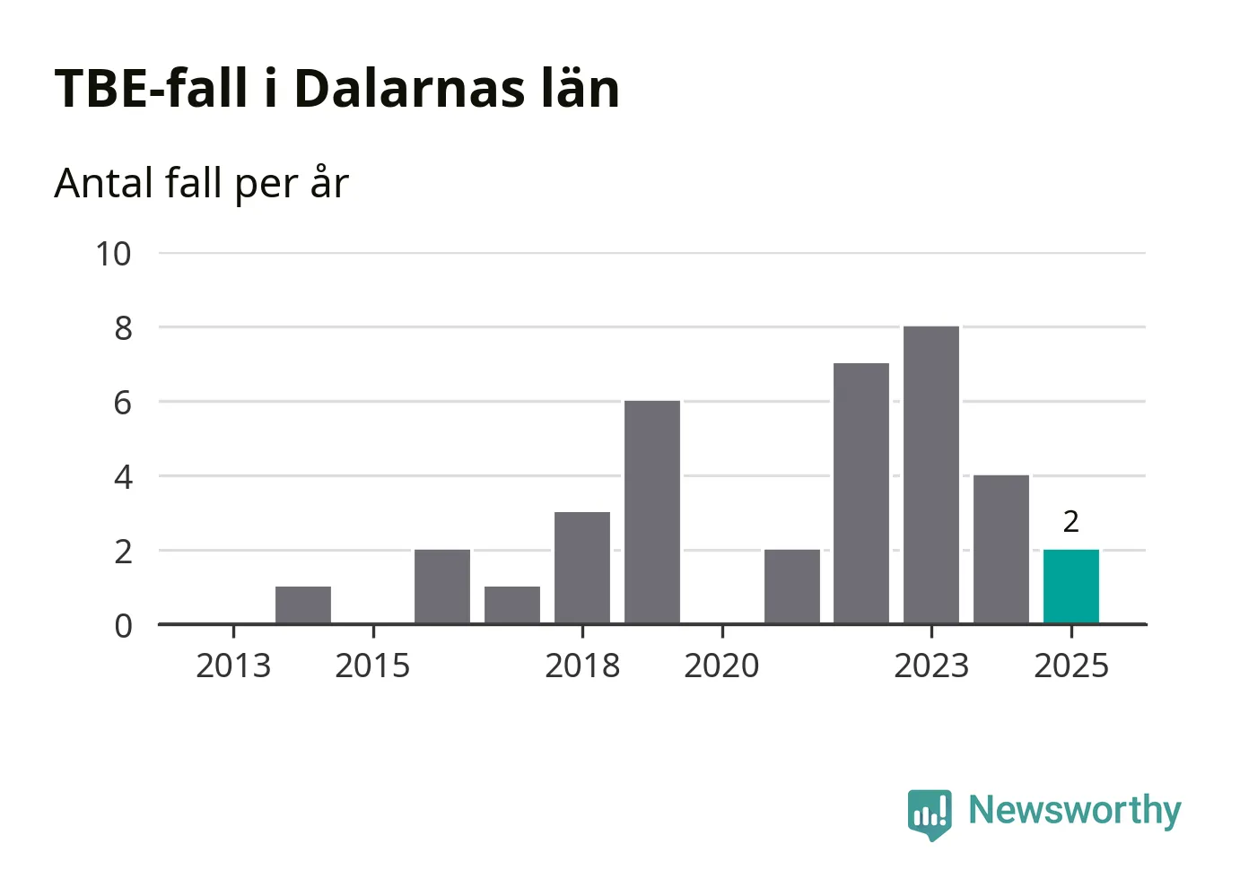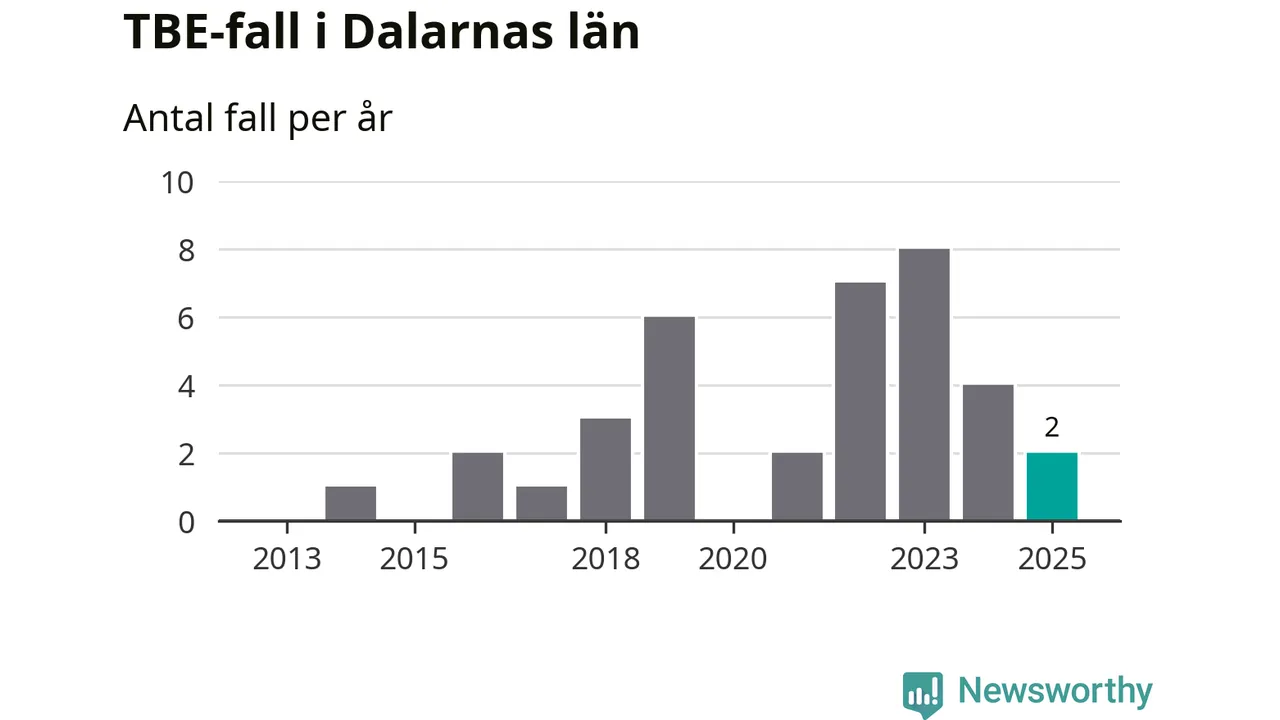 Den långsiktiga trenden är däremot tydlig. TBE-fallen blir allt fler i Sverige. Sett över tid har antalet anmälda fall i landet som helhet ökat med drygt sex procent per år sedan 2013. Totalt motsvarar det en ökning på 141 procent om vi jämför 2013 med 2025 års siffror.