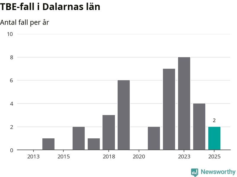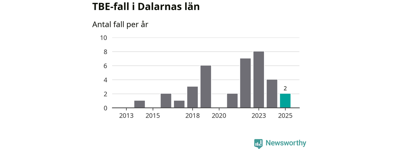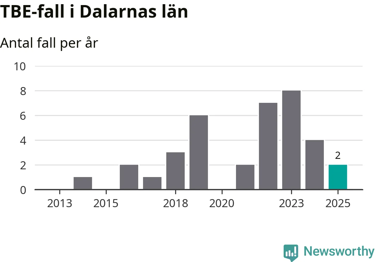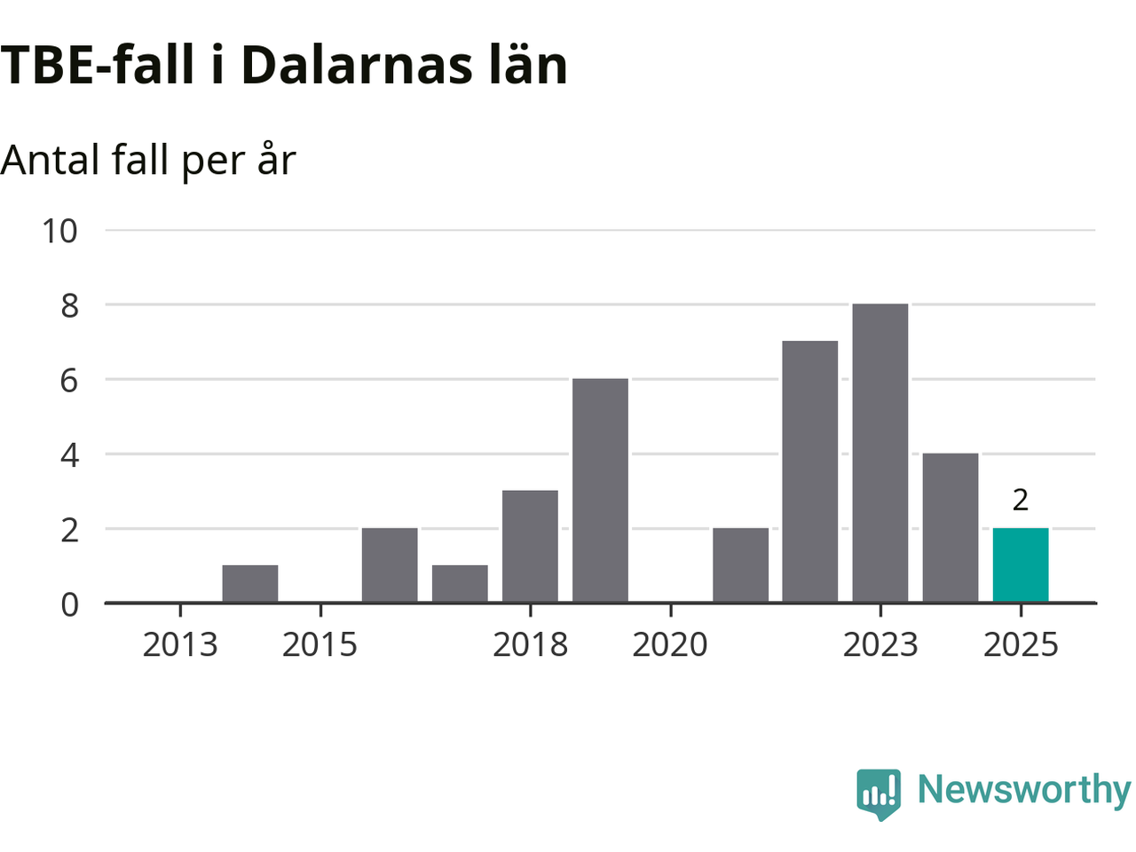 Den långsiktiga trenden är däremot tydlig. TBE-fallen blir allt fler i Sverige. Sett över tid har antalet anmälda fall i landet som helhet ökat med drygt sex procent per år sedan 2013. Totalt motsvarar det en ökning på 141 procent om vi jämför 2013 med 2025 års siffror.