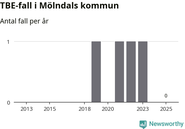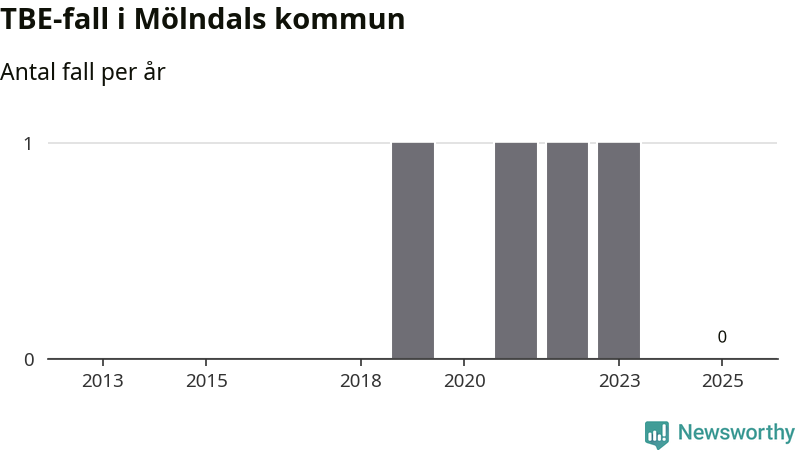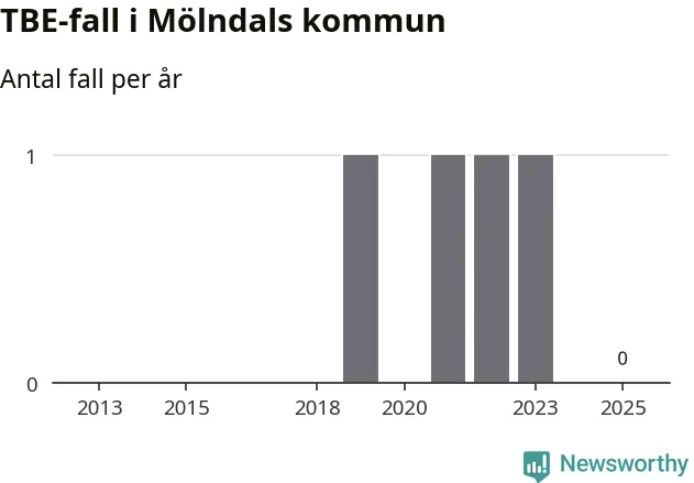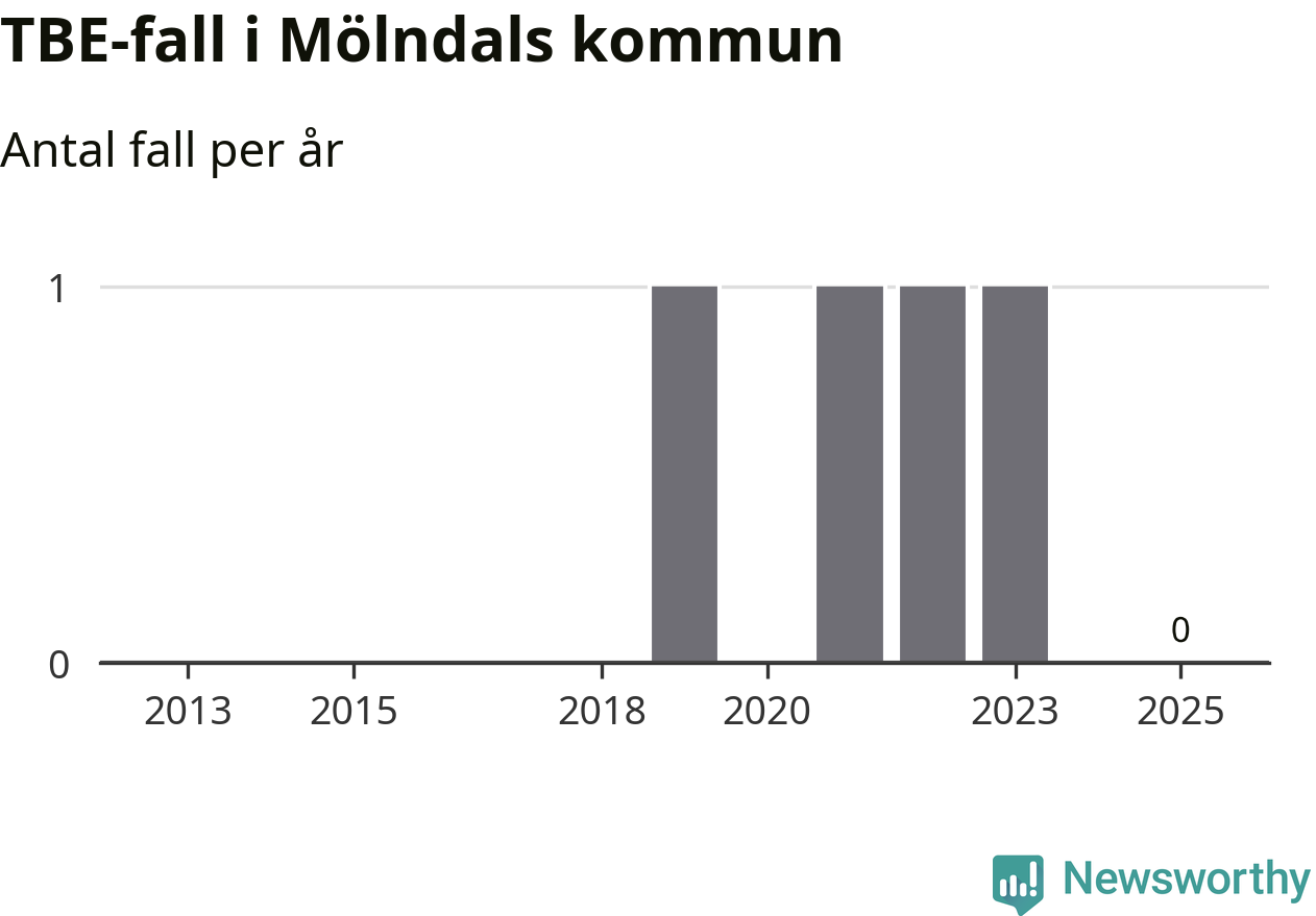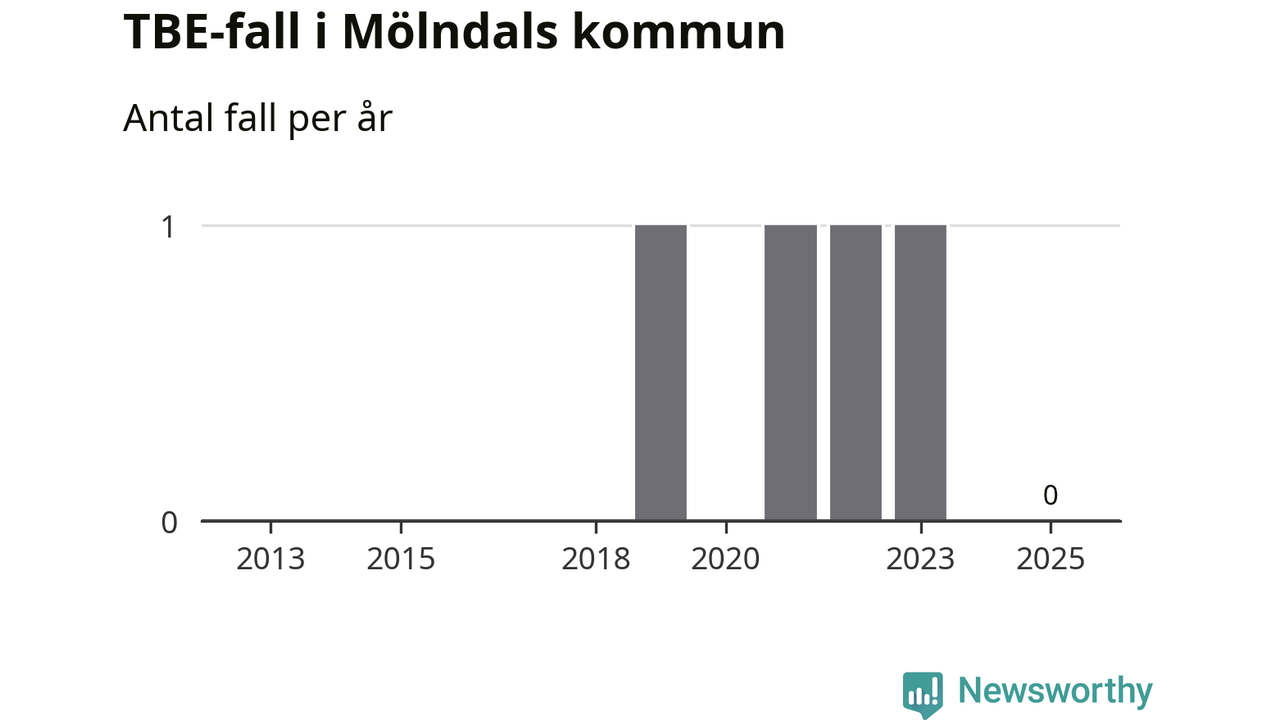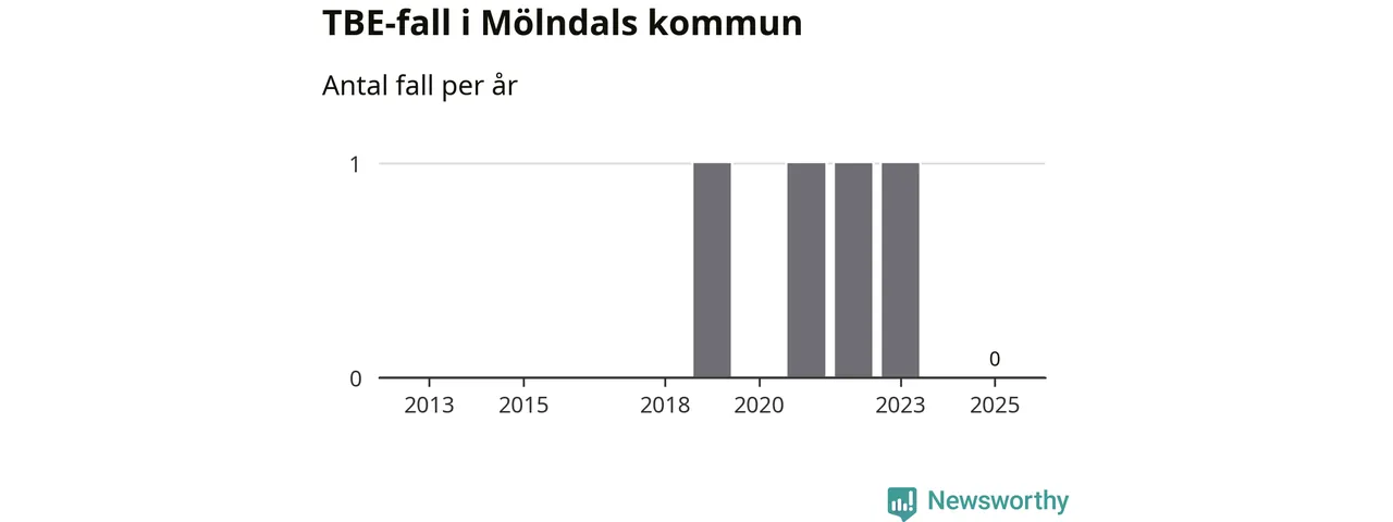 Inget TBE-fall rapporterades i Mölndals kommun under 2025. Inga TBE-fall har rapporterats i kommunen sedan 2023.