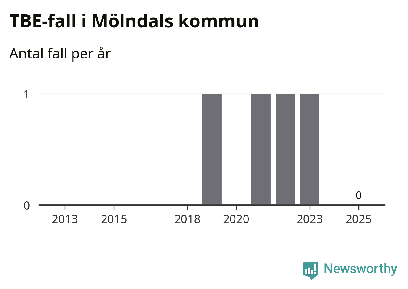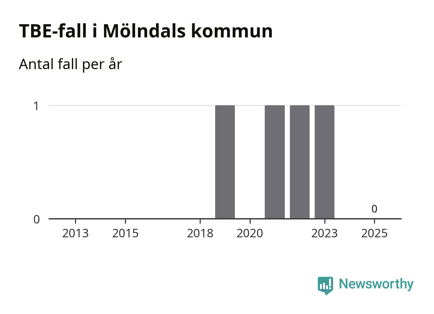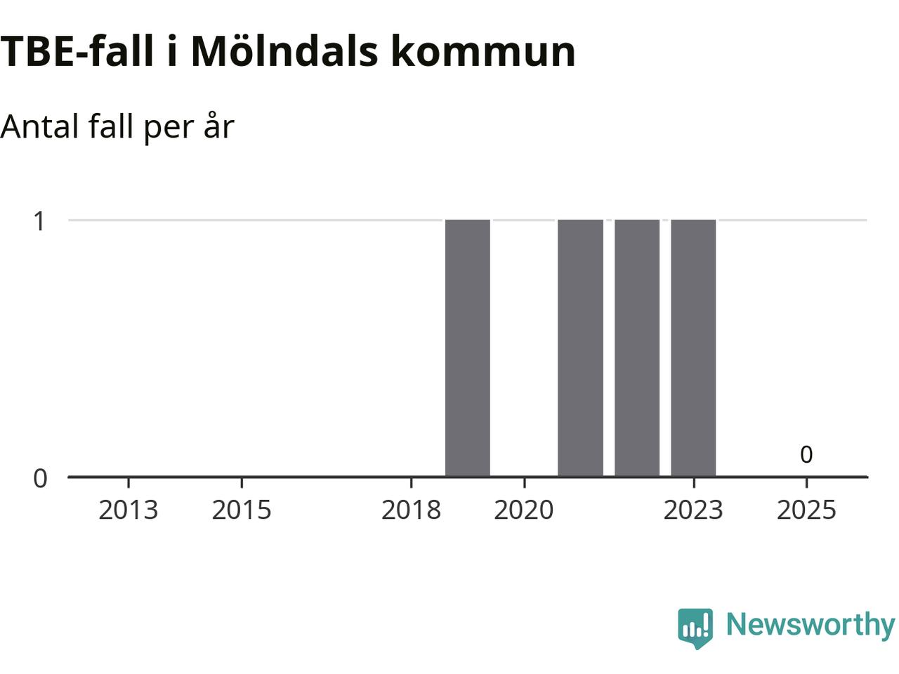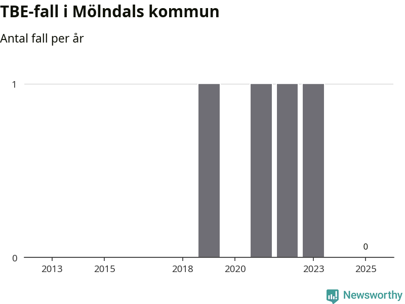 Inget TBE-fall rapporterades i Mölndals kommun under 2025. Inga TBE-fall har rapporterats i kommunen sedan 2023.