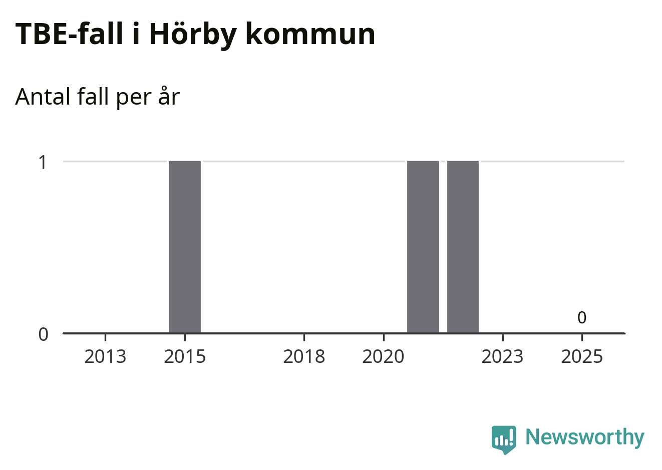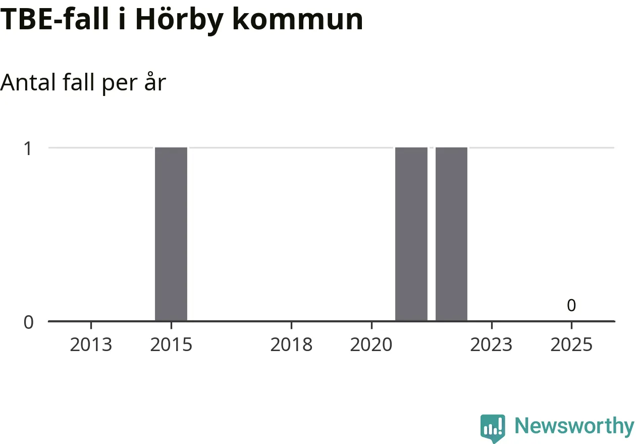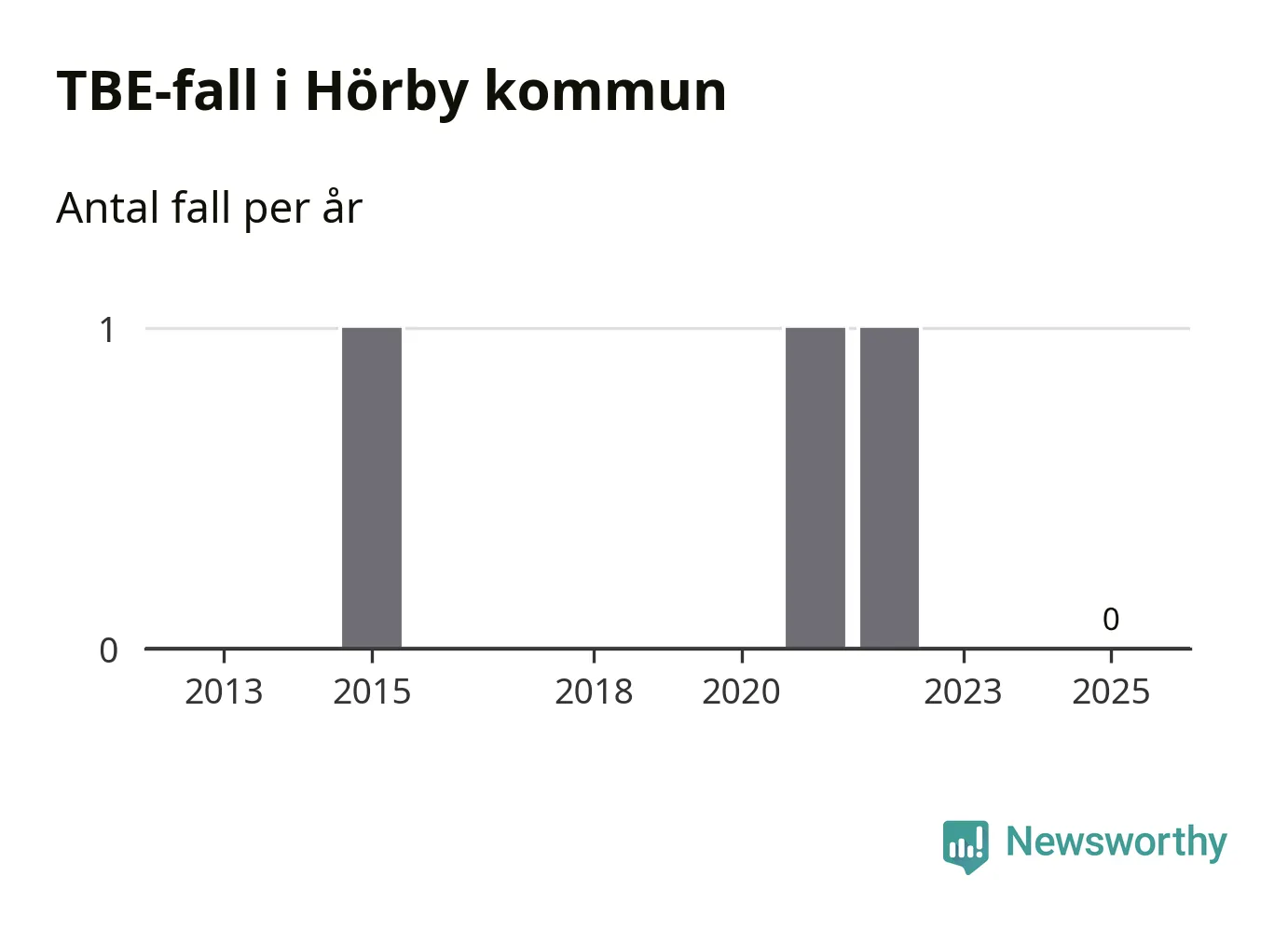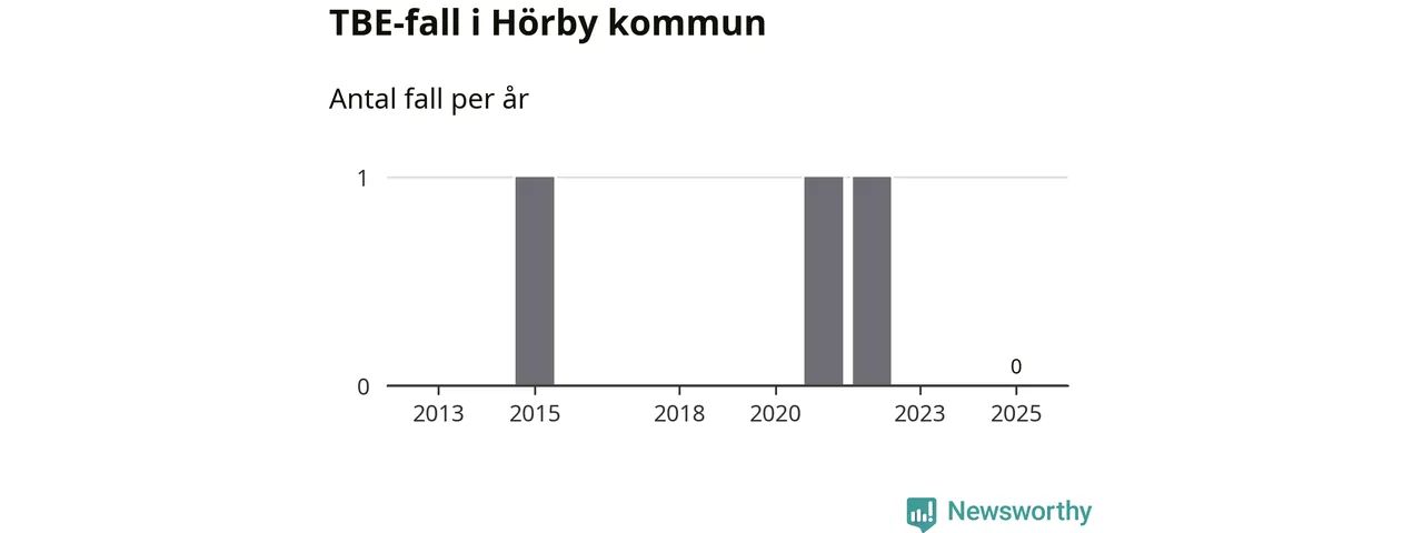 Inget TBE-fall rapporterades i Hörby kommun under 2025. Inga TBE-fall har rapporterats i kommunen sedan 2022.