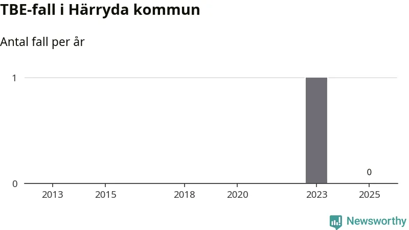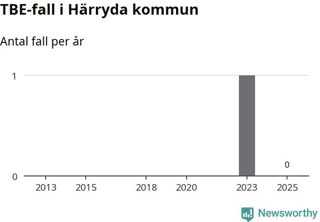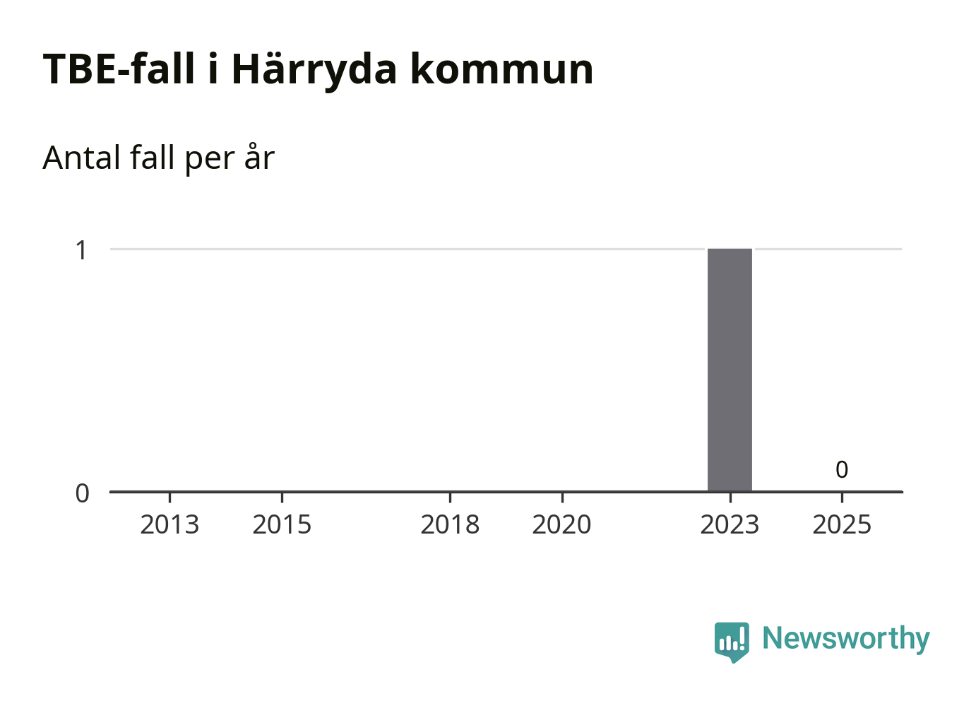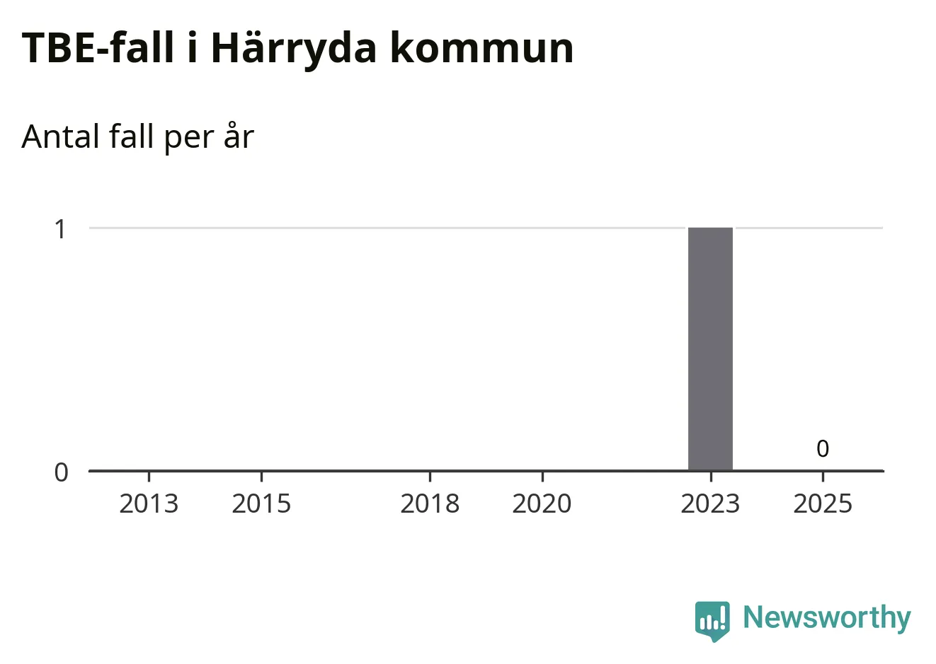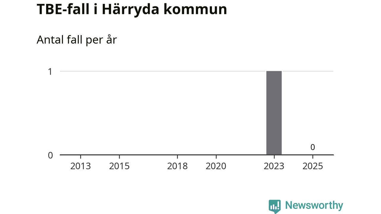 Inget TBE-fall rapporterades i Härryda kommun under 2025. Inga TBE-fall har rapporterats i kommunen sedan 2023.