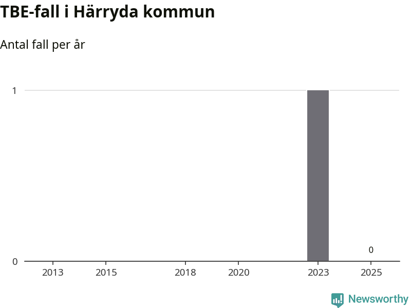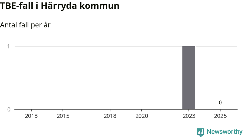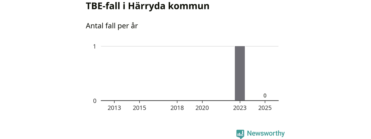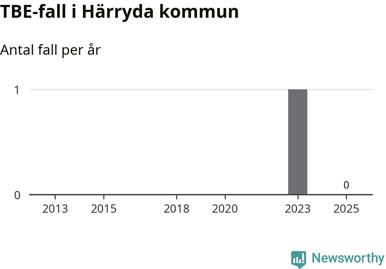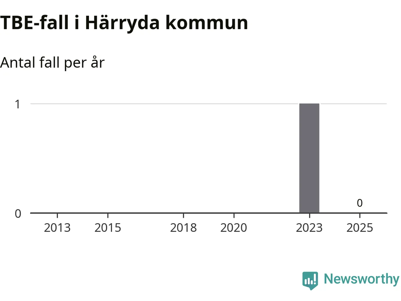 Inget TBE-fall rapporterades i Härryda kommun under 2025. Inga TBE-fall har rapporterats i kommunen sedan 2023.