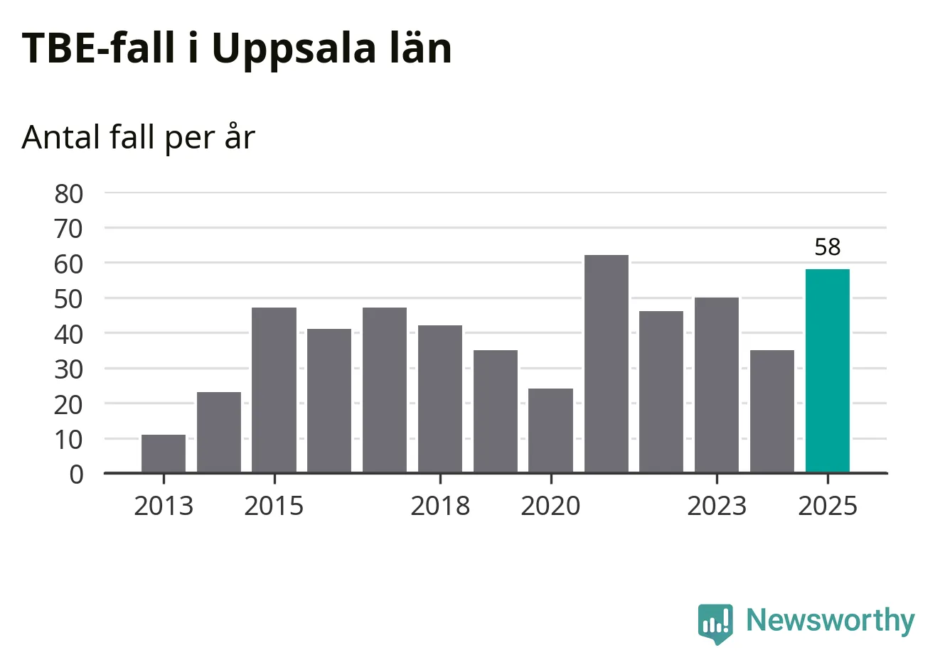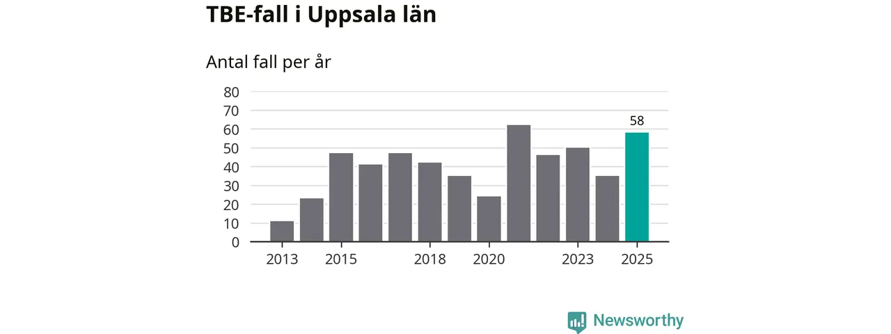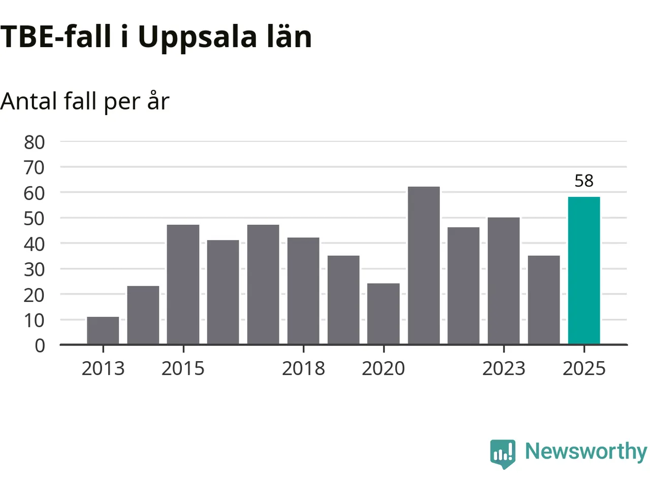Den långsiktiga trenden är däremot tydlig. TBE-fallen blir allt fler i Sverige. Sett över tid har antalet anmälda fall i landet som helhet ökat med drygt sex procent per år sedan 2013. Totalt motsvarar det en ökning på 141 procent om vi jämför 2013 med 2025 års siffror.