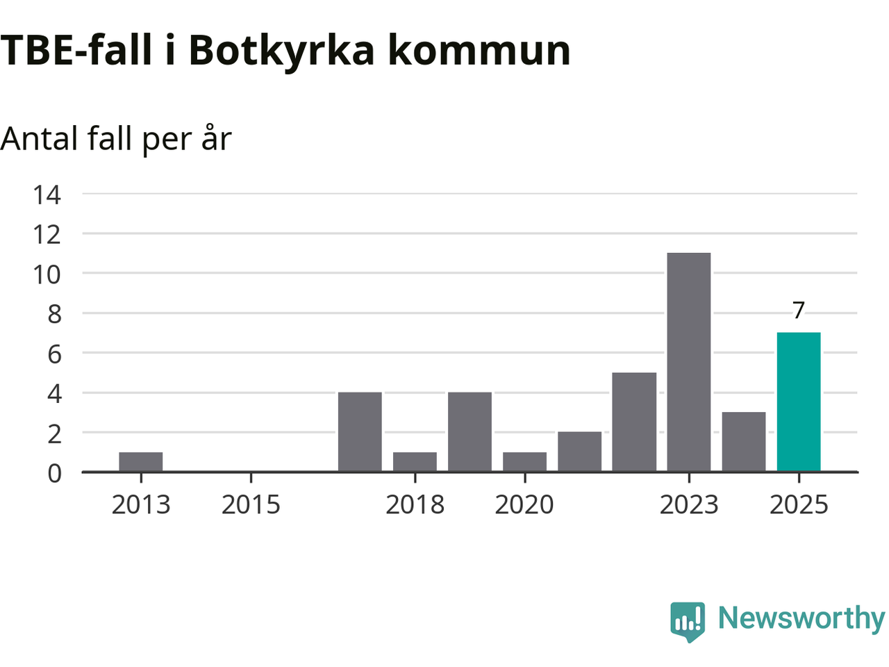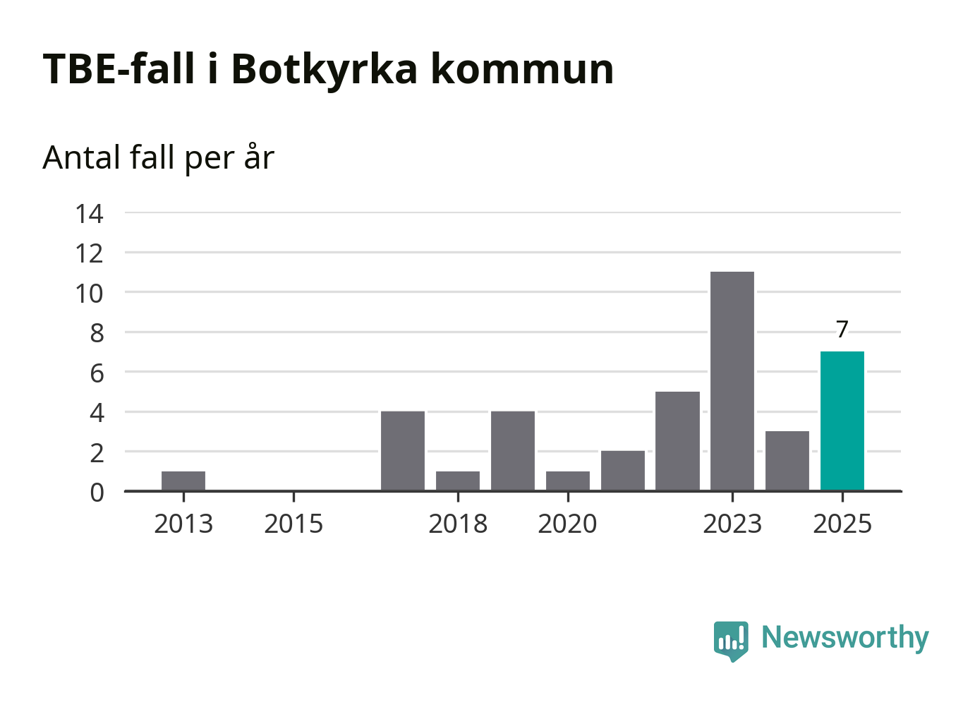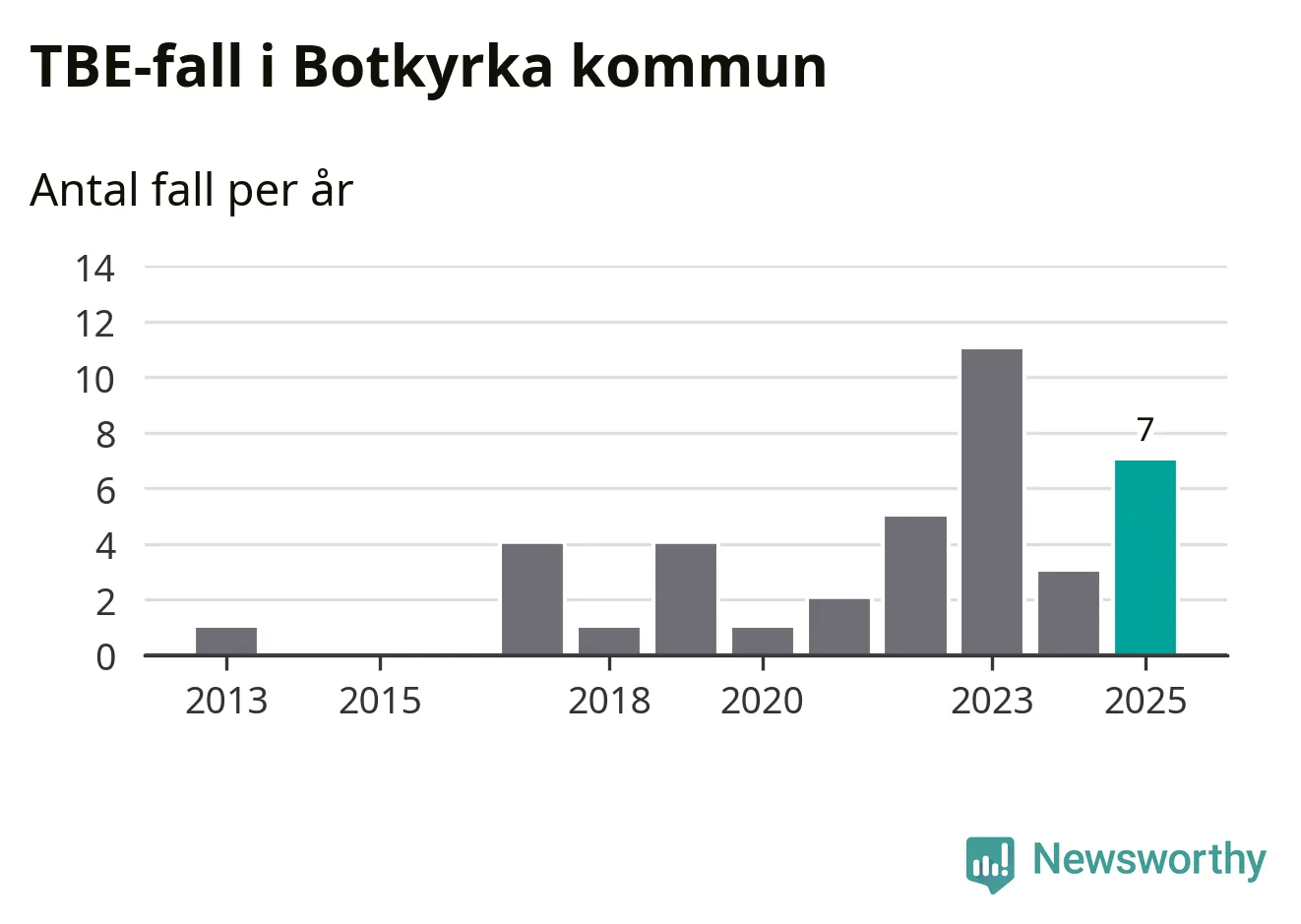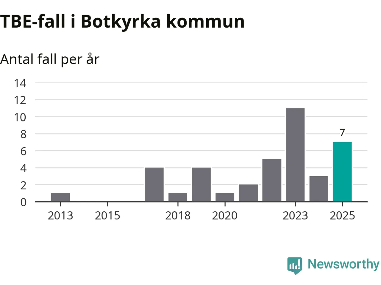 Den långsiktiga trenden är däremot tydlig. TBE-fallen blir allt fler i Sverige. Sett över tid har antalet anmälda fall i landet som helhet ökat med drygt sex procent per år sedan 2013. Totalt motsvarar det en ökning på 141 procent om vi jämför 2013 med 2025 års siffror.
