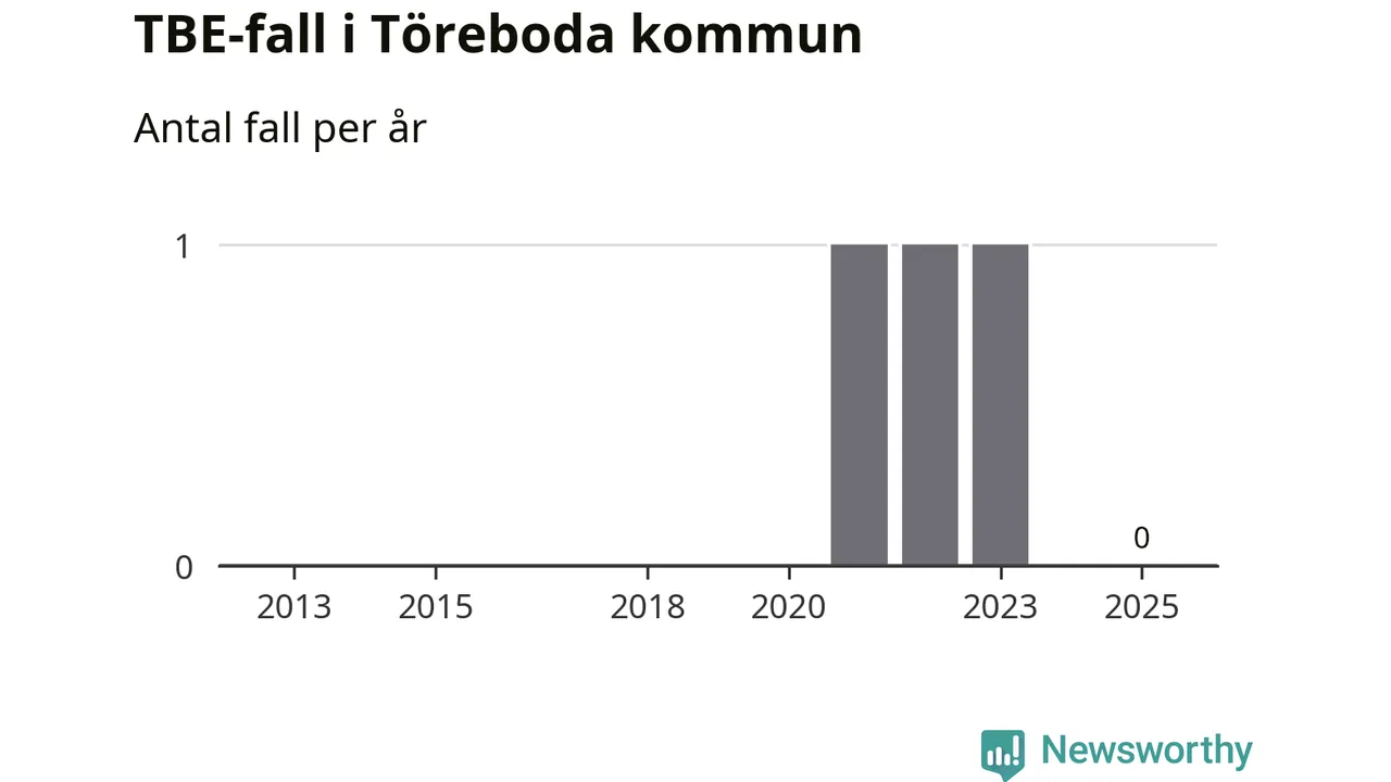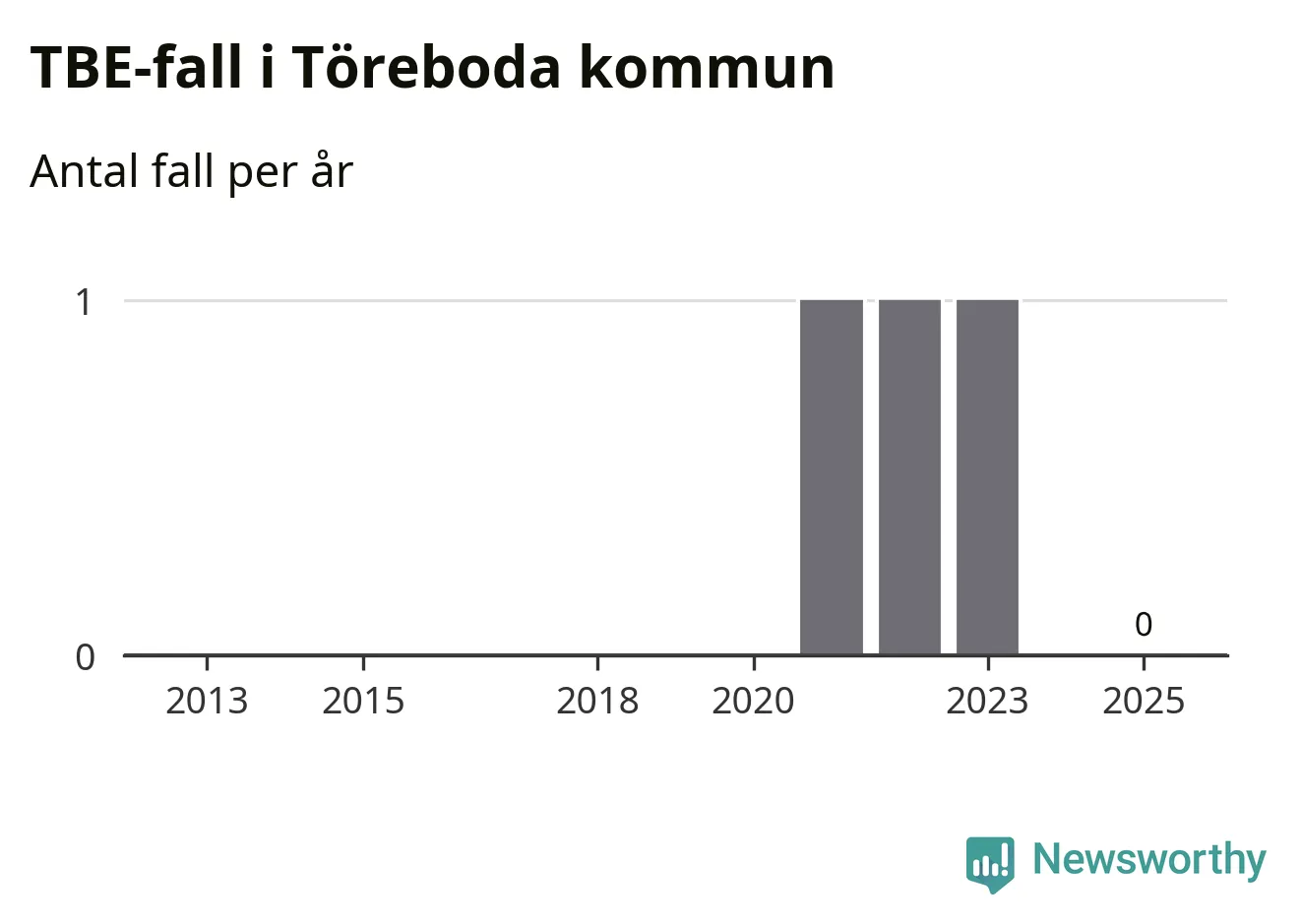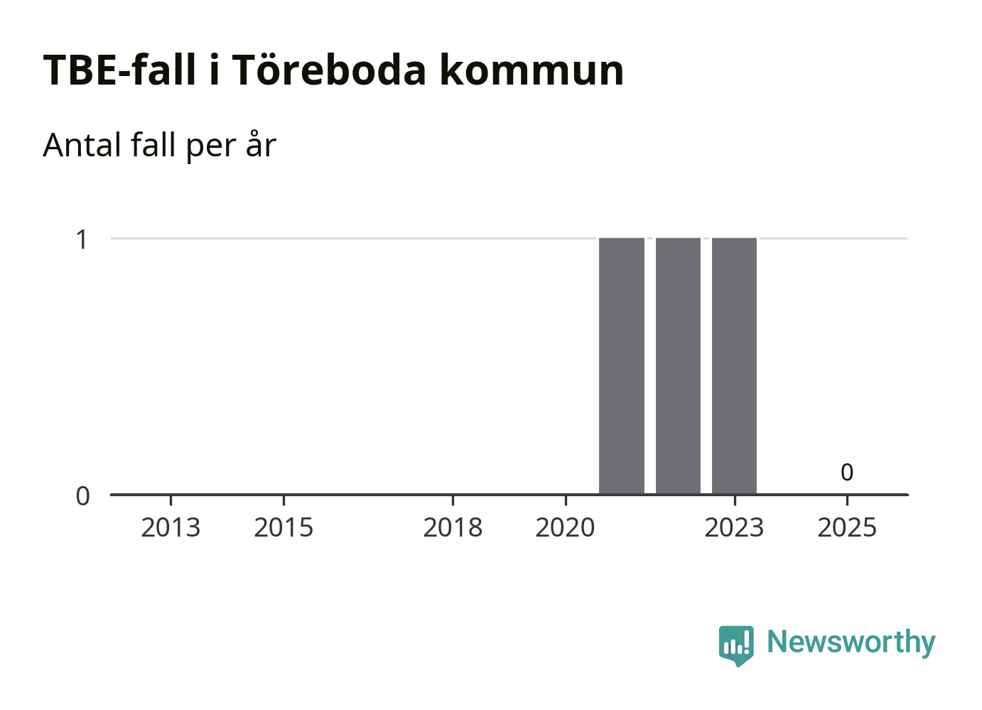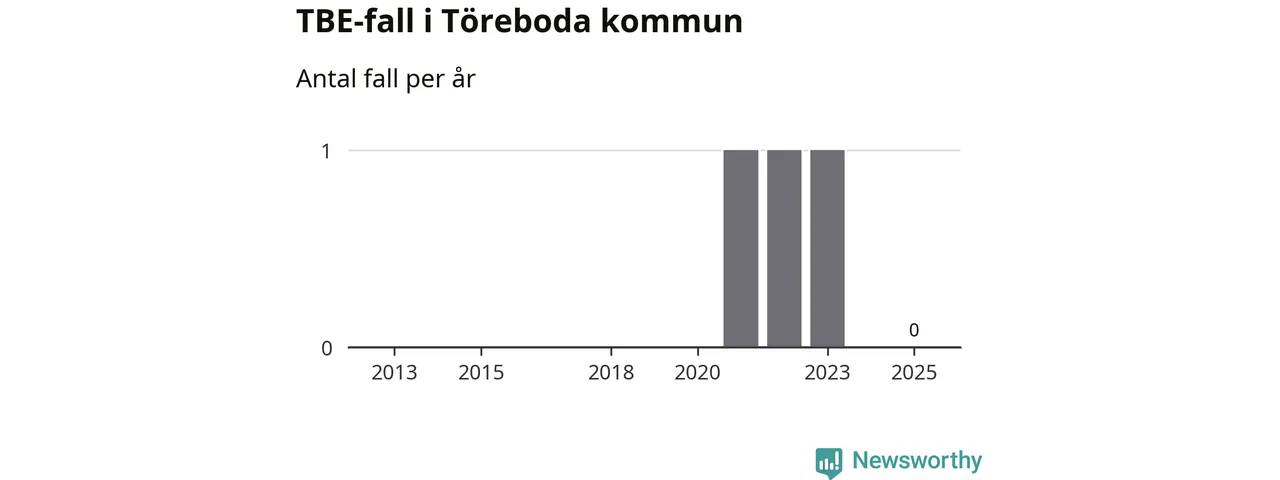 Inget TBE-fall rapporterades i Töreboda kommun under 2025. Inga TBE-fall har rapporterats i kommunen sedan 2023.