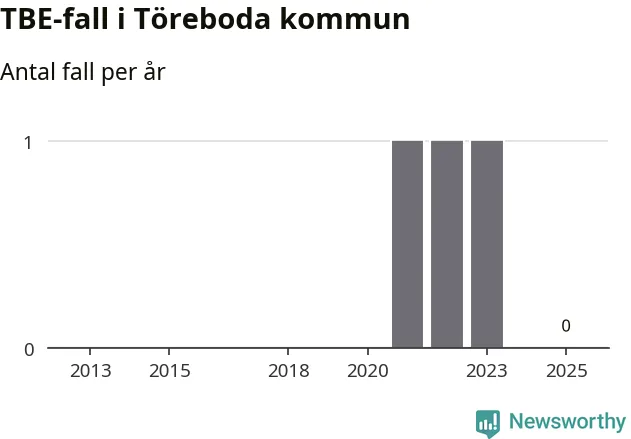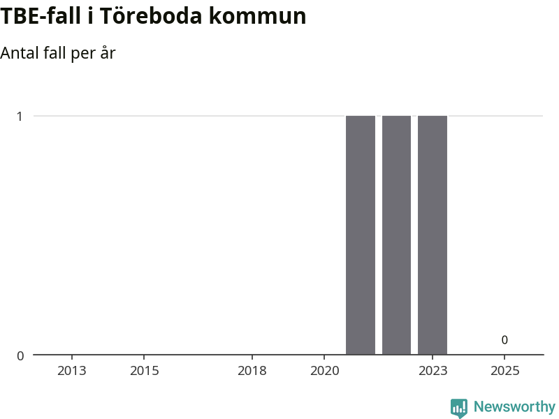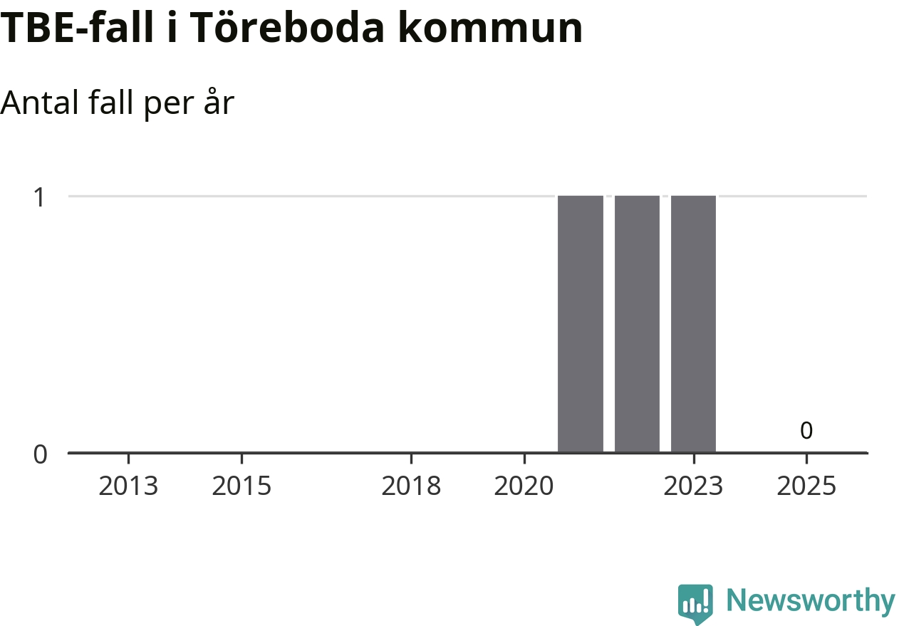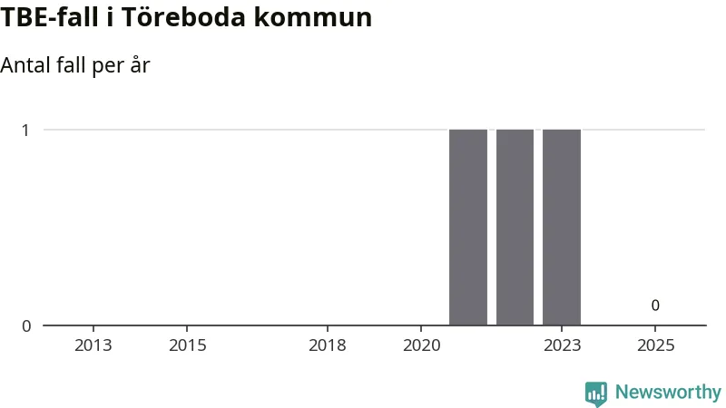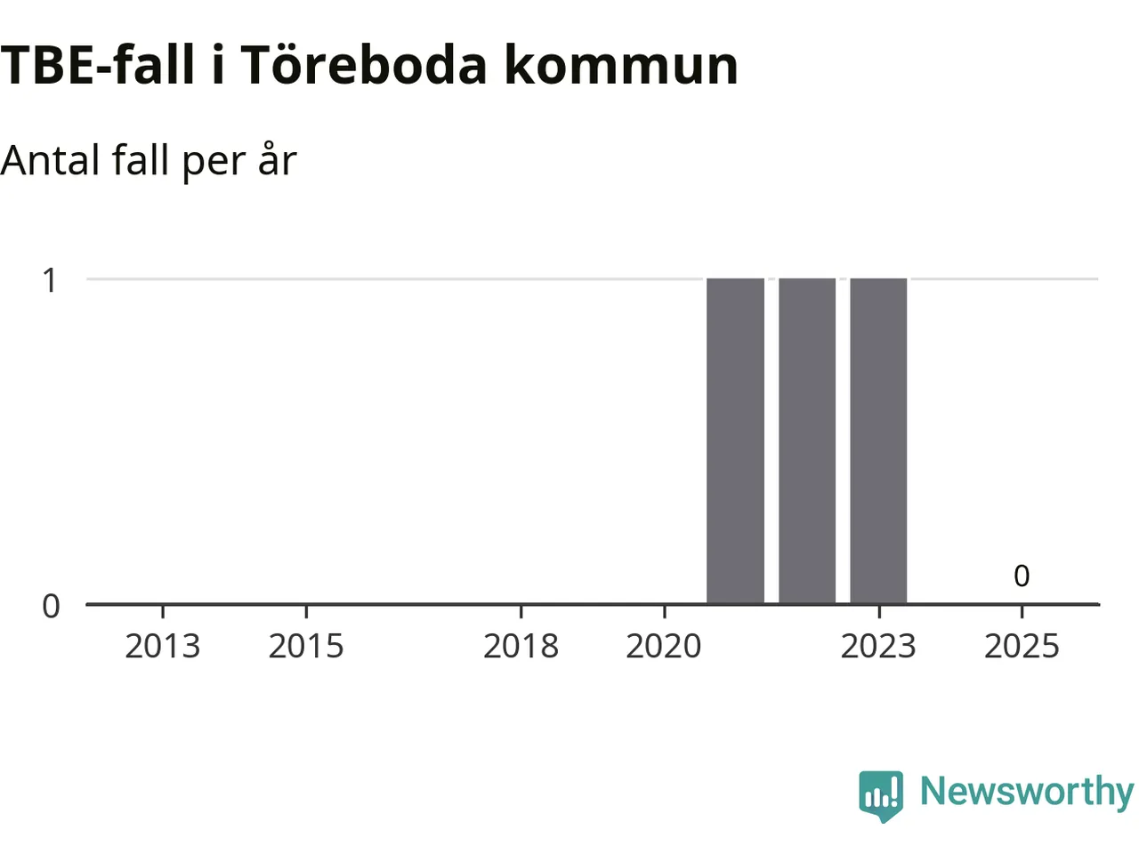 Inget TBE-fall rapporterades i Töreboda kommun under 2025. Inga TBE-fall har rapporterats i kommunen sedan 2023.