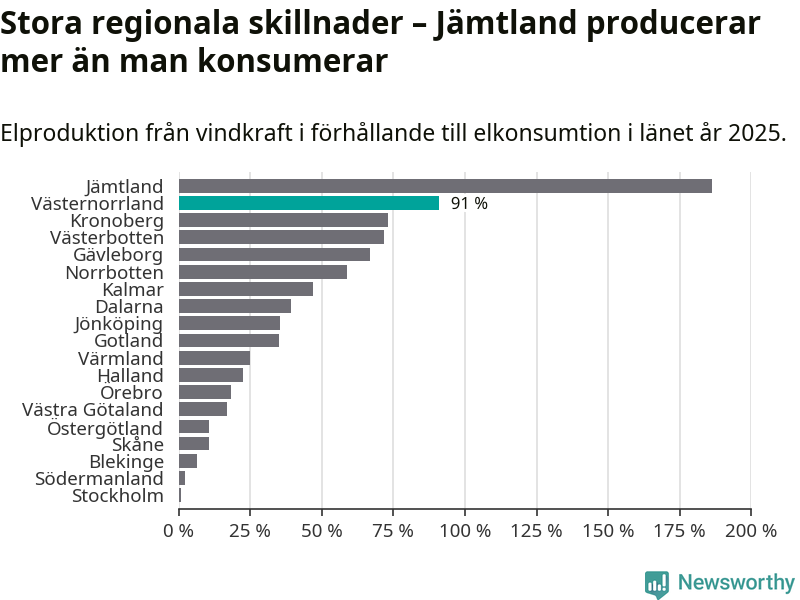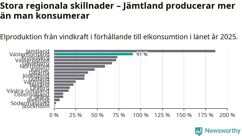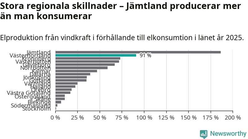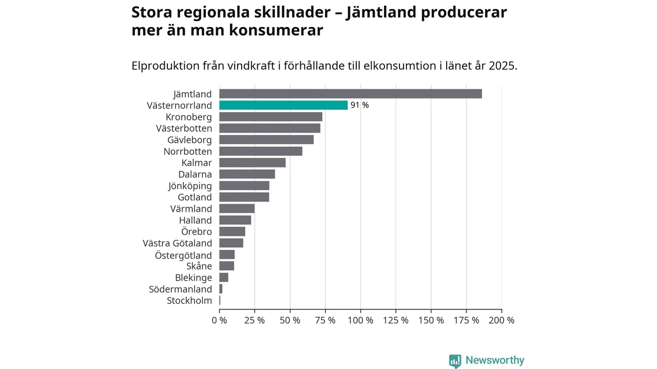 Västernorrlands län befinner sig i toppen av effektligan när det gäller totalt installerad vindkraft.
