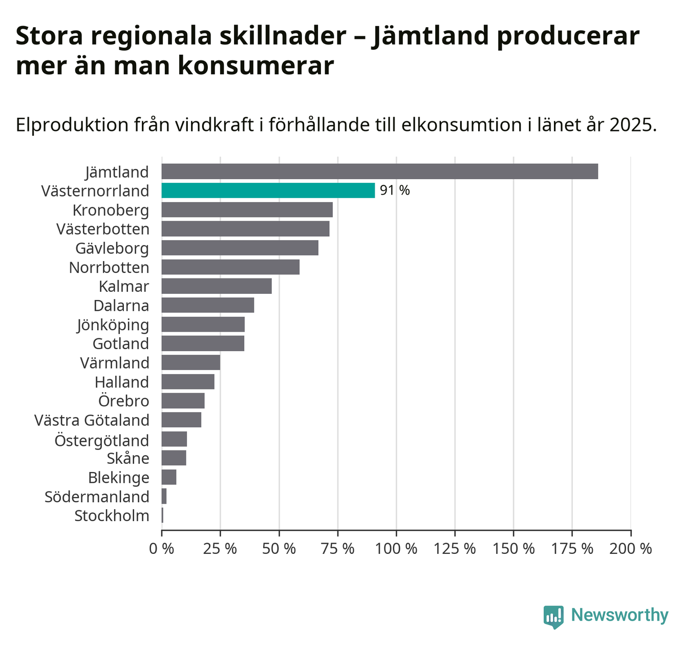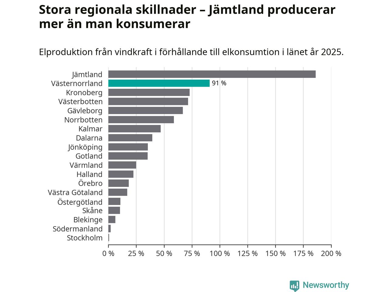 Störst installerad vindkraftseffekt bland landets län finns nu i Västernorrland, med 3 477 megawatt. Bland kommunerna i Västernorrland ligger Sollefteå kommun i topp i effektligan.