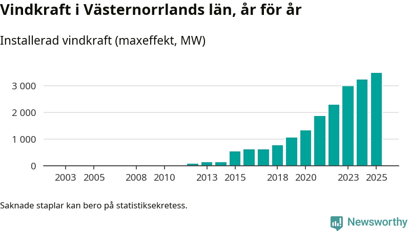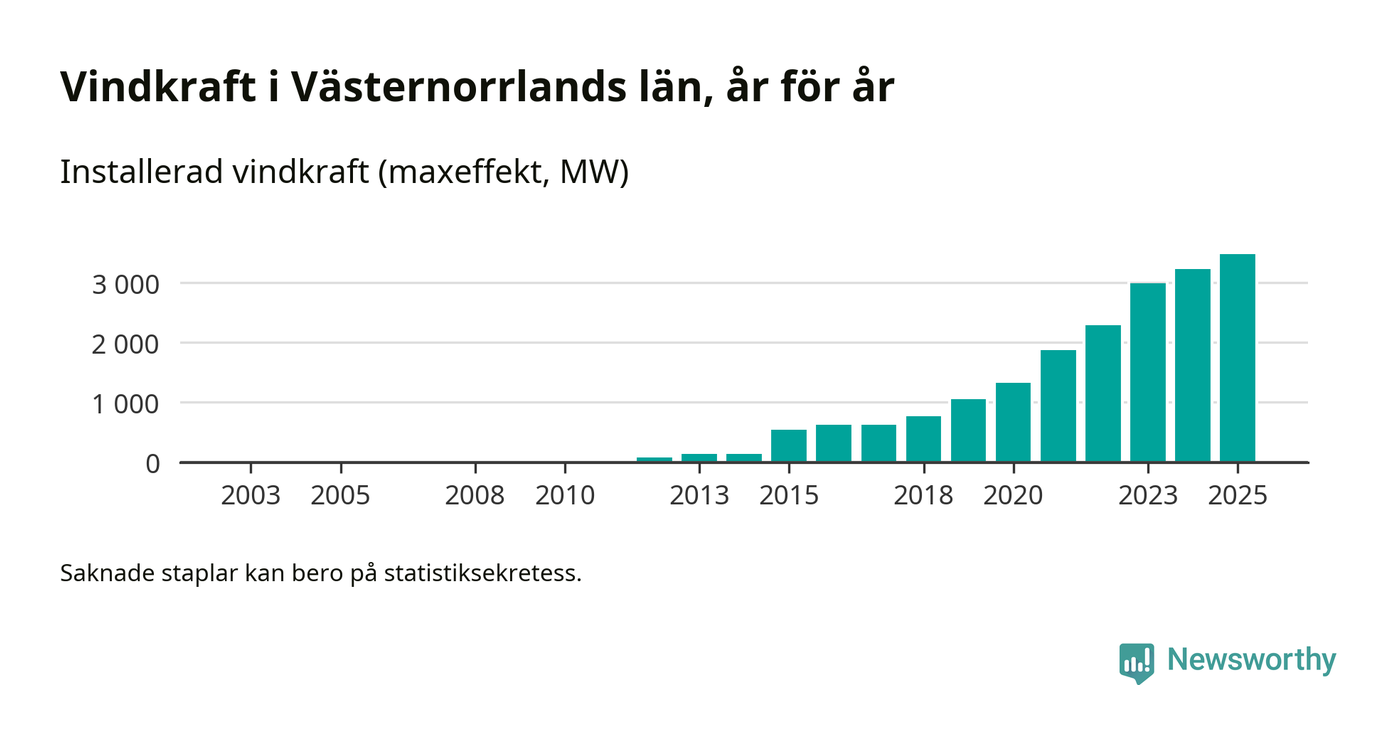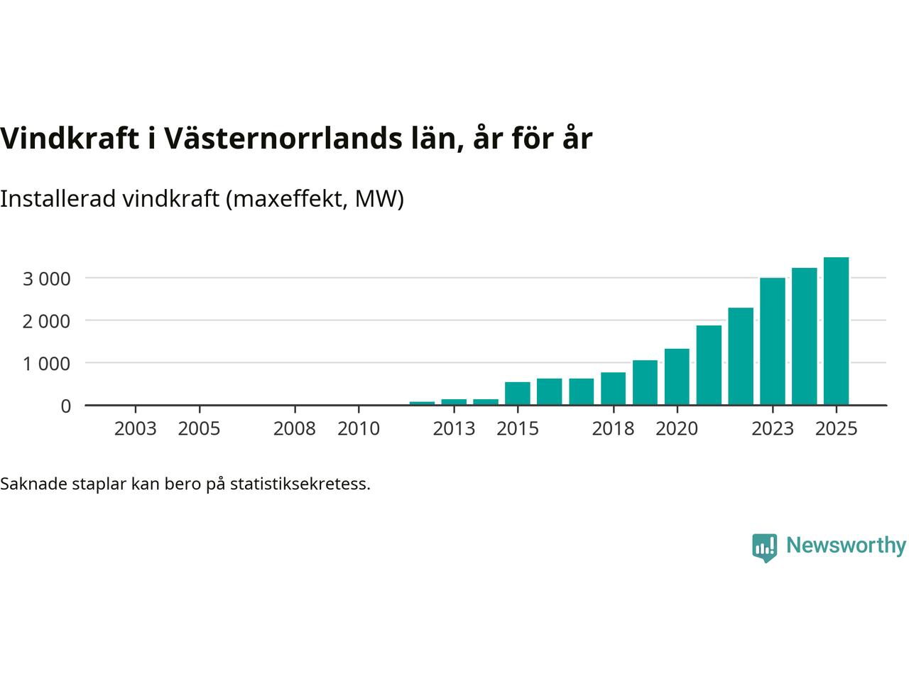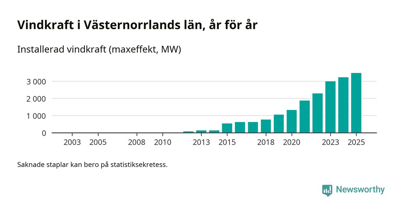 Totalt fanns i slutet av förra året 824 vindkraftverk i Västernorrlands län, med en sammanlagd maxeffekt på 3 477 megawatt. Det är en ökning med 252 megawatt, eller 8 procent, jämfört med året innan. Det visar nya siffror från Energimyndigheten.