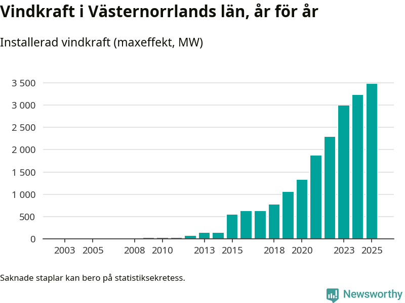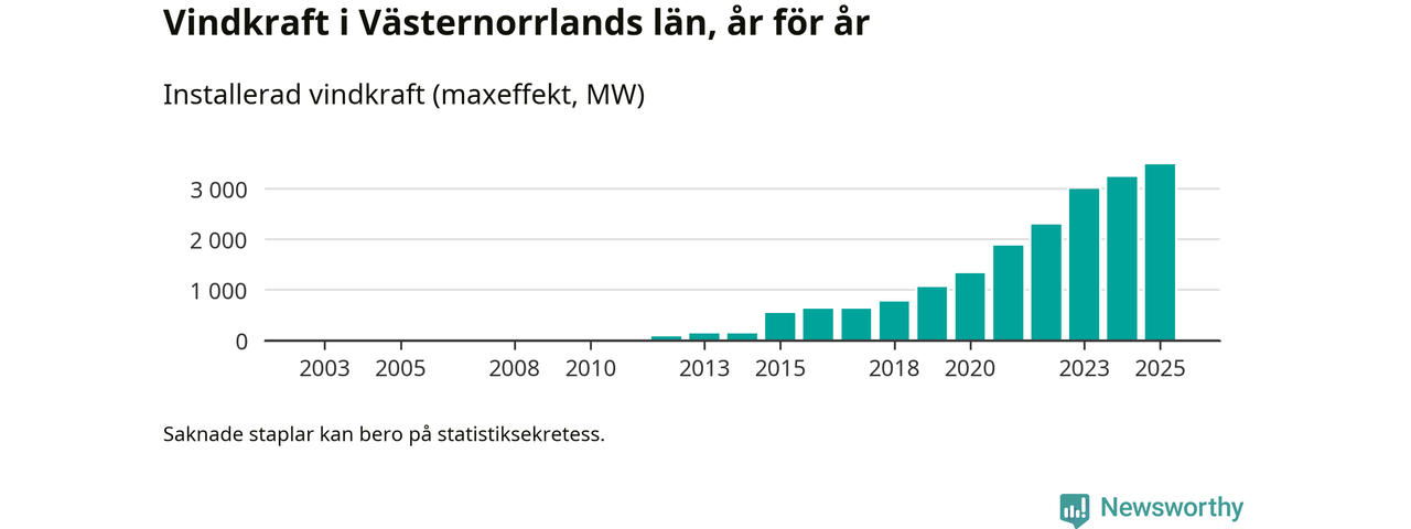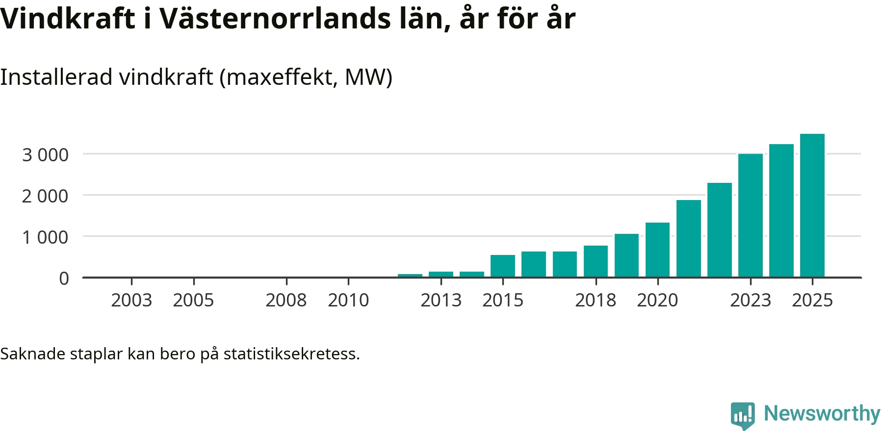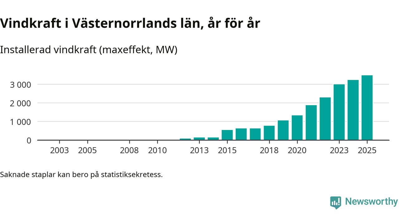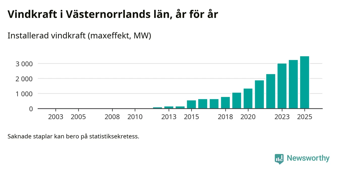 Totalt fanns i slutet av förra året 824 vindkraftverk i Västernorrlands län, med en sammanlagd maxeffekt på 3 477 megawatt. Det är en ökning med 252 megawatt, eller 8 procent, jämfört med året innan. Det visar nya siffror från Energimyndigheten.